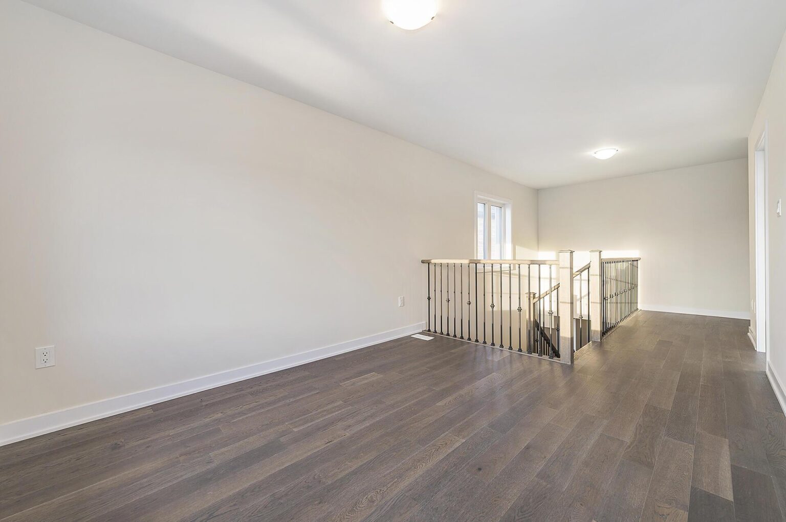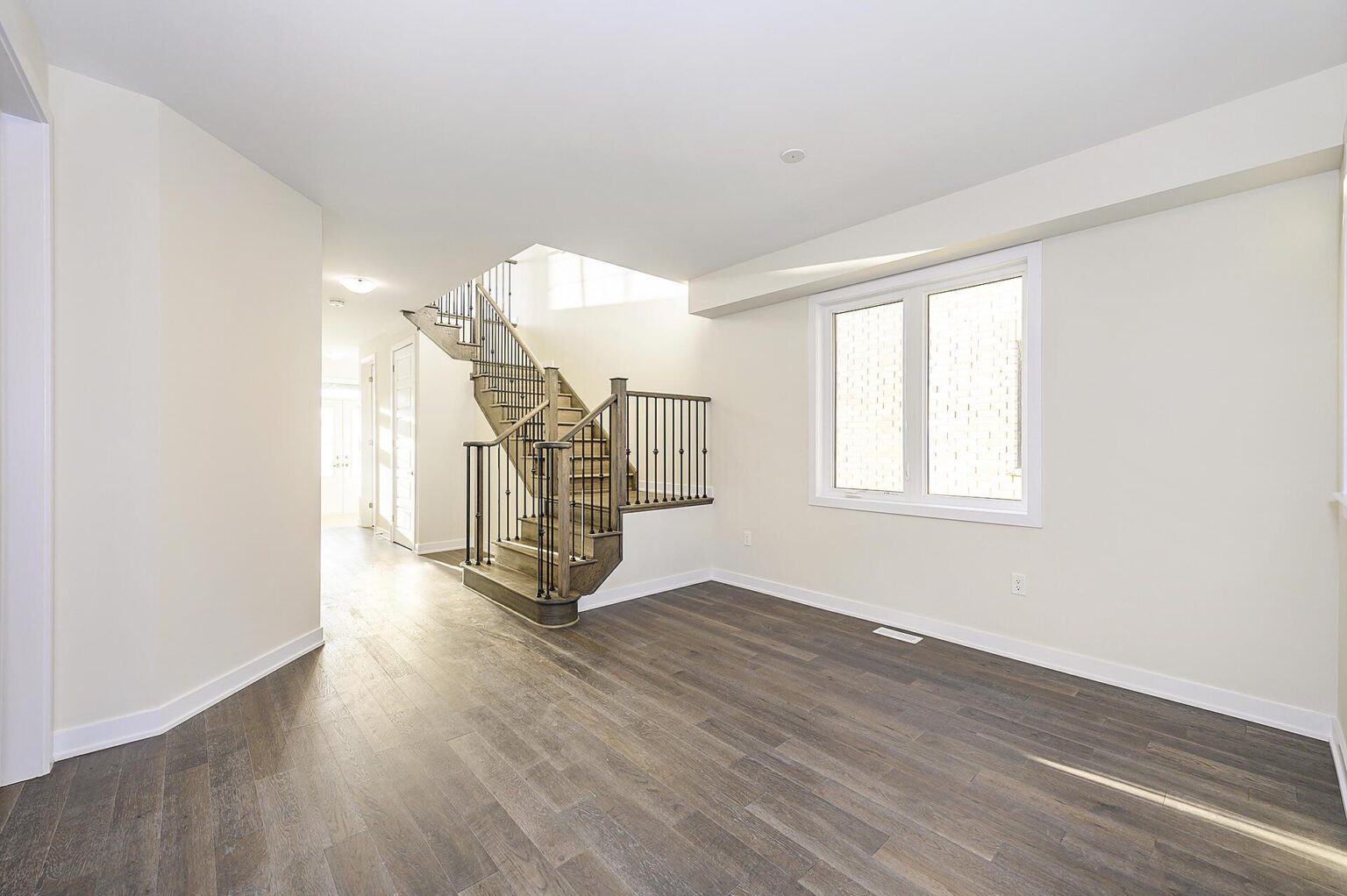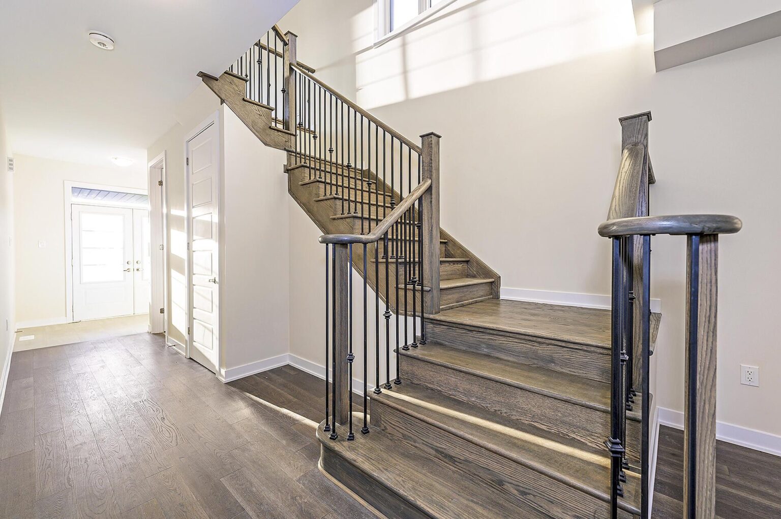 - Stained oak staircase and railings with metal pickets on staircase