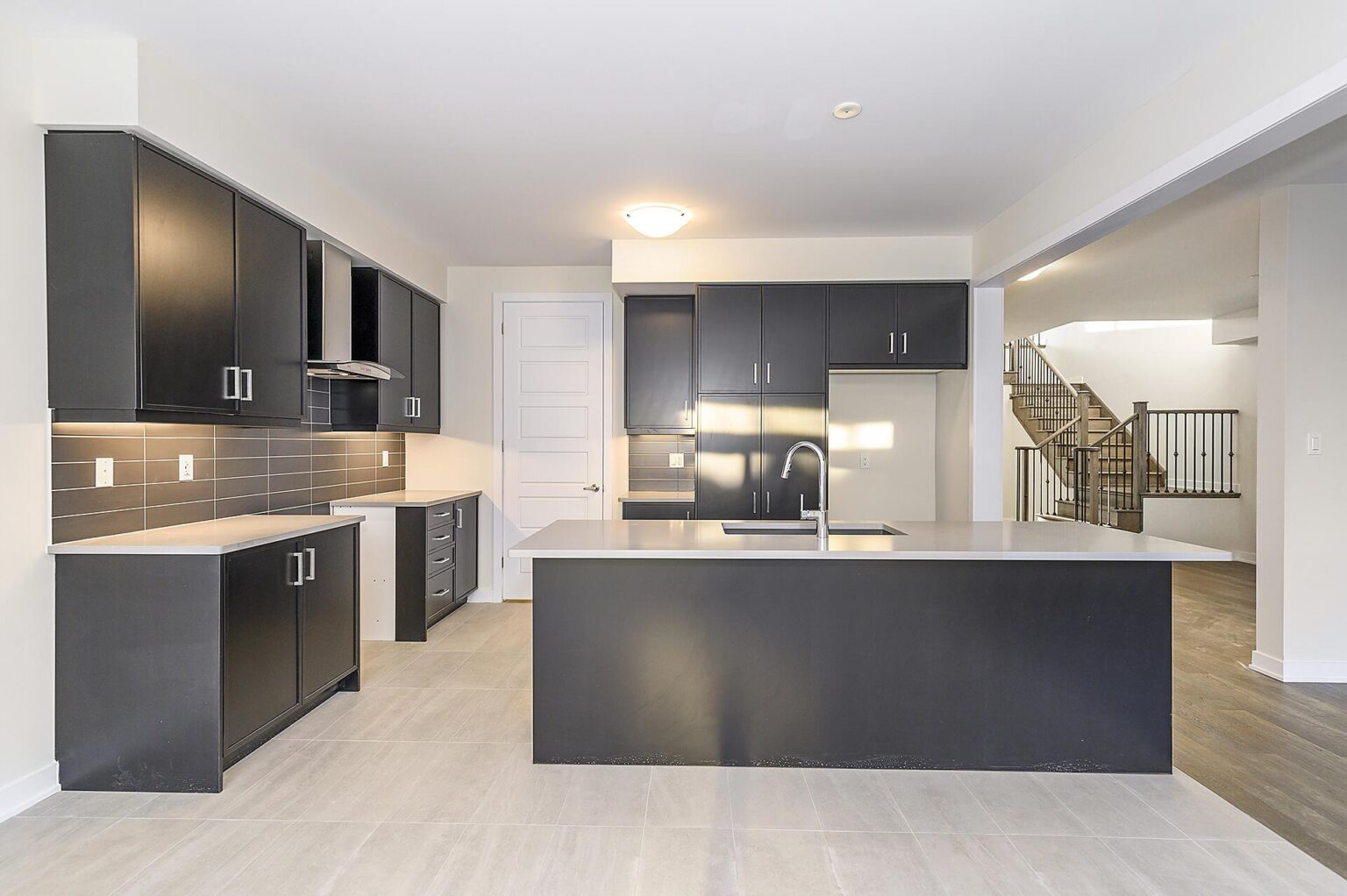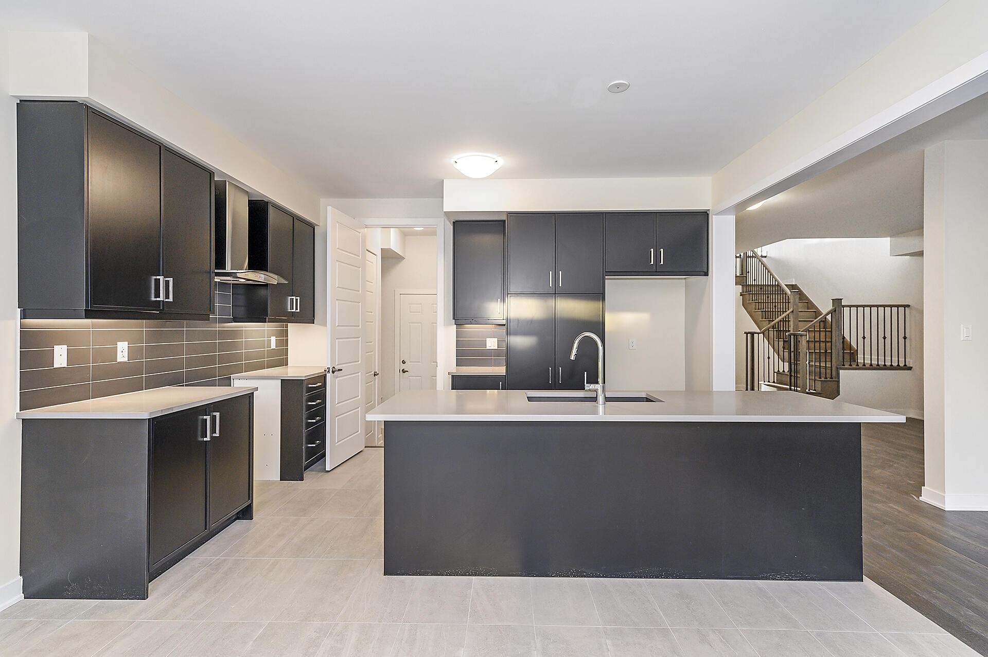 - Kitchen: Capped ceiling box above island, chimney style hood fan, water line at fridge location, cabinets and hardware with soft close, pantry, quartz countertop with undermount sink, deep uppers above fridge, under valance lighting, gas line at stove location, backsplash