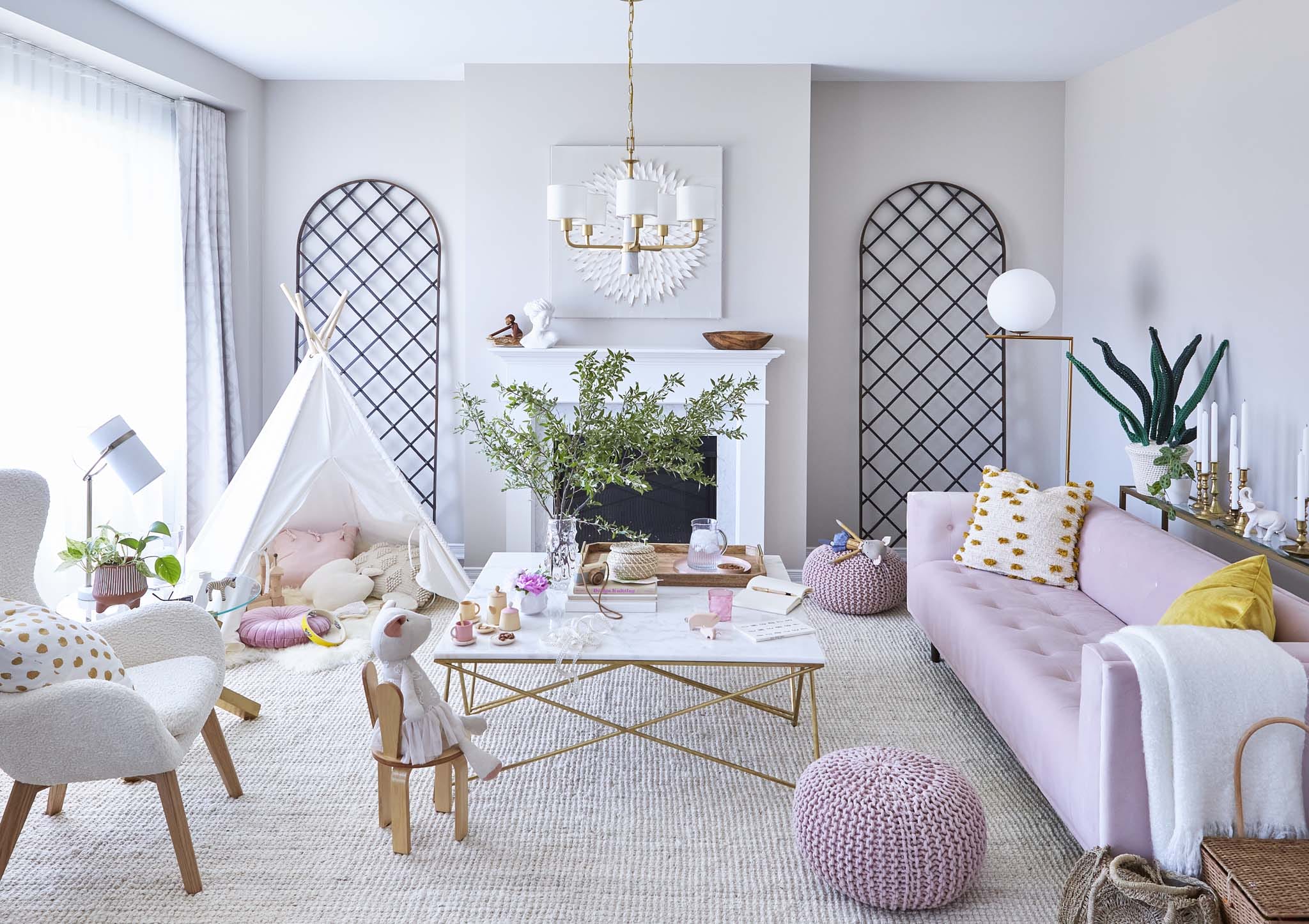 The living room is dedicated to rest and relaxation. It’s a place where you can unwind after a busy day, sip on a cup of tea and read your favourite novel, and your little one deserves a place like that too. Carve out a corner in the room and fill it with all the things that your child loves —a teepee that they can sit under, pillows that keep them cozy, stuffed animals that they can play with and story books that’ll keep them entertained.