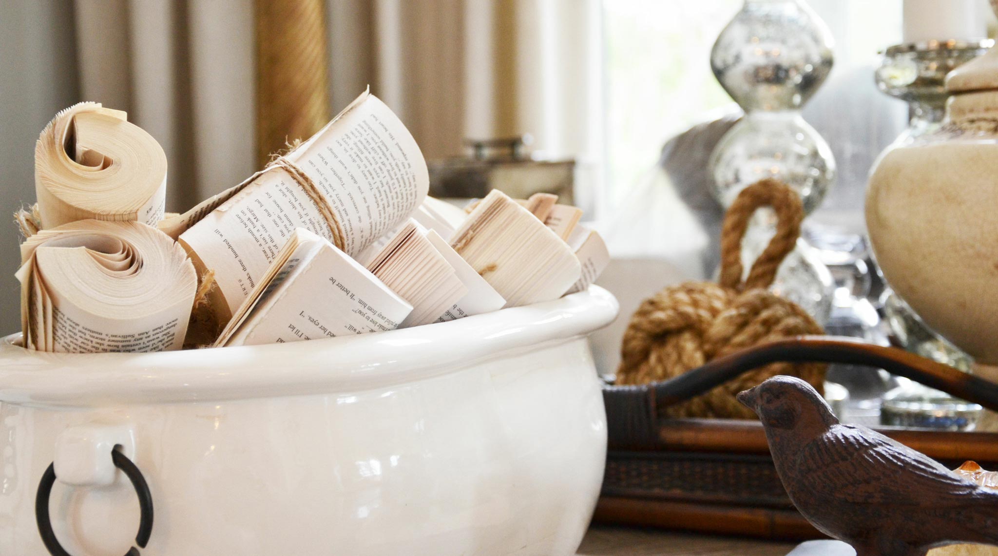 Many of us have a large collection of books and magazines, and they’re one of the best things to put on display. Design expert Andrew Pike showed us a great trick to reuse old and forgotten books in a fresh and interesting way in our Wyndance Model home back in 2014 by removing the covers, rolling the pages and securing with burlap twine.
