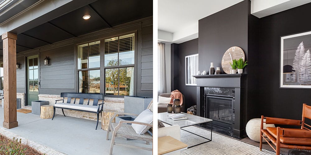 A livable neutral described as “bold but understated” by Sherwin-Williams, Urbane Bronze can be used anywhere in the home — inside or out. At our Halcyon model in Atlanta, rustic wood beams, light stone and a forest green door pop against a warm grey; while the daring hue is the focal point of this cozy living room at our Wyndfield model home in Southwestern Ontario.