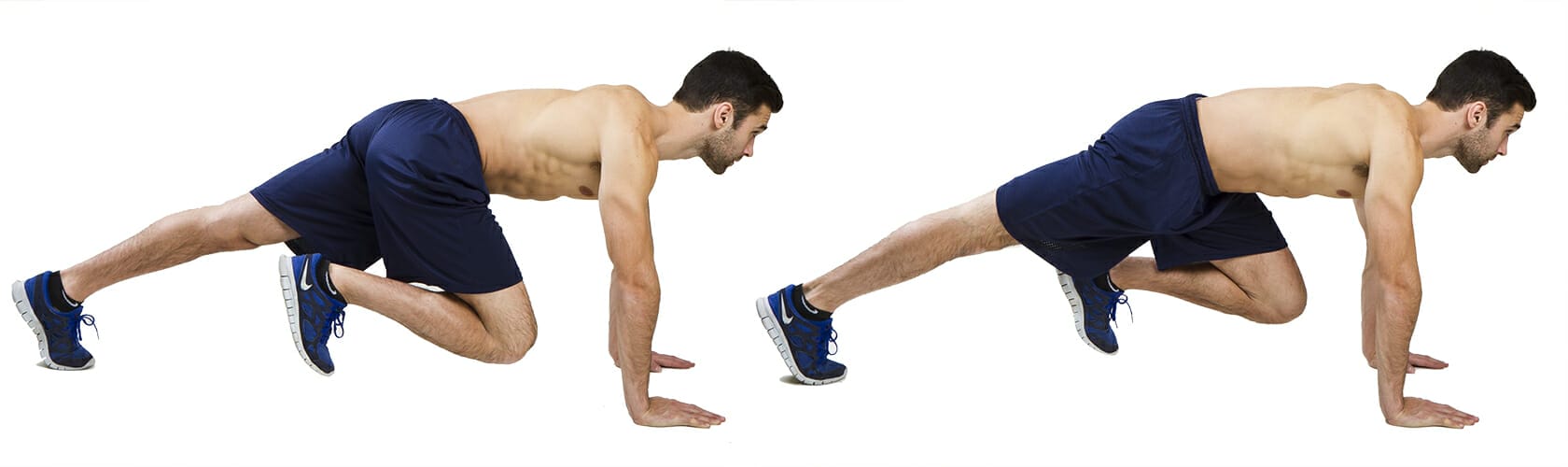 - 30 seconds mountain climbers (start in a plank position with arms fully extended, bring your alternating knees into your chest quickly as show in photo below)
