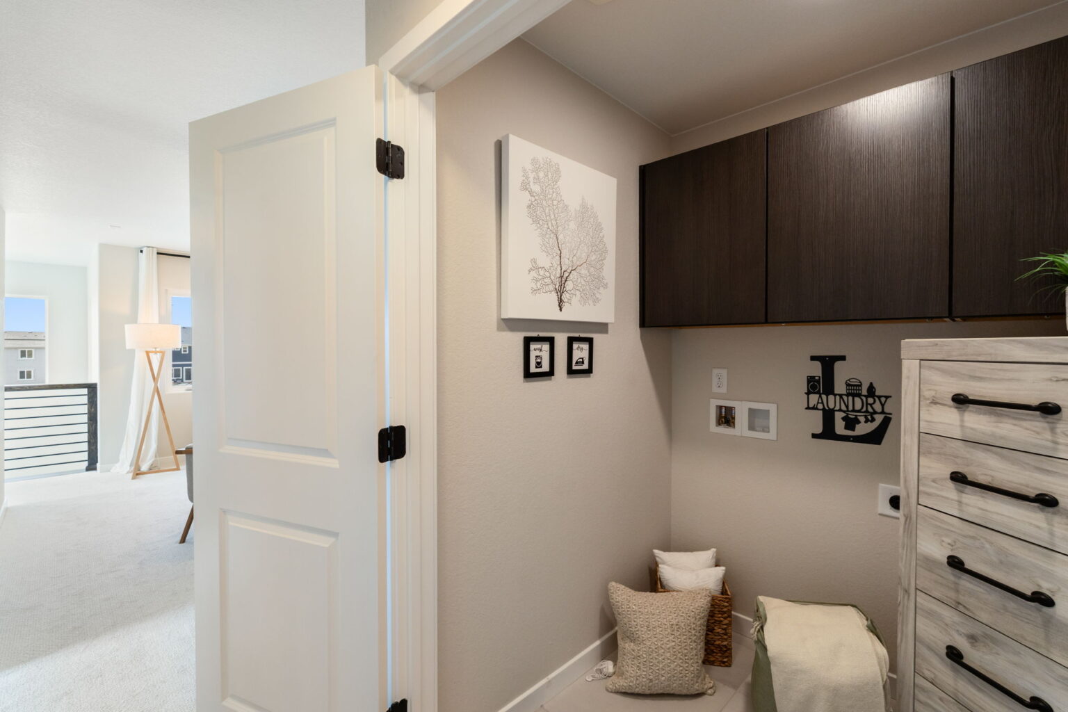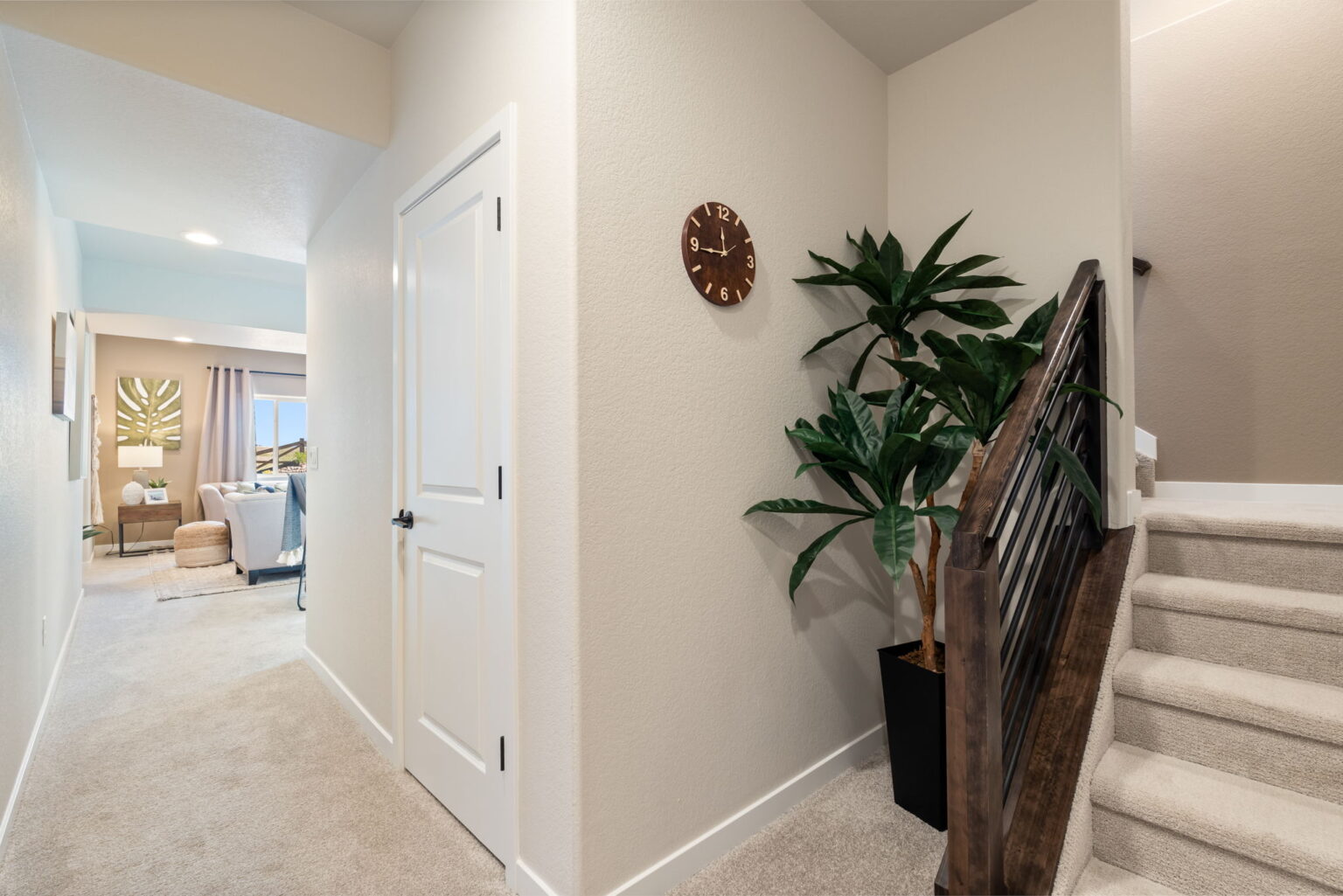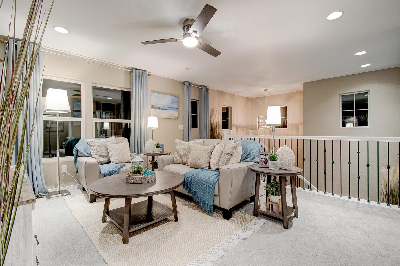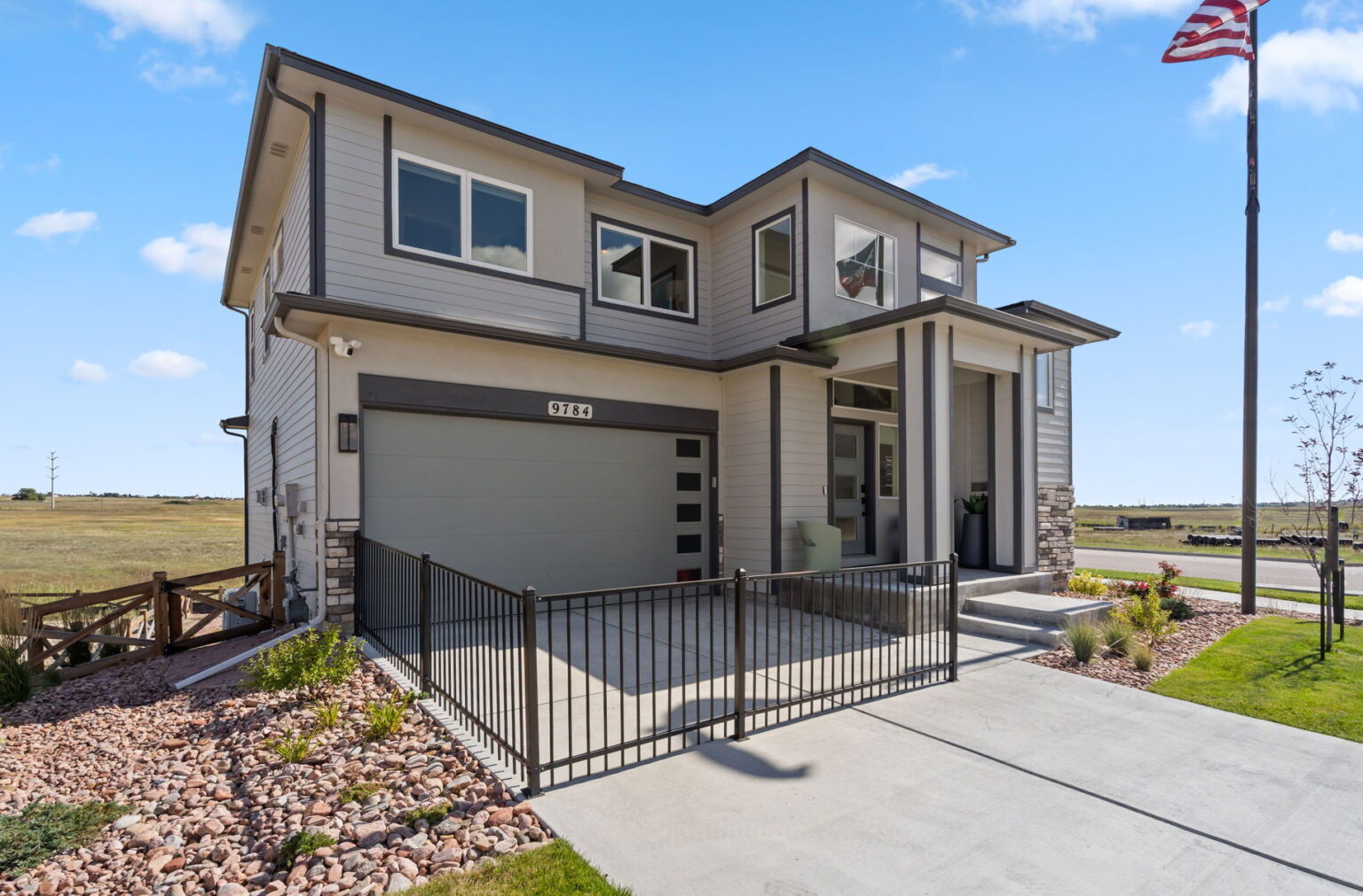 The great room is centered around a cozy fireplace, perfect for relaxing evenings or gatherings. Upstairs, the primary bathroom showcases sleek quartz countertops, adding a touch of luxury to your daily routine. Stylish wrought iron railings add a modern architectural detail, while central air conditioning ensures year-round comfort.
