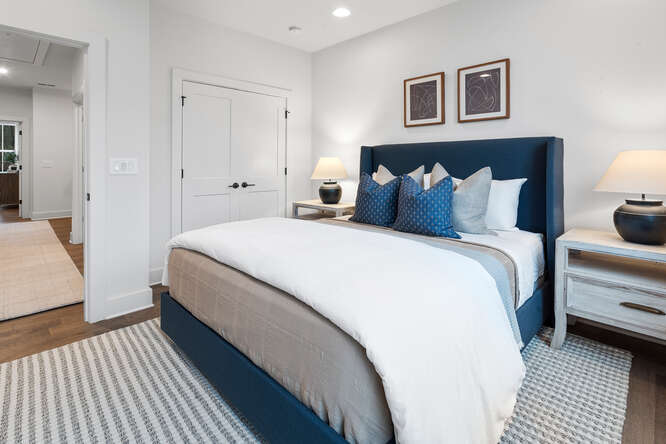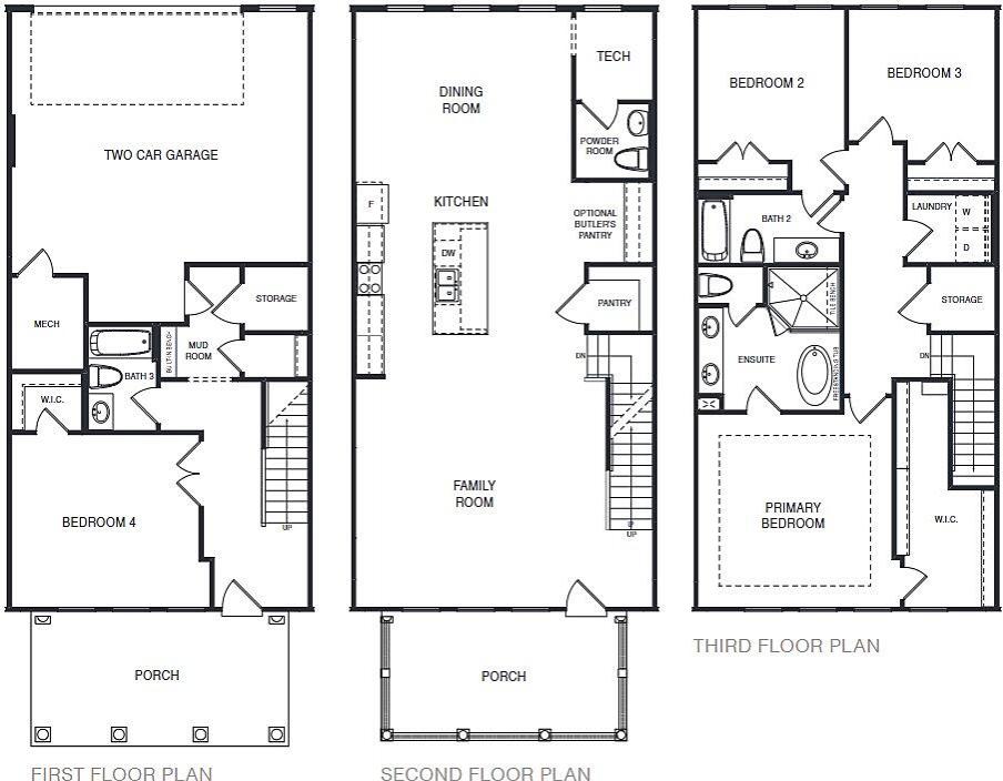 The Harleigh plan features amazing details with an abundance of space. This elevator-ready home opens its doors to so much creativity! The first floor features a bedroom perfect for an office or in-law suite with a full bath. The main floor features a spacious family room with fireplace opening out to your 2nd floor-covered porch overlooking the courtyard, an oversized island large enough to serve as a buffet, a chef’s kitchen with high-end stainless steel appliances, 42” stained/painted cabinets featuring soft close doors/drawers, walk-in pantry that’s alongside the butler’s pantry, the dining room is perfect for your oversized dining table, and a tech area perfect for your drop off station. The 3rd floor features a generous Primary Suite with a large walk-in custom-designed closet, a spacious bathroom with luxury tiles, large walk-in shower with bench, and a lavish soaking tub. There is a laundry room and 2 secondary bedrooms that share a full bath.