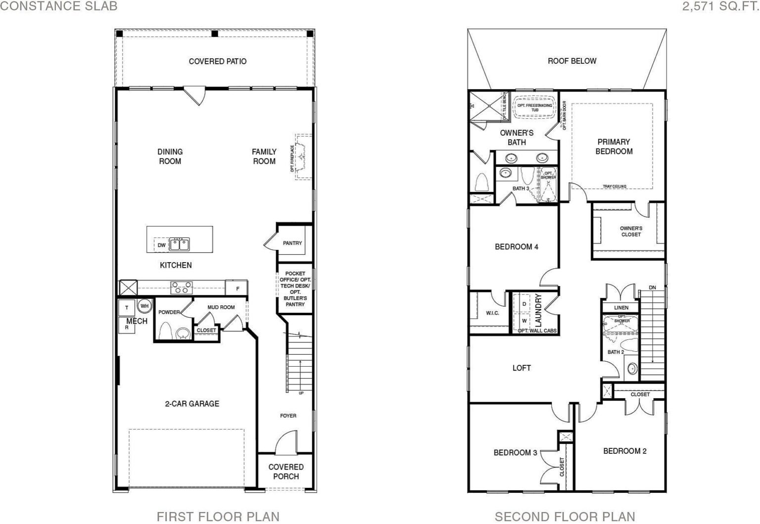 The Constance offers a perfect blend of luxury and practicality across two spacious floors. On the main level, enjoy an open-concept family room with an optional fireplace that extends to a covered patio. The chef’s kitchen includes an oversized island, stainless steel appliances, and a walk-in pantry. The second floor is home to the primary bedroom, complete with a walk-in closet and spa-like bathroom featuring a soaking tub and walk-in shower. Two additional bedrooms, a shared bath, and a laundry room complete the level. The Constance combines style and functionality, creating an inviting space for every lifestyle.