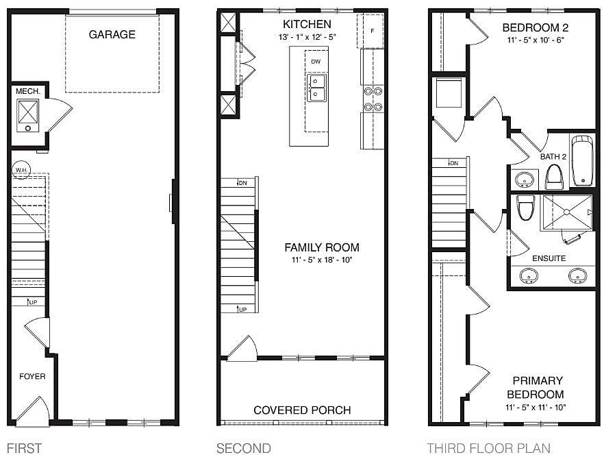 The Middleton floor plan seamlessly combines style and functionality. The open-concept middle floor, with an oversized kitchen island and covered porch, is perfect for entertaining. The spacious kitchen connects seamlessly to the family room and features a built-in pantry for ample storage. The top floor offers a private owner’s suite with a luxurious bath, with a secondary bedroom and bath for guests or roommates. The first floor includes an additional bedroom and bath. A one-car garage on the first floor adds convenience to this well-designed townhome.