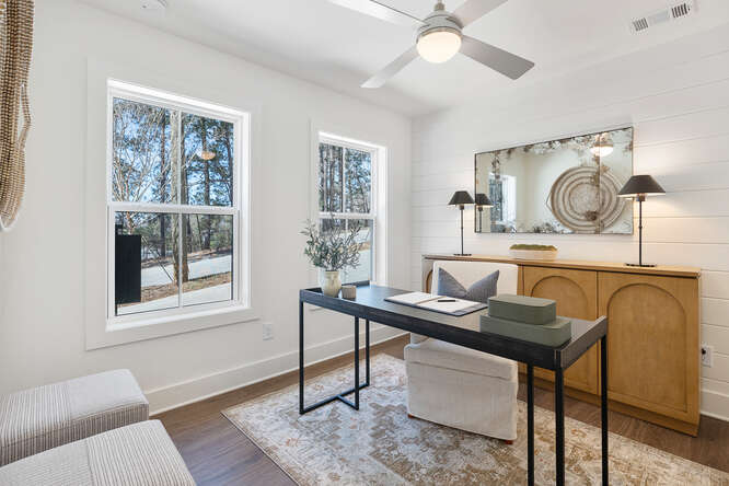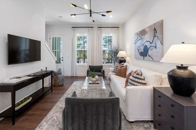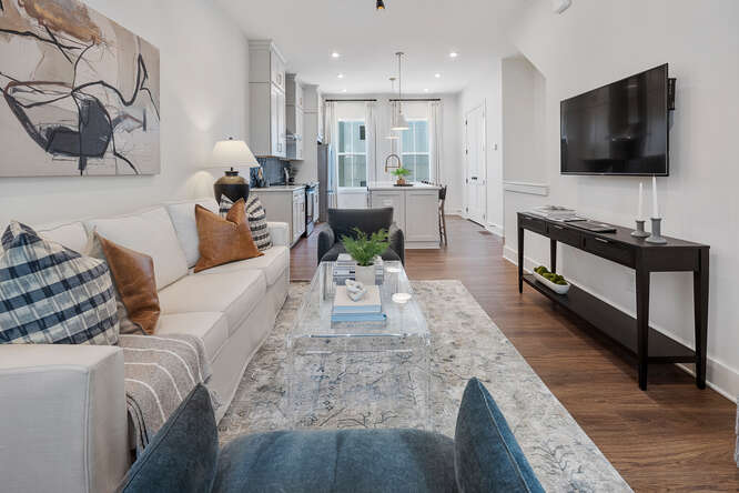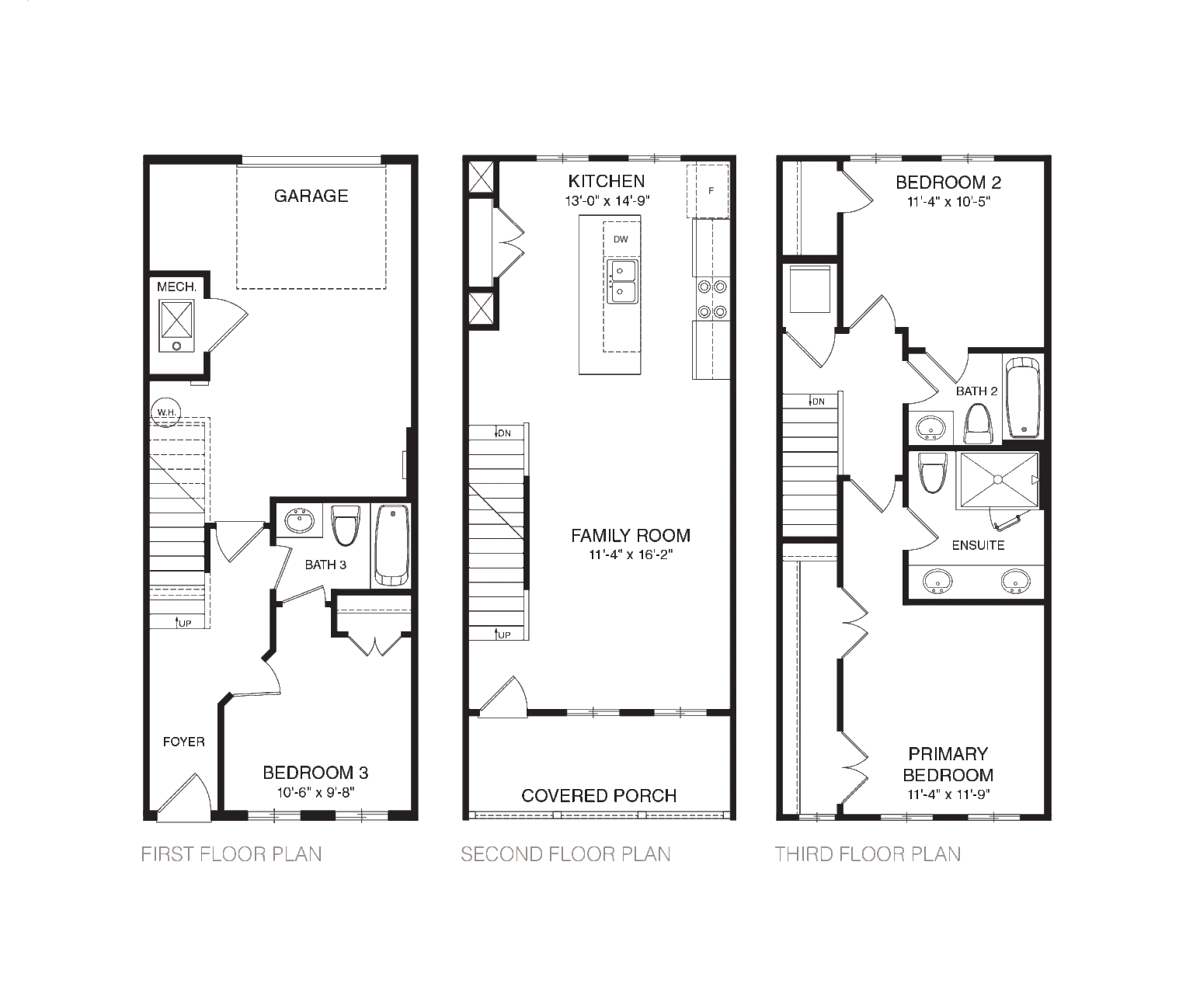 The Middleton floor plan seamlessly combines style and functionality. The open-concept middle floor, with an oversized kitchen island and covered porch, is perfect for entertaining. The spacious kitchen connects seamlessly to the family room and features a built-in pantry for ample storage. The top floor offers a private owner’s suite with a luxurious bath, with a secondary bedroom and bath for guests or roommates. A two-car garage on the first floor adds convenience to this well-designed townhome.