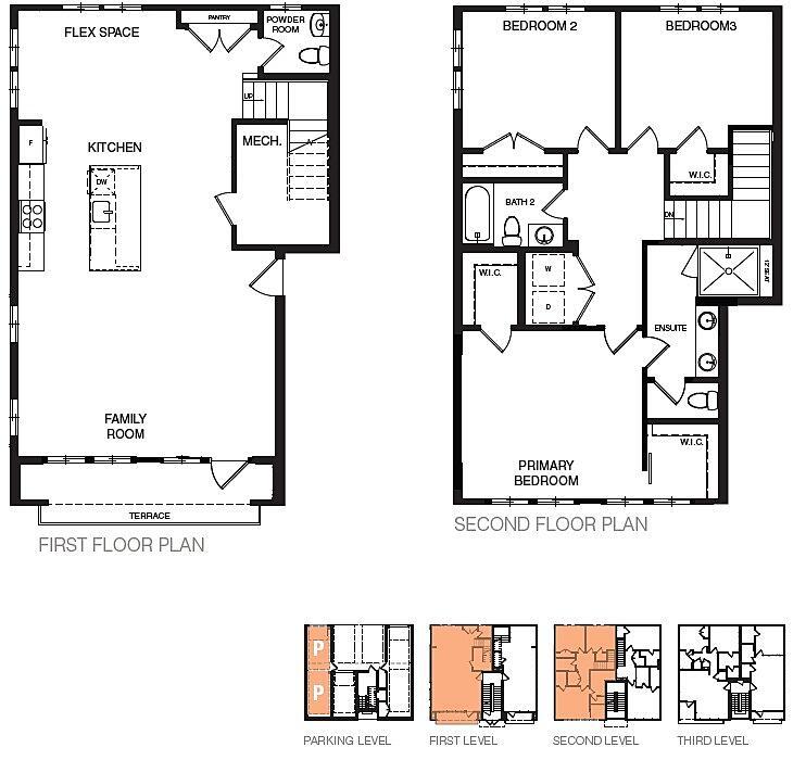 The main floor of the Executive floor plan features the kitchen, open to the family room, and flex space great for a home office or dining area. The terrace, located off the family room, provides an outdoor space perfect for dining or entertaining guests. The second floor includes a primary suite and ensuite bath, complete with two walk-in closets providing ample storage options. Additionally, there are two secondary bedrooms with a shared bathroom. The convenience of a two-car tandem private garage is located on the bottom level.