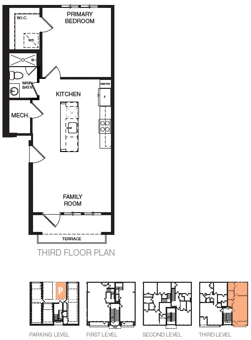 Perched on the highest level, The Prodigy floorplan embodies a meticulously crafted open concept living space, highlighting a gourmet kitchen adorned with quartz countertops, stainless steel appliances, and an expansive island. The family room seamlessly extends to the covered terrace, providing an ideal setting for hosting gatherings or simply enjoying a moment of relaxation in elegance. The primary suite is thoughtfully designed, featuring a generously sized bedroom complemented by a walk-in closet and a well-appointed bathroom. Additionally, this home provides a one-car garage ensuring both protection and convenience.