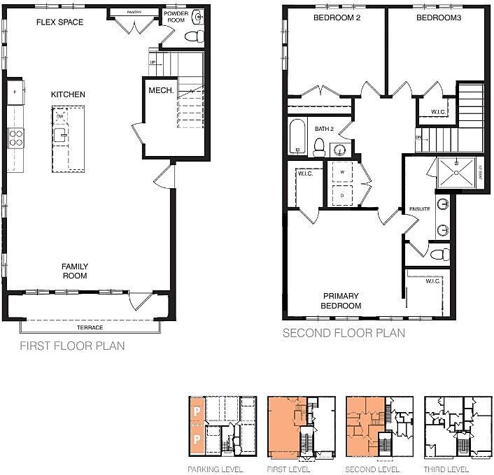 The main floor of the Executive floor plan features the kitchen, open to the family room, and flex space great for a home office or dining area. The terrace, located off the family room, provides an outdoor space perfect for dining or entertaining guests. The second floor includes a primary suite and ensuite bath, complete with two walk-in closets providing ample storage options. Additionally, there are two secondary bedrooms with a shared bathroom. The convenience of a two-car tandem private garage is located on the bottom level.