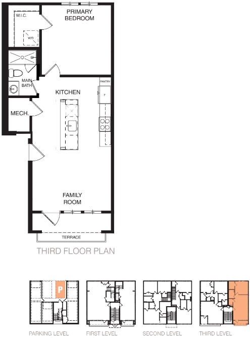 Perched on the highest level, The Prodigy floorplan embodies a meticulously crafted open concept living space, highlighting a gourmet kitchen adorned with quartz countertops, stainless steel appliances, and an expansive island. The family room seamlessly extends to the covered terrace, providing an ideal setting for hosting gatherings or simply enjoying a moment of relaxation in elegance. The primary suite is thoughtfully designed, featuring a generously sized bedroom complemented by a walk-in closet and a well-appointed bathroom. Additionally, this home provides a one-car garage ensuring both protection and convenience.