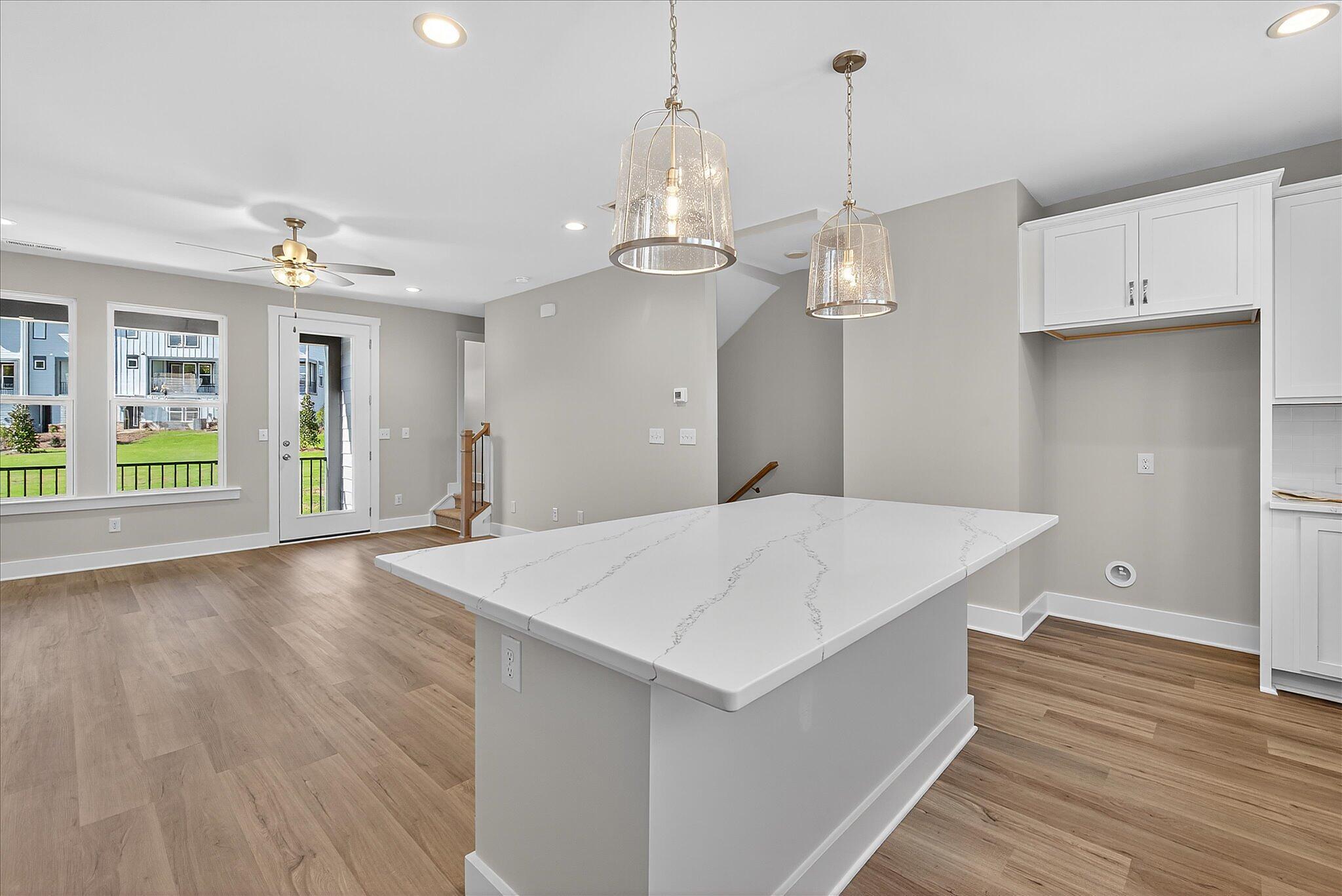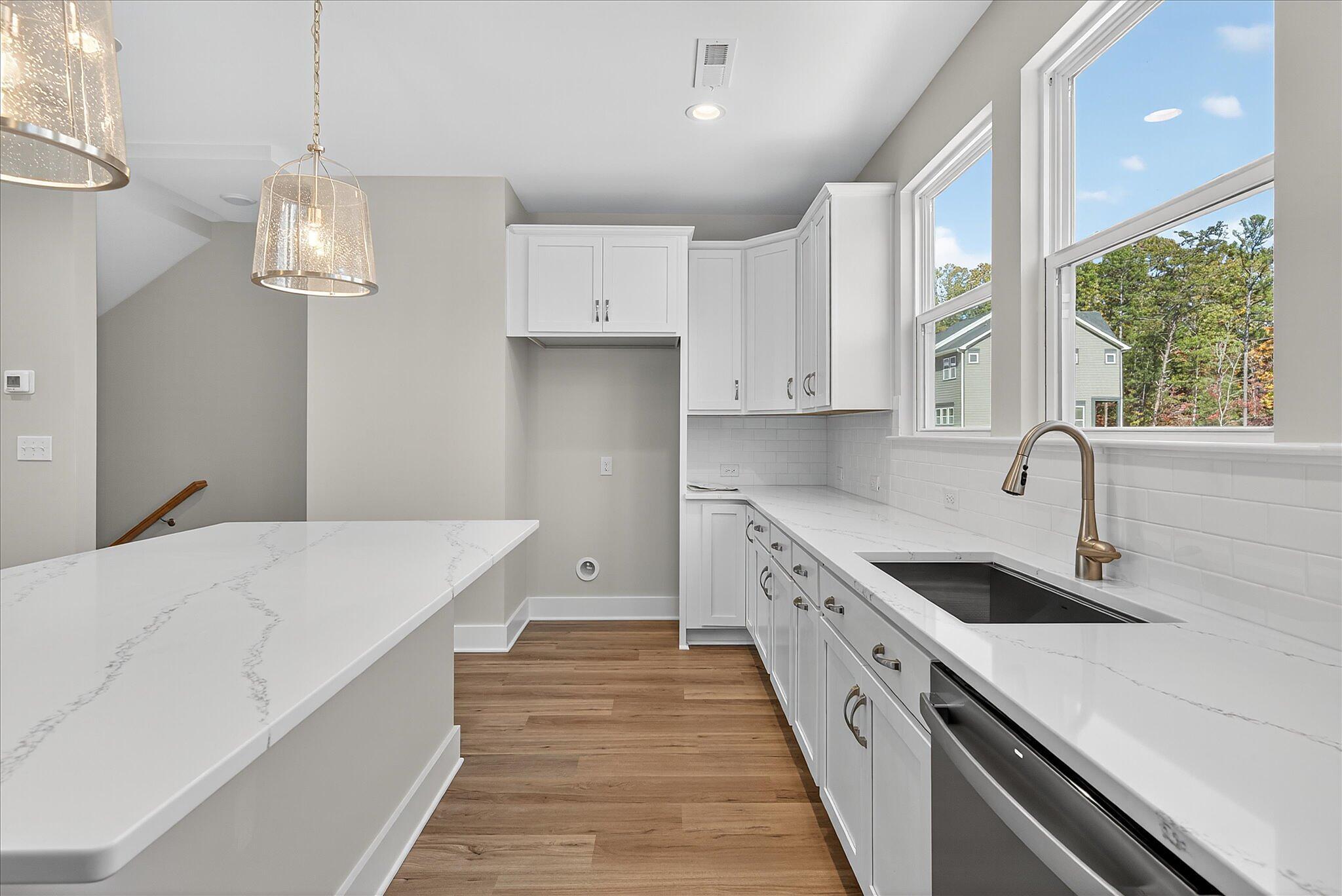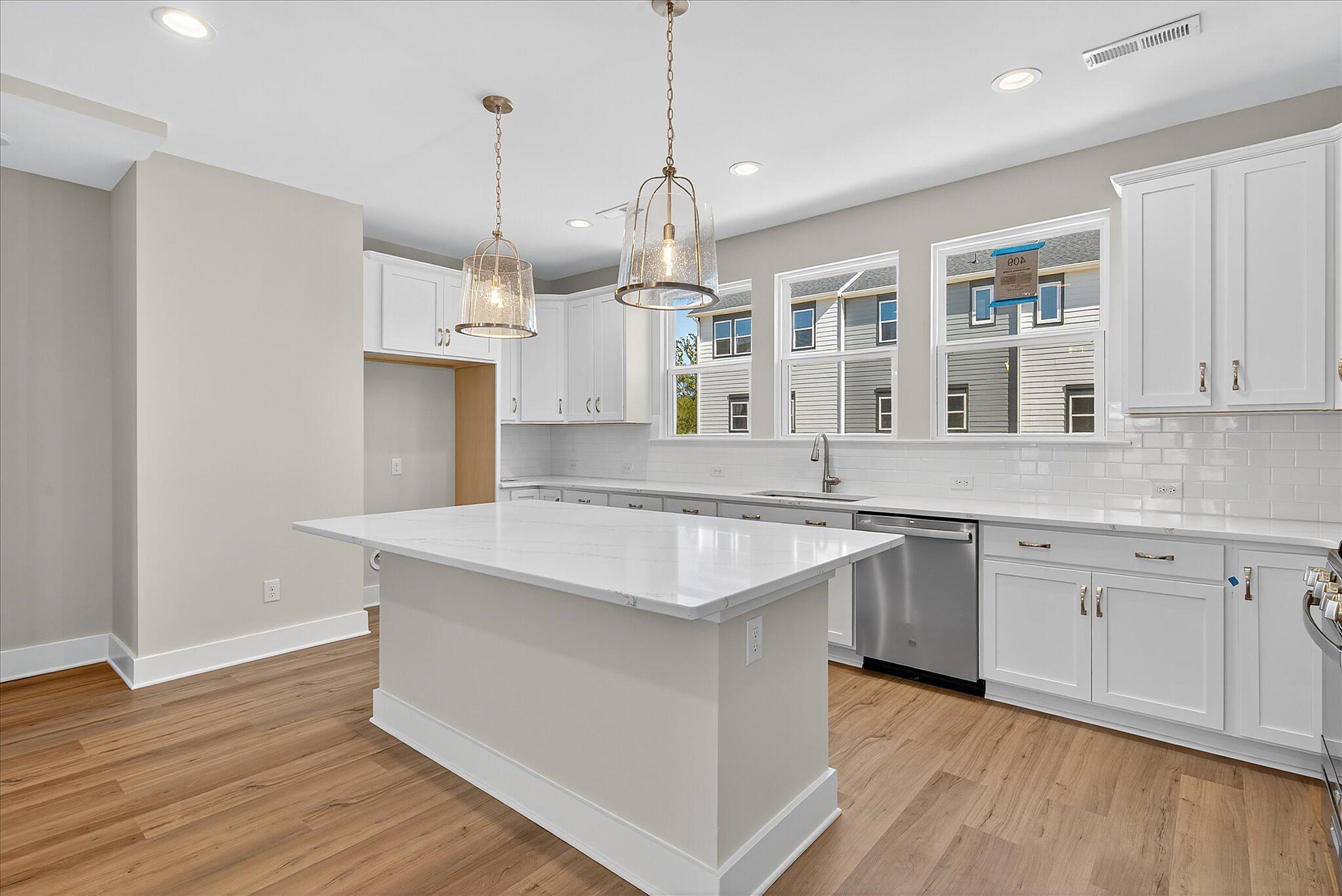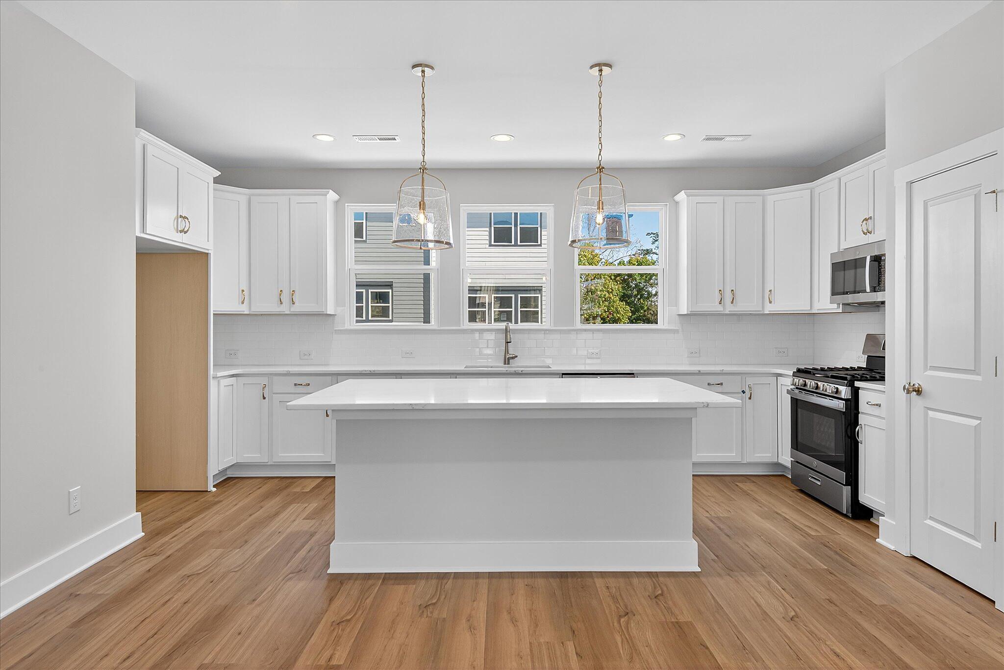 This new townhome in Charlotte offers a private bathroom with every bedroom, great for roommates or guests! The first-floor has a private guest suite, and the other bedrooms are on the third floor; the primary bedroom has a walk-in closet and bathroom with large tiled shower. Enjoy quartz counters throughout, with tiled floors in all bathrooms. The second floor offers open-concept living, with a covered terrace and the living/dining/kitchen flowing together. The kitchen features a large island with space for barstools on both sides; use this as your main dining table! Kitchen also includes 42″ white cabinets, double trash pullout cabinet, GE stainless steel appliances with gas range, large undermount sink, and Moen faucet. Laundry closet is large enough for a full-size stacked washer/dryer. LVP flooring throughout the first and second floors. This townhome is walking distance to the paved Toby Creek Greenway, and only minutes to UNC Charlotte, IKEA, I-85, and so much more. 3 bedrooms, 3.5 baths, and a 2-car garage.