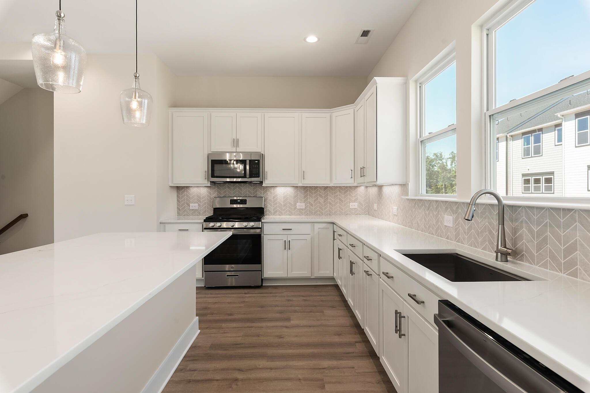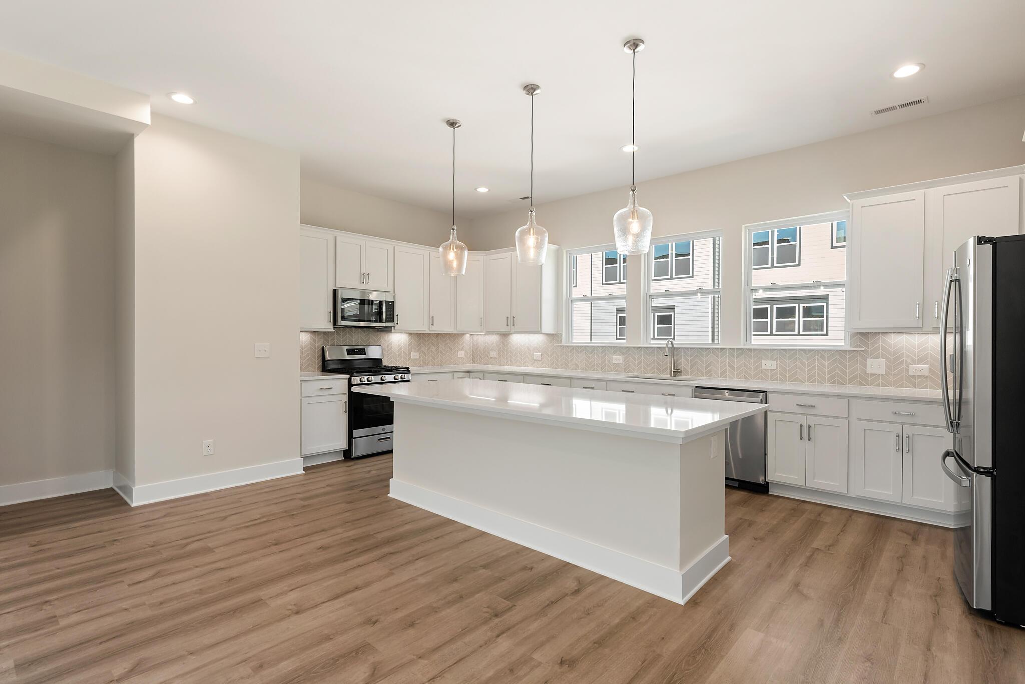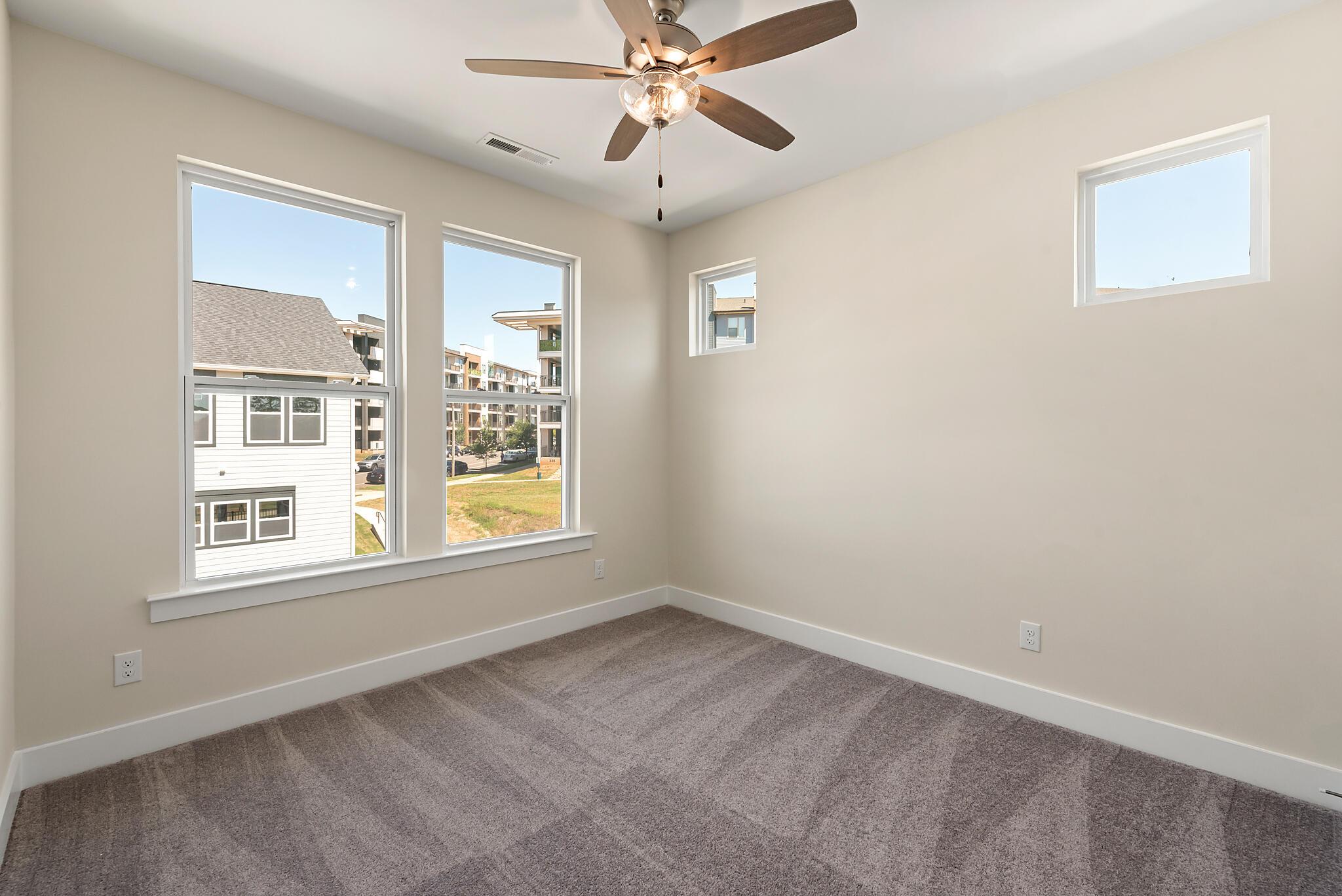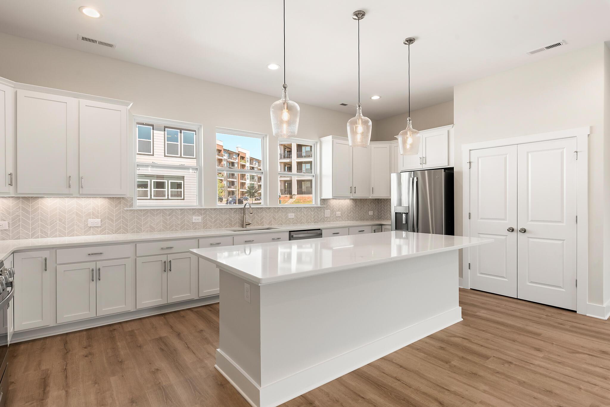 This is a spacious end-unit townhome with extra windows & upgrades throughout, plus ALL appliances! There is a private guest suite on the first floor, with the other 3 bedrooms on the 3rd floor. The second floor boasts a private covered terrace, 10′ ceilings and an open layout for kitchen/dining/living space. Kitchen has quartz counters, 42″ white painted cabinets, brushed nickel hardware, under-cabinet lighting, double trash pullout, large stainless undermount sink, GE stainless steel appliances with gas range and French door refrigerator included. Premier Suite has a walk-in closet and private bath with raised-height vanity with quartz counters and white cabinets, tiled floor, and tiled shower with semi-frameless glass surround. Secondary Baths feature quartz counter, Iron painted cabinet, fiberglass tub/shower, tile flooring, brushed nickel hardware. LVP throughout the first and second floors plus the third-floor hallway. Tile in full baths and laundry. Oak treads on all stairs. 9′ ceilings on the 1st and 3rd floors. Laundry includes tiled floor and GE 2-in-1 washer/dryer combo. 4 bedrooms, 3.5 baths.