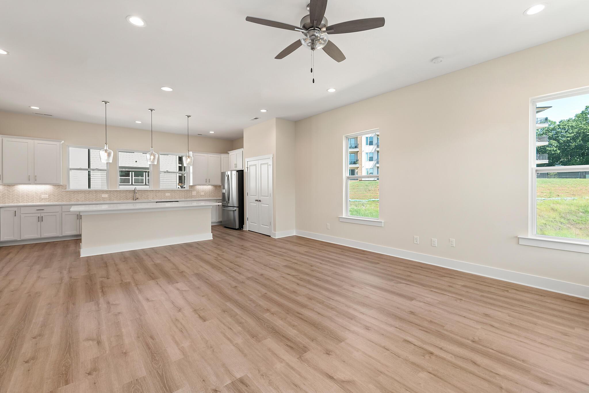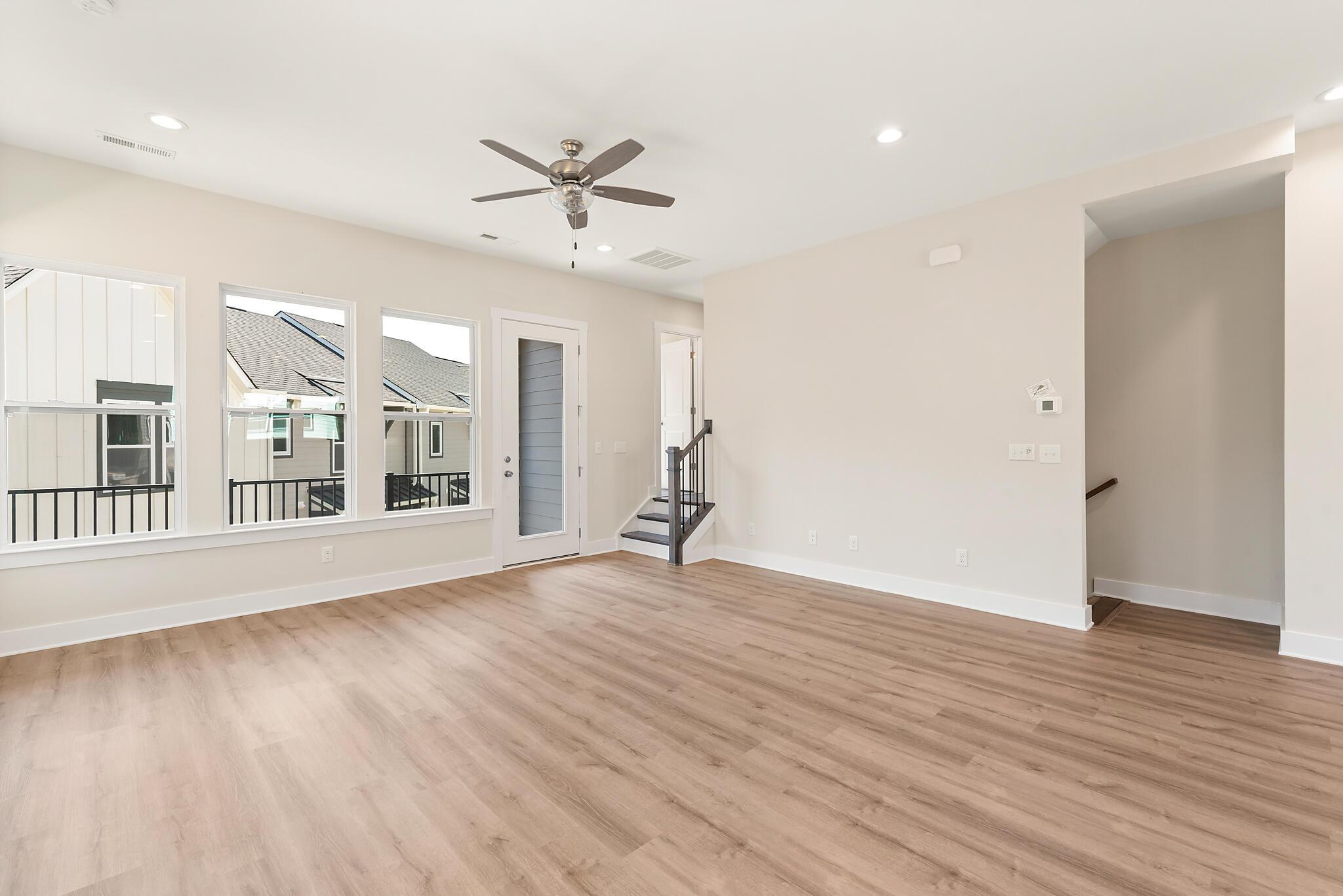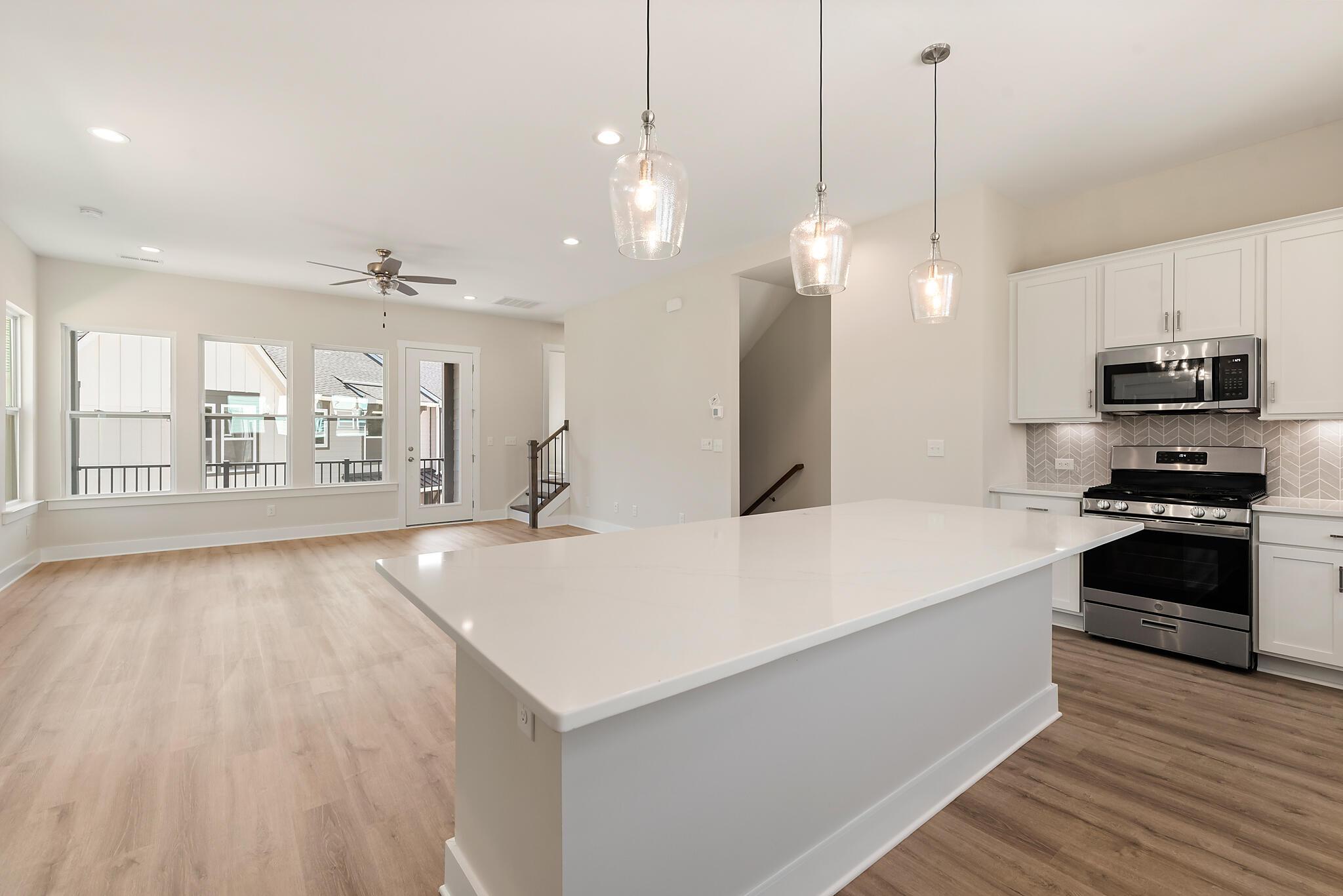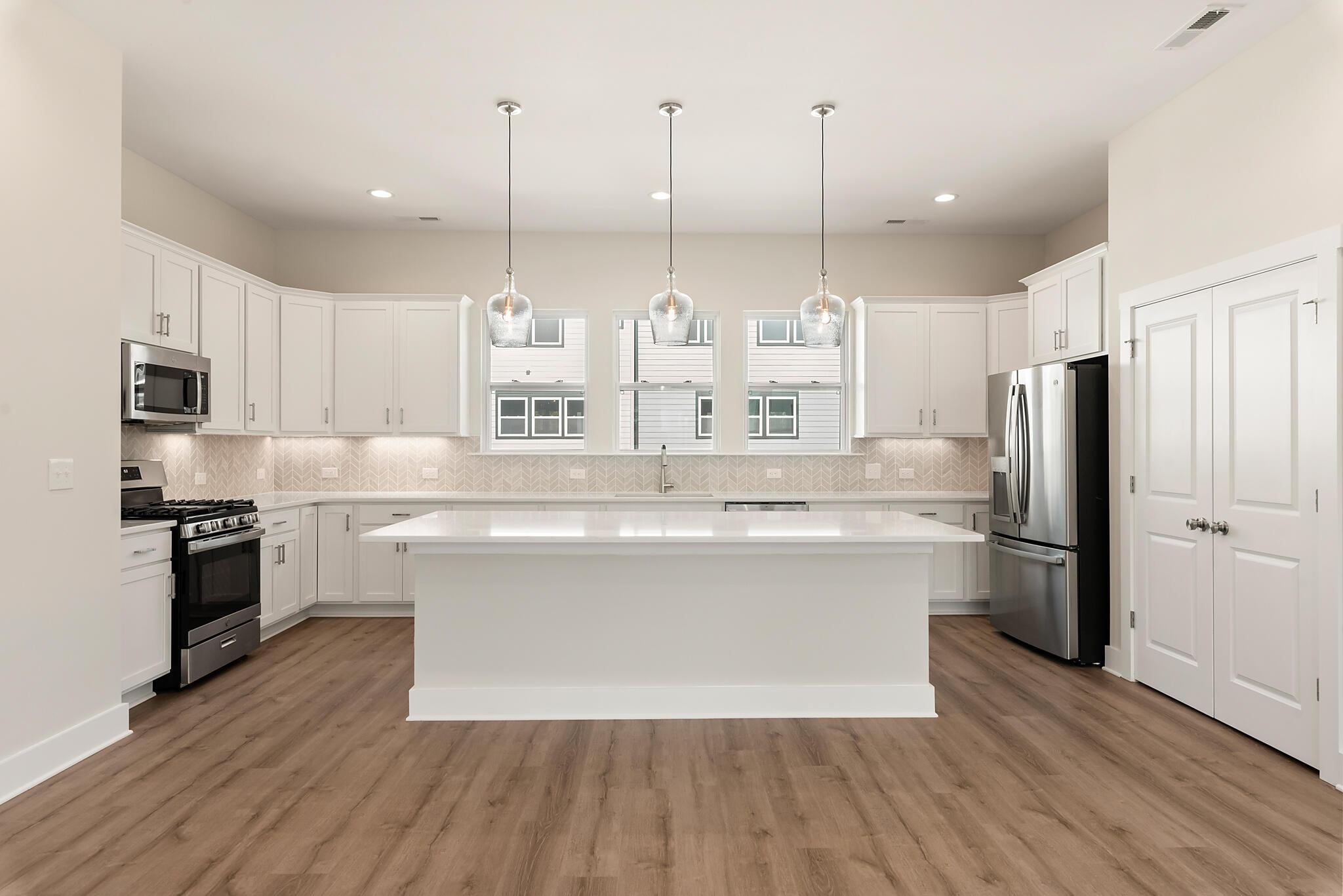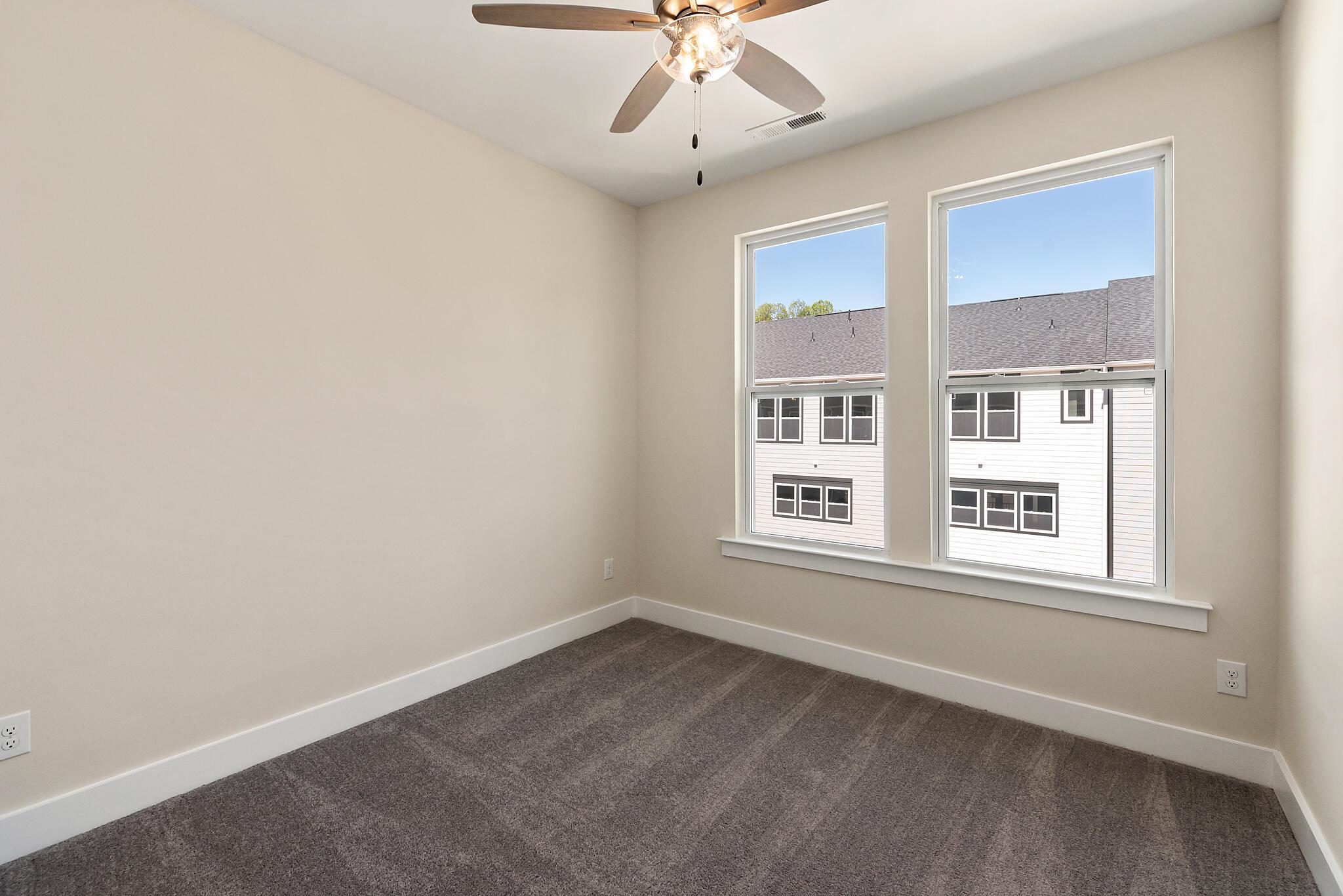 This is a spacious end-unit townhome with extra windows & upgrades throughout, plus ALL appliances! There is a private guest suite on the first floor, with the other 3 bedrooms on the 3rd floor. The second floor boasts a private covered terrace, 10′ ceilings and an open layout for kitchen/dining/living space. Kitchen has quartz counters, 42″ white painted cabinets, brushed nickel hardware, under-cabinet lighting, double trash pullout, large stainless undermount sink, GE stainless steel appliances with gas range and French door refrigerator included. Premier Suite has a walk-in closet and private bath with raised-height vanity with quartz counters and white cabinets, tiled floor, and tiled shower with semi-frameless glass surround. Secondary Baths feature quartz counter, Iron painted cabinet, fiberglass tub/shower, tile flooring, brushed nickel hardware. LVP throughout the first and second floors plus the third-floor hallway. Tile in full baths and laundry. Oak treads on all stairs. 9′ ceilings on the 1st and 3rd floors. Laundry includes tiled floor and GE 2-in-1 washer/dryer combo. 4 bedrooms, 3.5 baths.