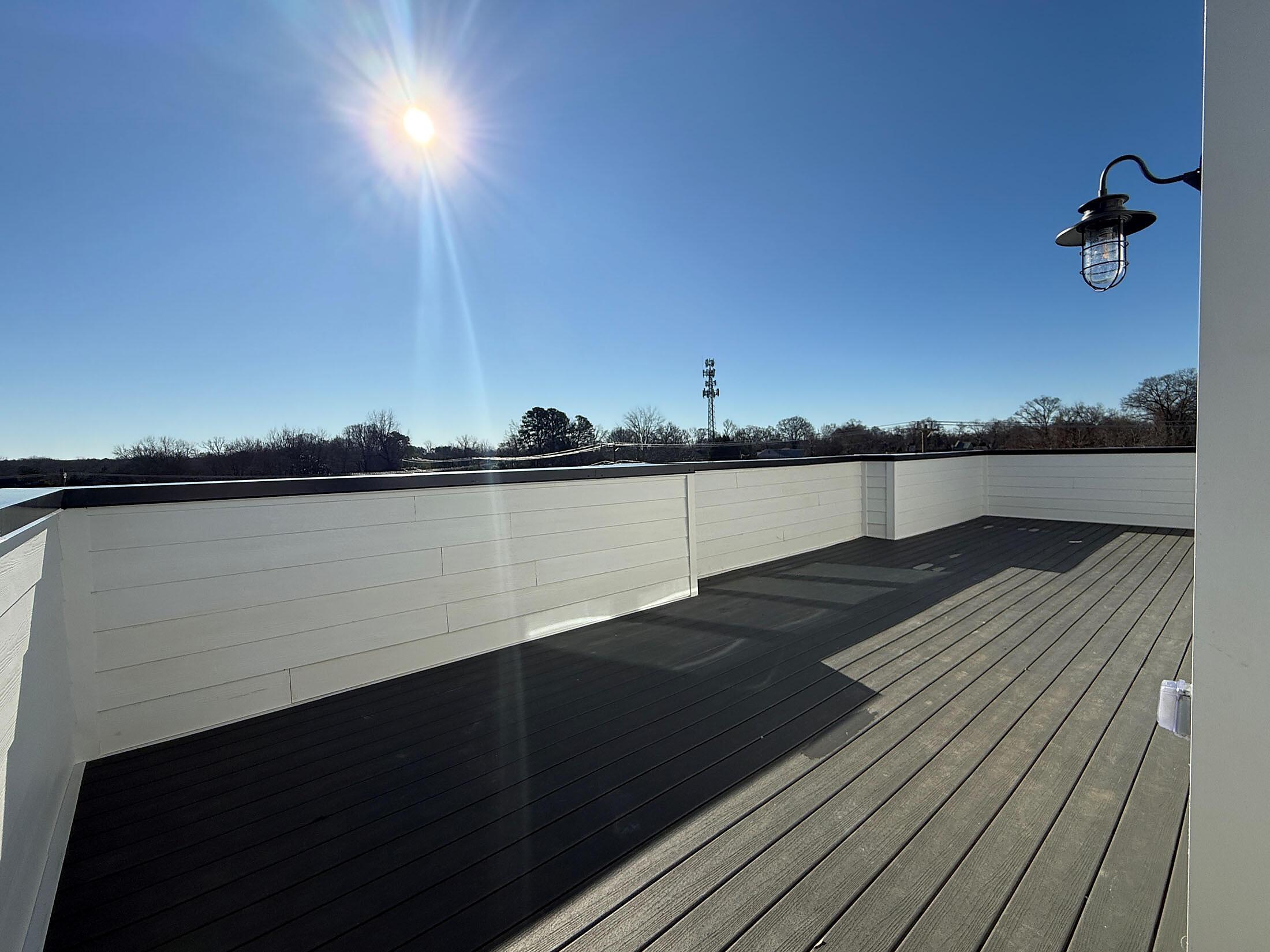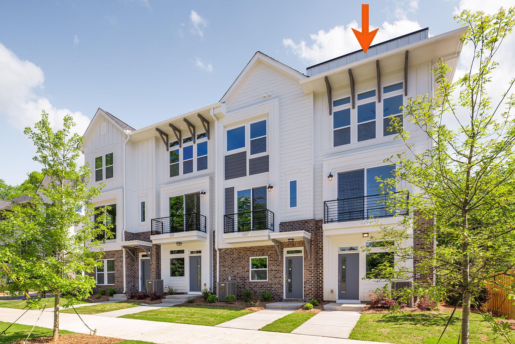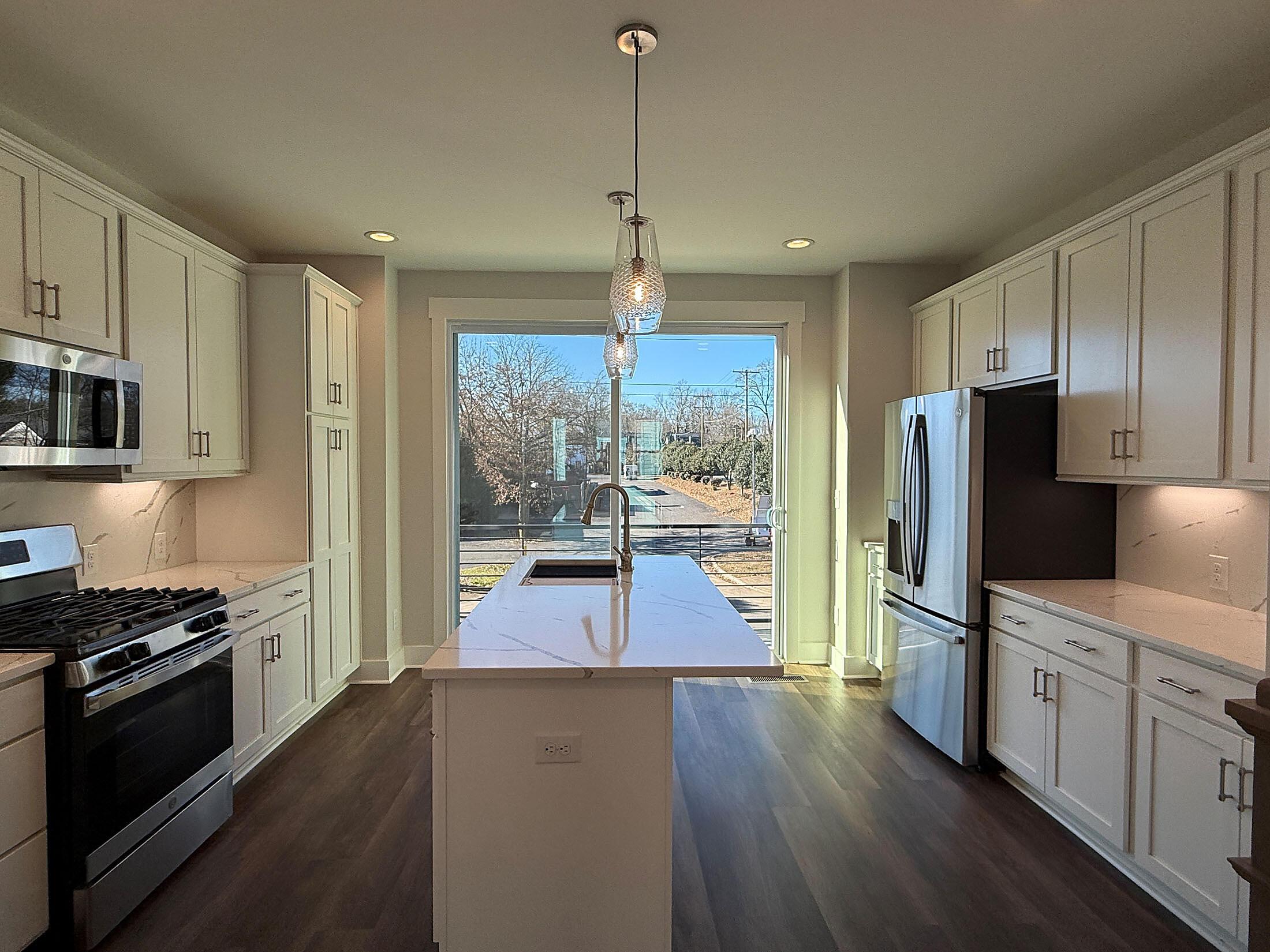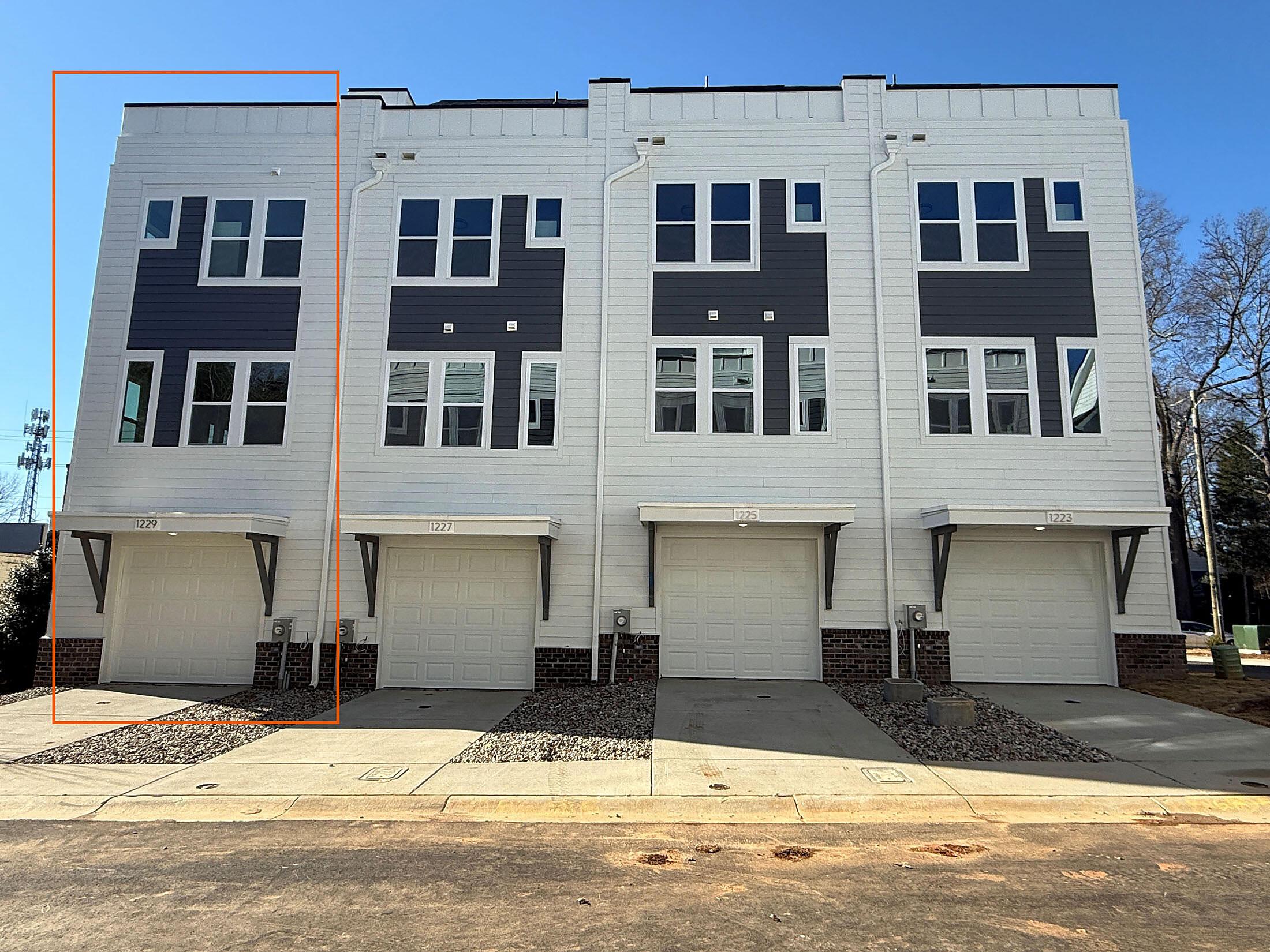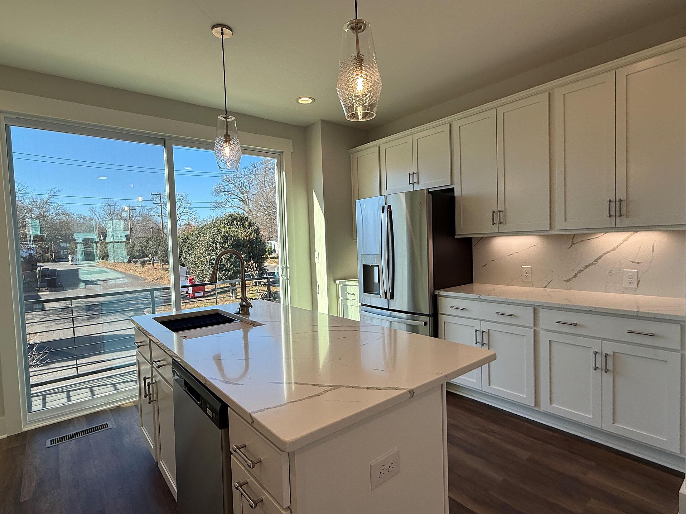 NoDa townhome maximizes outdoor living, with an expansive rooftop terrace spanning the entire top floor, plus a deck off the Kitchen; both outdoor spaces have TREX decking. 2 bedrooms, 2.5 baths. 3rd floor has both bedrooms plus the laundry closet with a GE stacked washer/dryer included. Premier bath includes a large tiled shower, raised-height vanity with quartz counters and white painted cabinets, plus tiled floors. Secondary bath has white cabinets, quartz counter, and tiled floor. Enjoy the open plan of the 2nd floor; the kitchen features quartz counters, 42″ cabinets for maximum storage, LED under-cabinet lights, trash pullout, and GE stainless steel appliances with gas range and French door fridge included, plus large stainless undermount sink. Enjoy features such as 9′ ceilings throughout, 2 included ceiling fans, and modern lighting. LVP floors are throughout the 1st and 2nd floor plus 3rd floor hall and laundry, with oak treads on the stairs. 2-car tandem garage plus driveway for extra parking. Home includes 2″ blinds (not pictured).