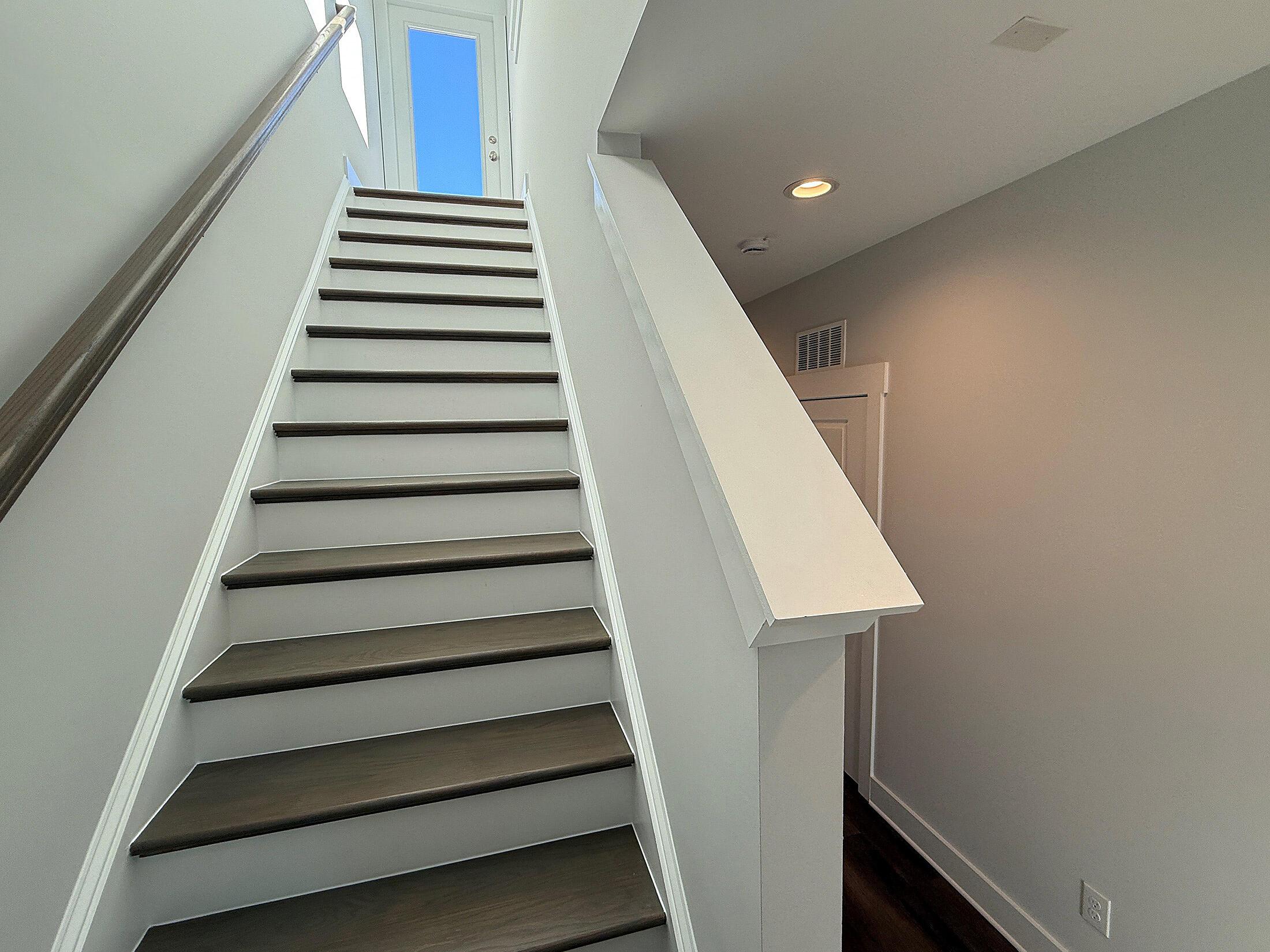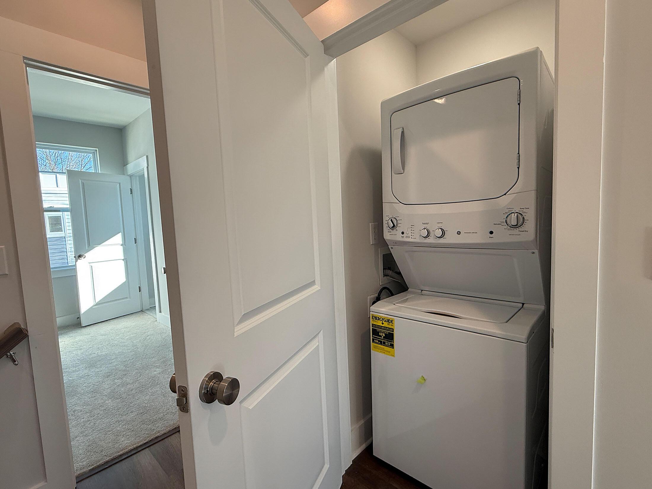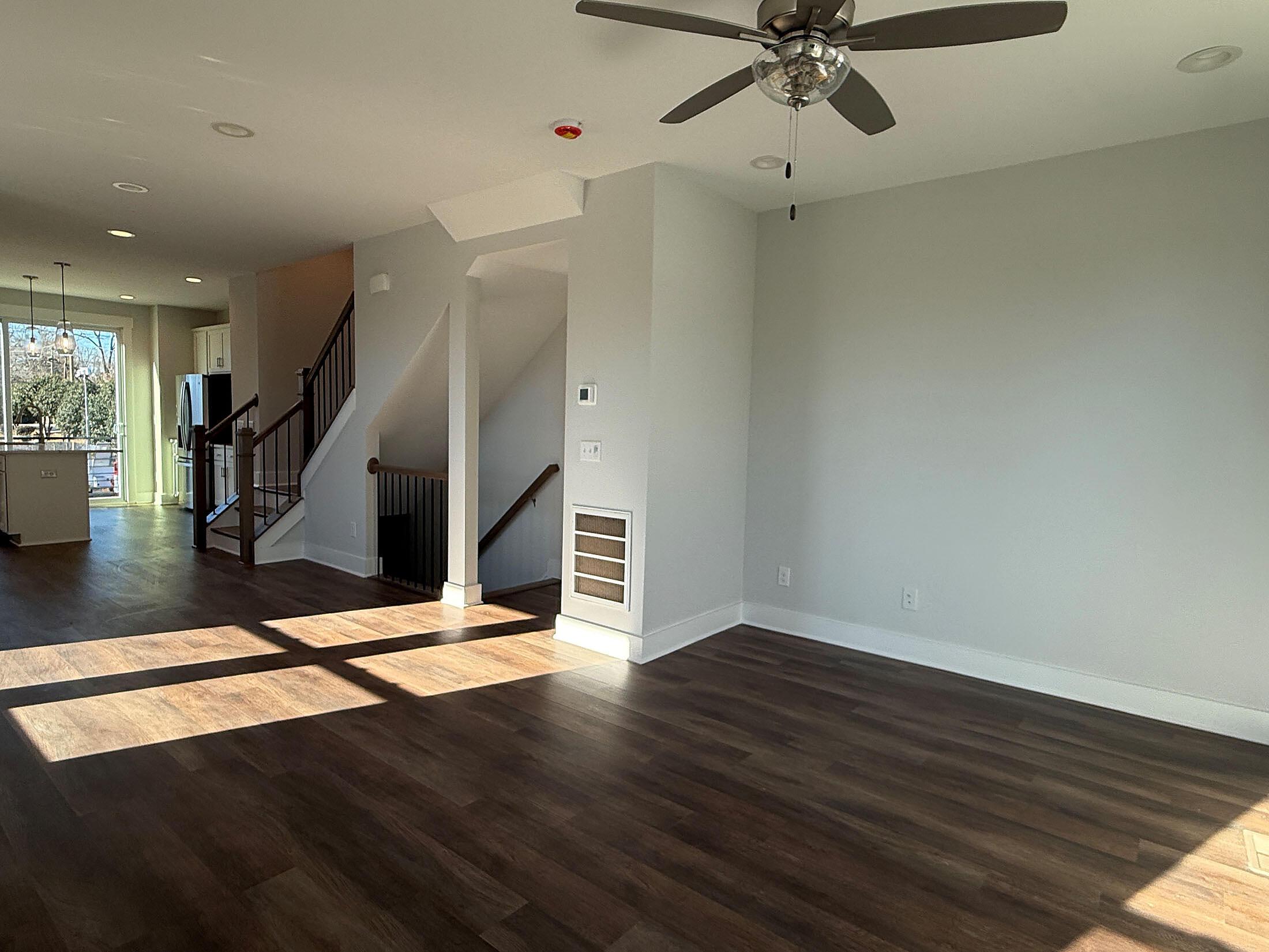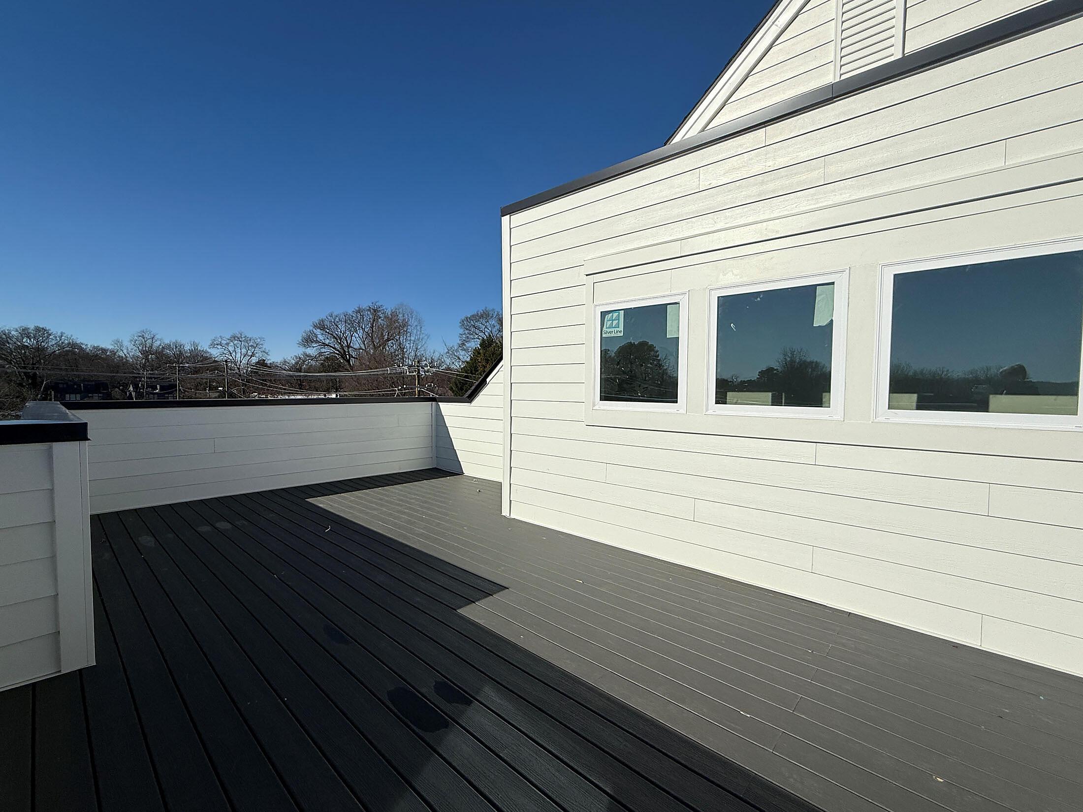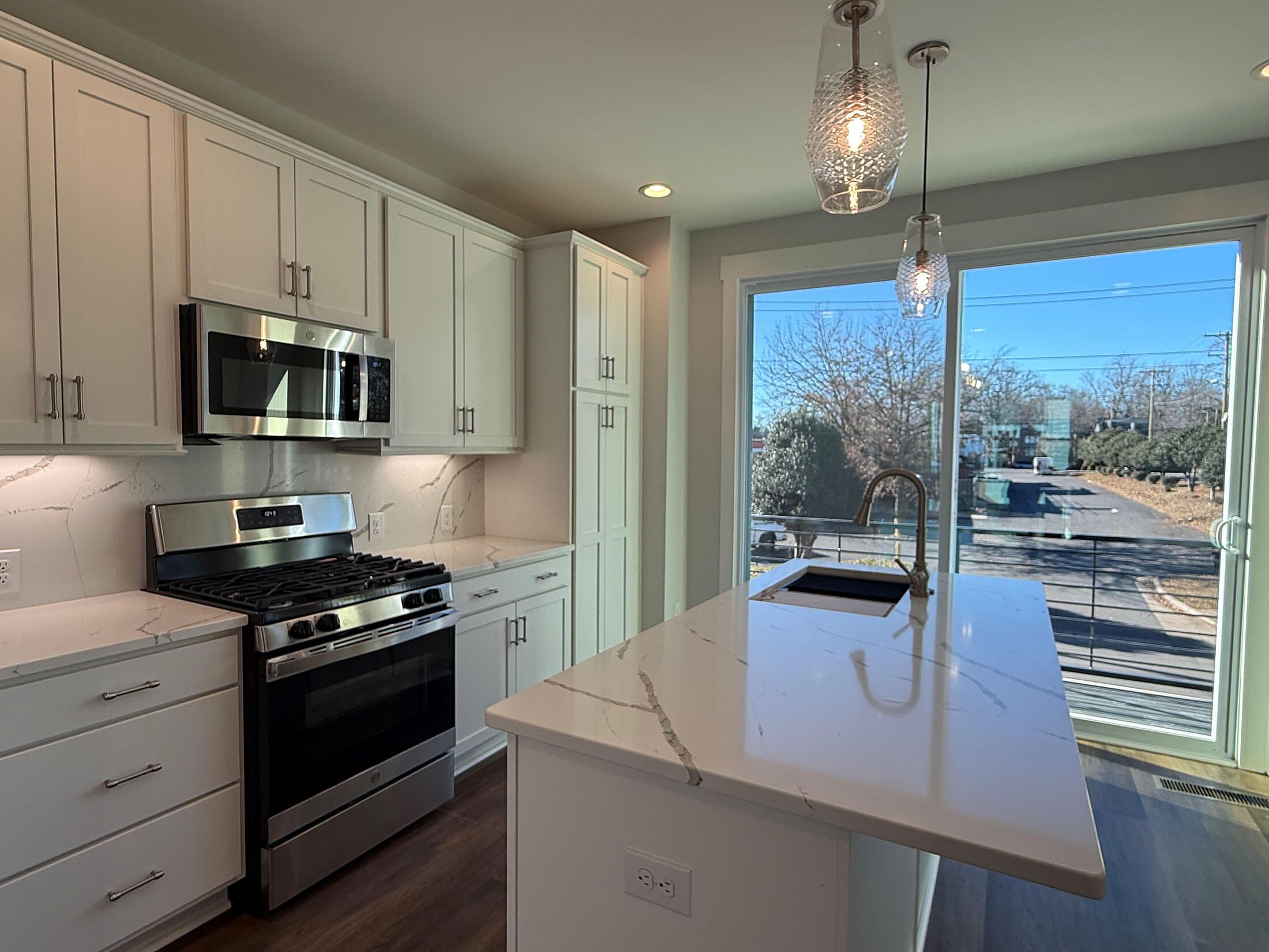 NoDa townhome maximizes outdoor living, with an expansive rooftop terrace spanning the entire top floor, plus a deck off the Kitchen; both outdoor spaces have TREX decking. 2 bedrooms, 2.5 baths. 3rd floor has both bedrooms plus the laundry closet with a GE stacked washer/dryer included. Premier bath includes a large tiled shower, raised-height vanity with quartz counters and white painted cabinets, plus tiled floors. Secondary bath has white cabinets, quartz counter, and tiled floor. Enjoy the open plan of the 2nd floor; the kitchen features quartz counters, 42″ cabinets for maximum storage, LED under-cabinet lights, trash pullout, and GE stainless steel appliances with gas range and French door fridge included, plus large stainless undermount sink. Enjoy features such as 9′ ceilings throughout, 2 included ceiling fans, and modern lighting. LVP floors are throughout the 1st and 2nd floor plus 3rd floor hall and laundry, with oak treads on the stairs. 2-car tandem garage plus driveway for extra parking. Home includes 2″ blinds (not pictured).