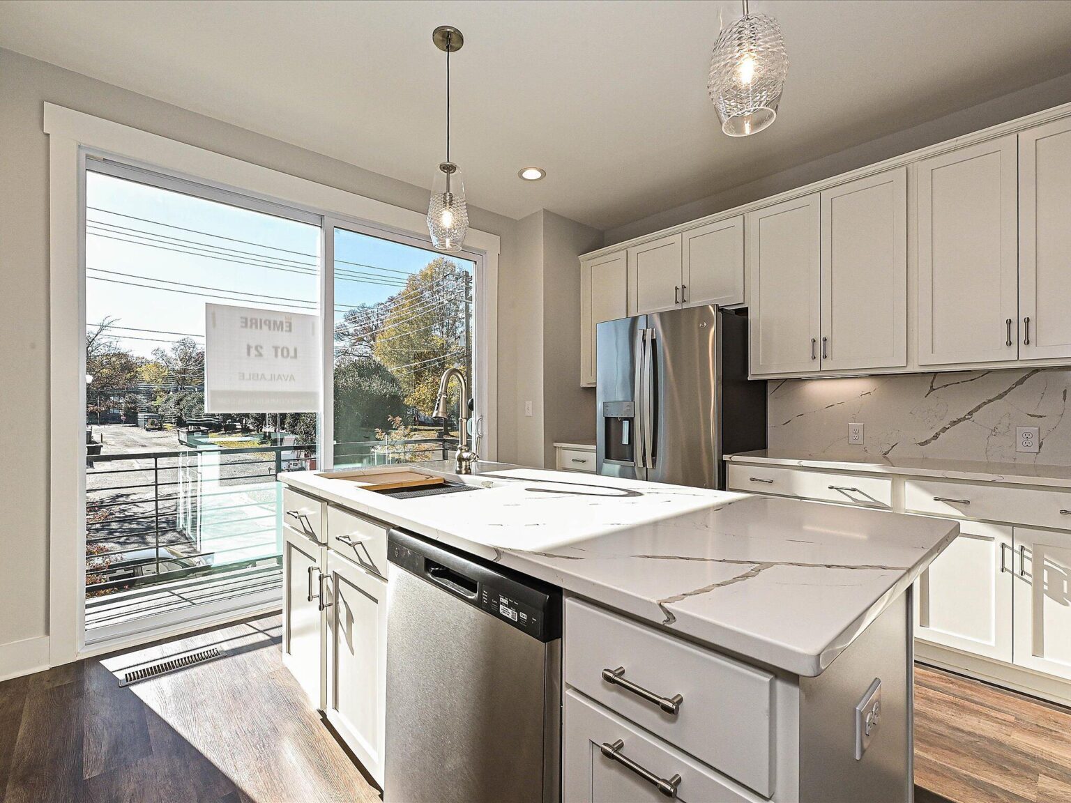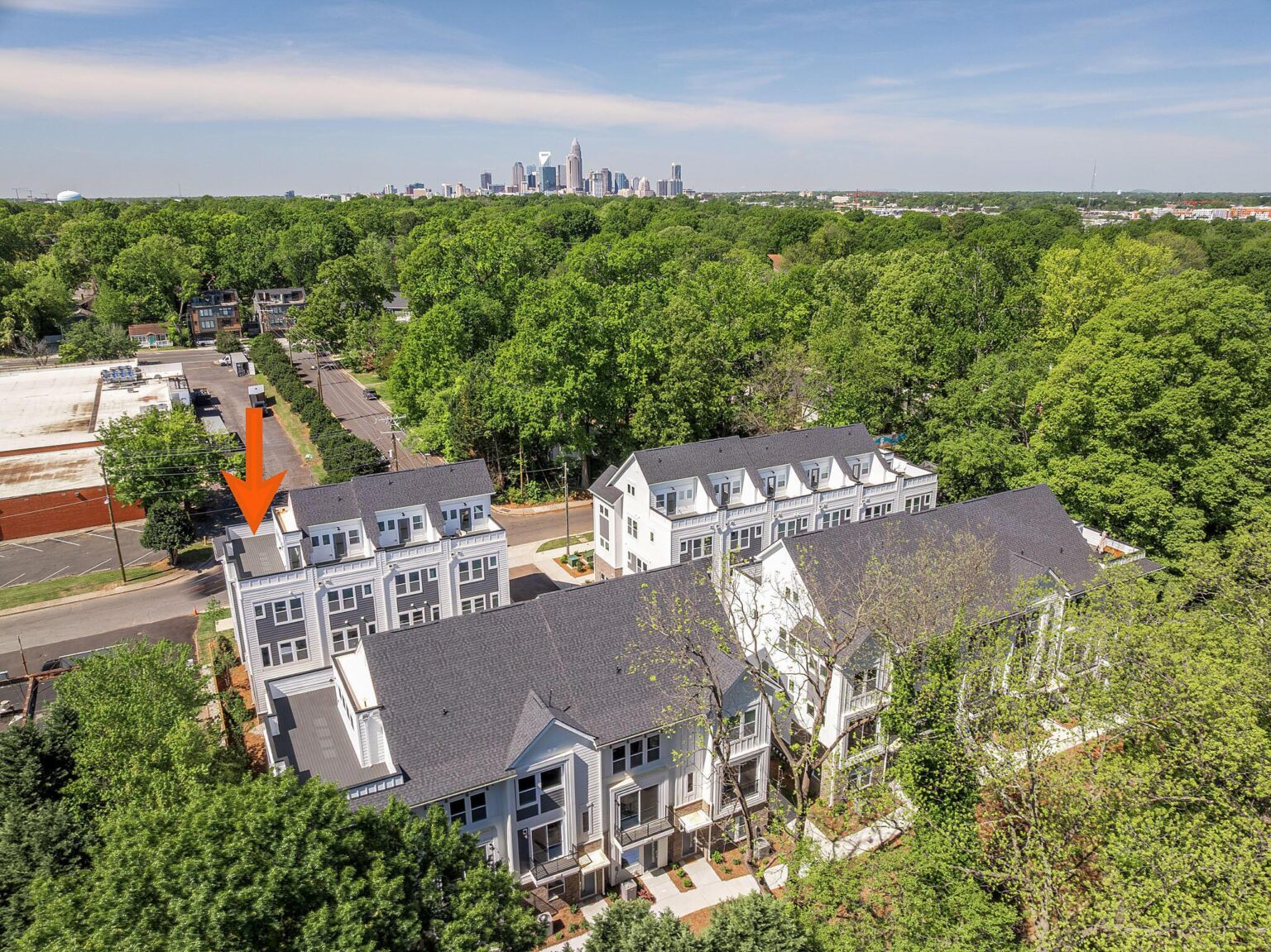 NoDa end-unit townhome maximizes natural light and outdoor living, with an expansive rooftop terrace spanning the entire top floor, plus a balcony off the Kitchen, which is ideal for an urban herb garden; both outdoor spaces include TREX decking. The rooftop terrace is large enough for multiple gathering spaces; imagine a lounge area, dining space, AND entertaining bar! Nice open layout on the 2nd floor makes entertaining a breeze. The kitchen features quartz counters, 42″ white cabinets, LED under-cabinet lights, trash pullout, & GE stainless steel appliances with a gas range & French door fridge included, plus large stainless steel undermount sink. The nook by the staircase is large enough to have a desk for a home office area. The 3rd floor has 2 bedrooms plus laundry with a GE stacked washer/dryer included. The Premier bath includes a large tiled shower w/ semi-frameless glass, a raised-height vanity w/ quartz counters & white painted cabinets, plus tiled floors. The secondary bath has white cabinets, quartz counter, and tiled floor. Enjoy features such as 9′ ceilings throughout, 2 ceiling fans, 2″ blinds, and modern lighting. LVP floors are throughout the 1st and 2nd floor plus 3rd floor hall & laundry, with oak treads on stairs. 2-car tandem garage plus private driveway for extra parking. Easy access to N. Davidson St. and Plaza Midwood, and minutes from Uptown Charlotte and the LYNX light rail. Restaurants and shops are within walking distance as well.