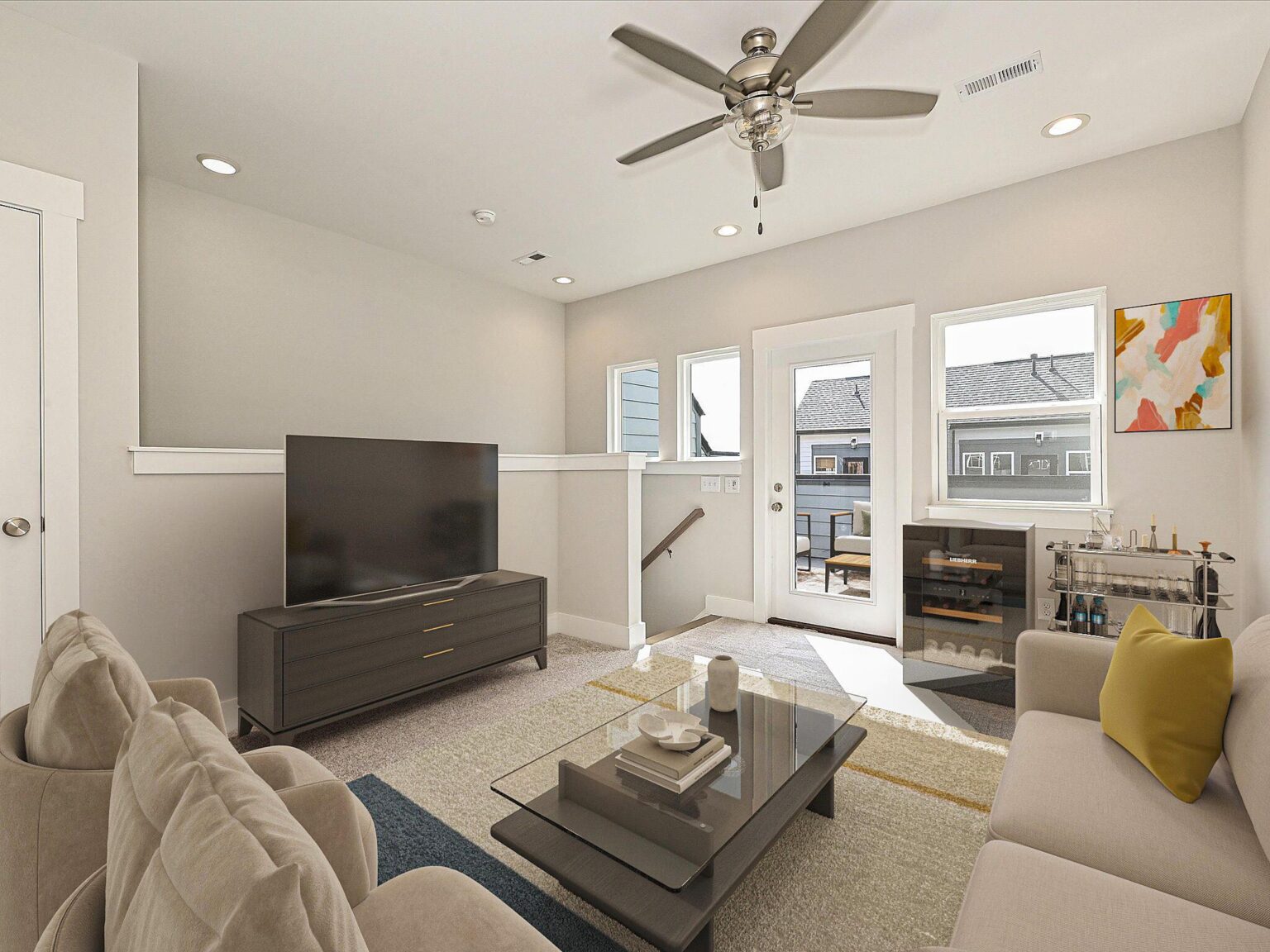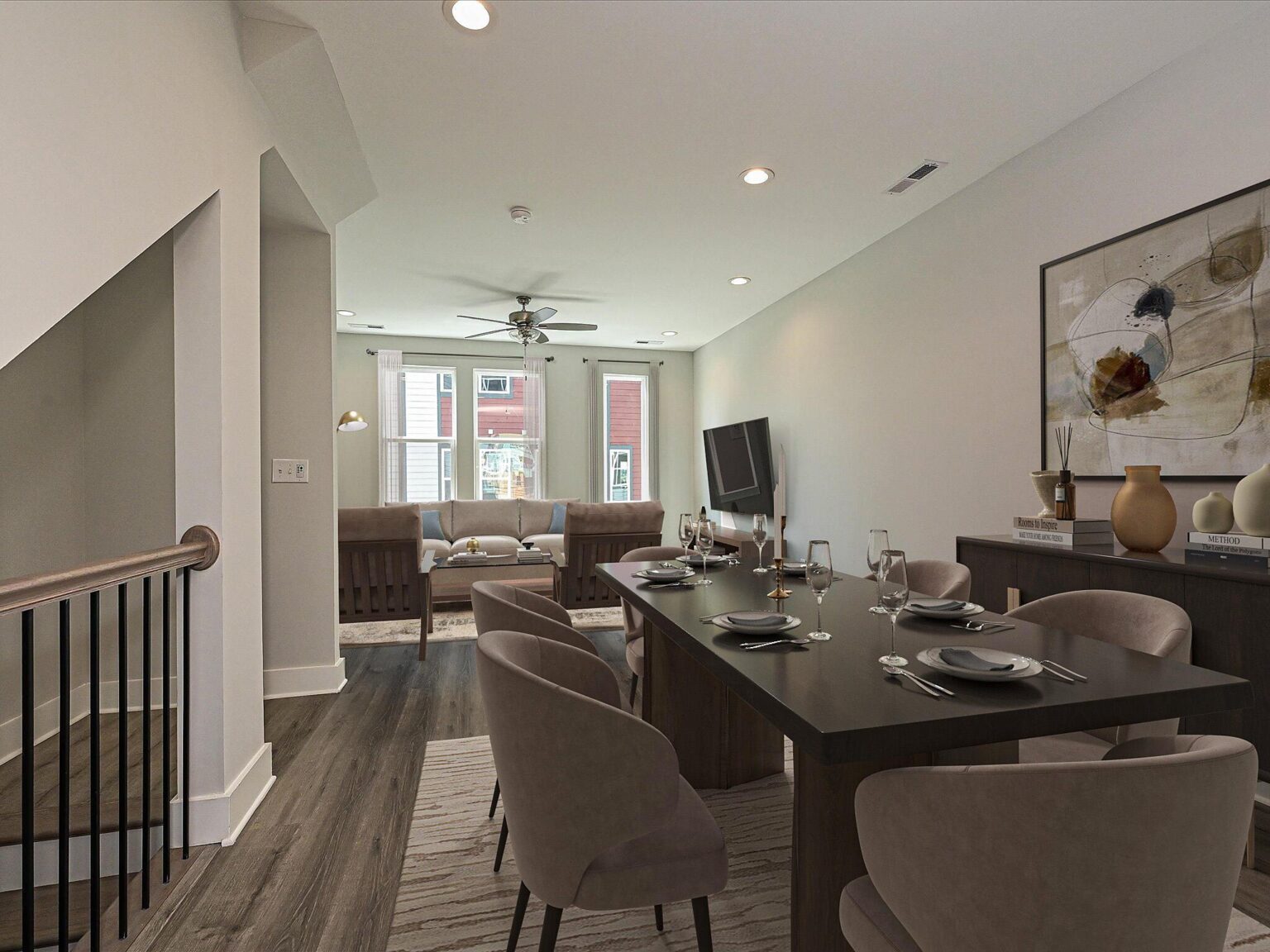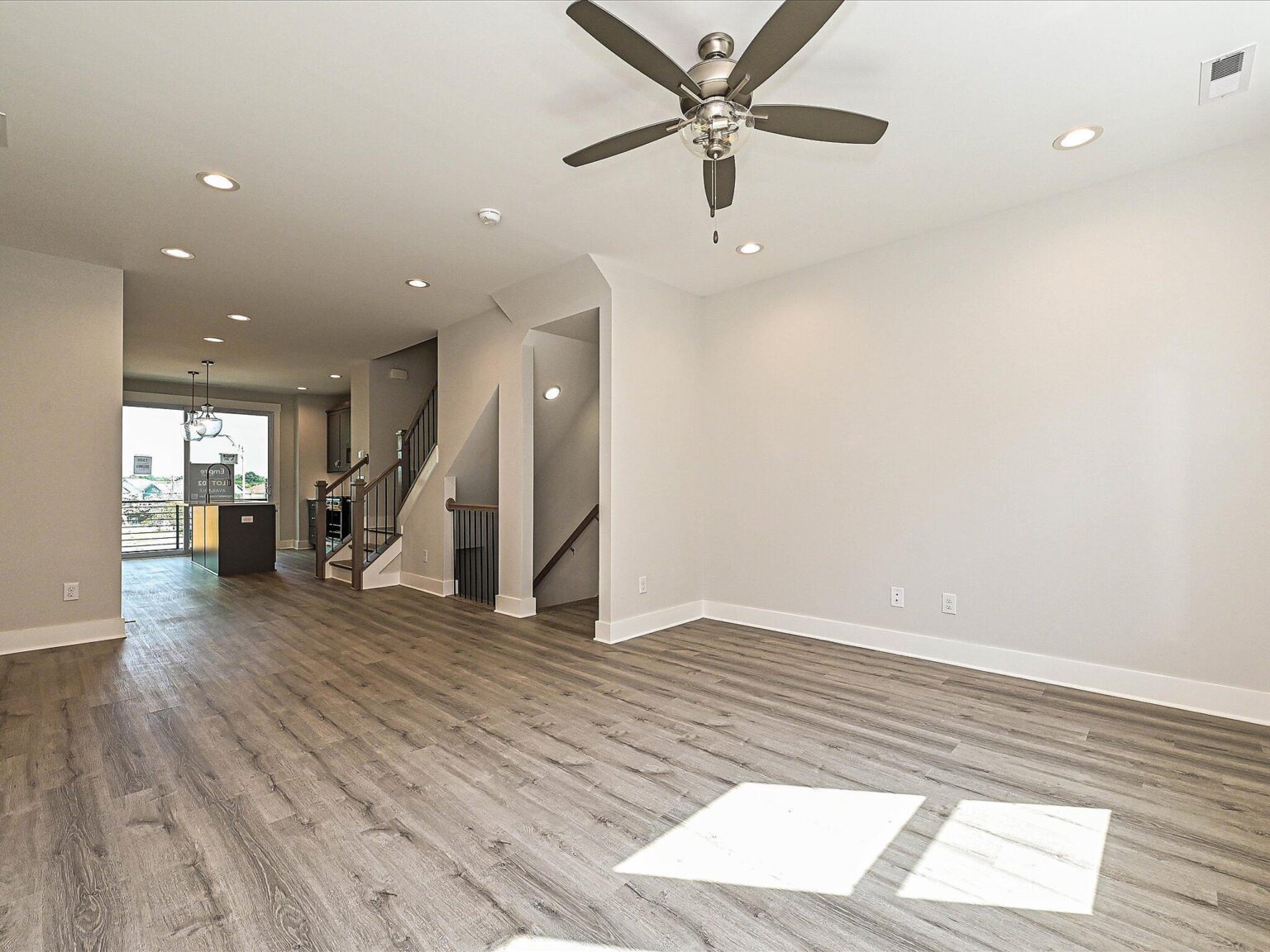 Enjoy your view of the Uptown Charlotte skyline in this versatile 4-story townhome, featuring a top floor bonus bedroom and rooftop terrace, plus first floor Flex room with powder! The open layout of the second floor makes gatherings a breeze. Or meet friends at Camp North End, located just across the street. The Kitchen features 42″ grey cabinets with quartz counters, backsplash, under-cabinet lights, trash pullout, pantry cabinet, and GE stainless steel appliances with a gas range, plus large undermount stainless sink. Full baths include grey cabinets, quartz counters, and tiled floors, with a large tiled shower in the Premier Bath with semi-frameless glass. Low maintenance LVP floors are throughout the first and second floors, plus third floor hallway, with tile in full baths and laundry closet. Oak treads are on the stairs. 52″ ceiling fans are in the flex, bonus bedroom, living and Premier bedroom. 9′ ceilings throughout; 1-car garage plus on-street parking is available. Enjoy close proximity to Uptown Charlotte.