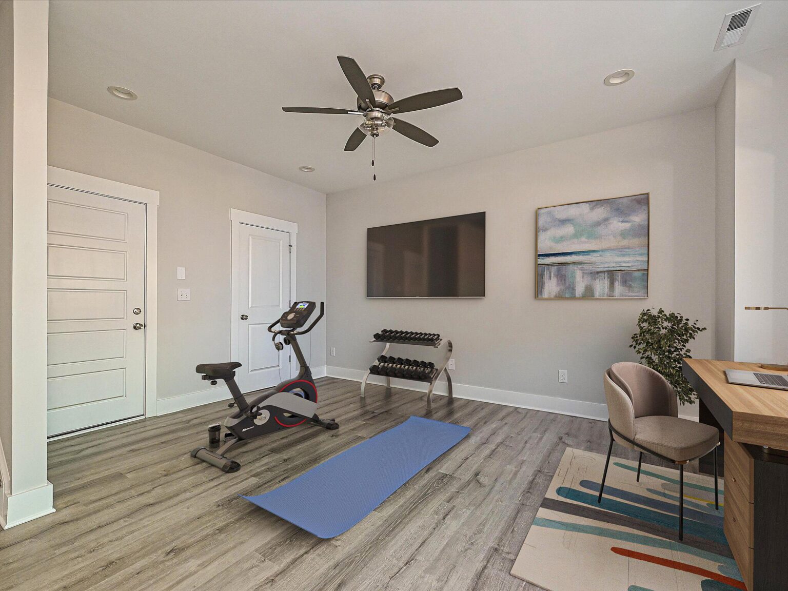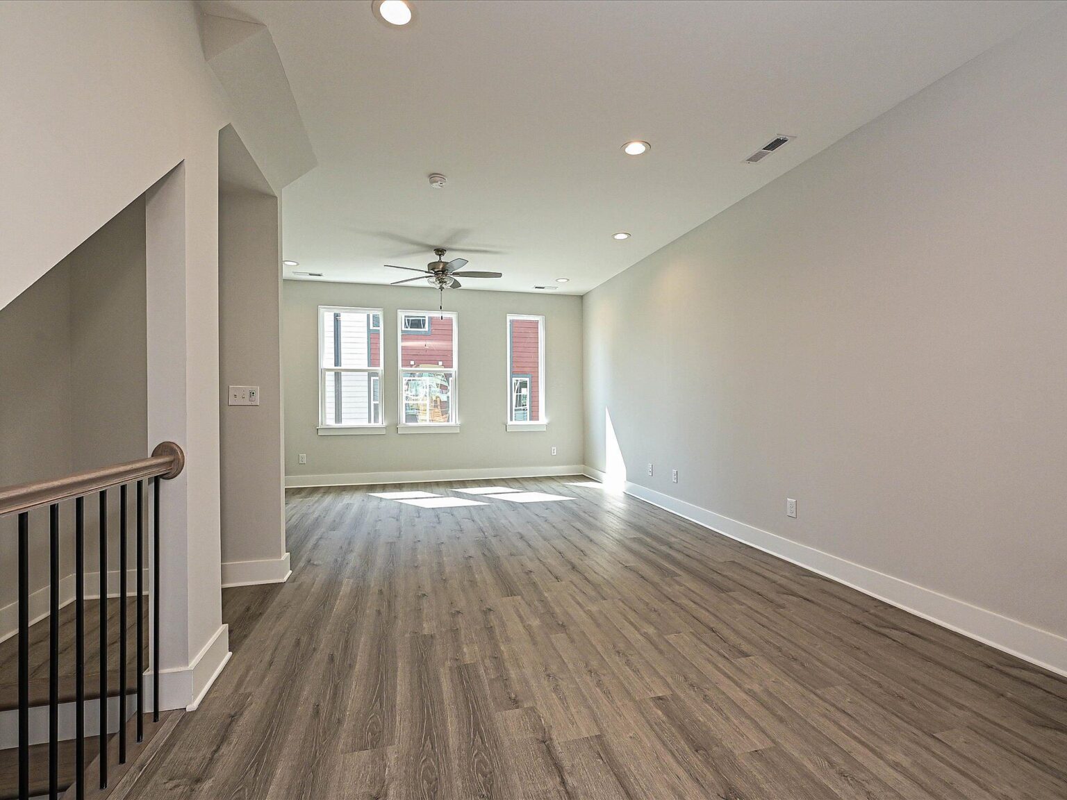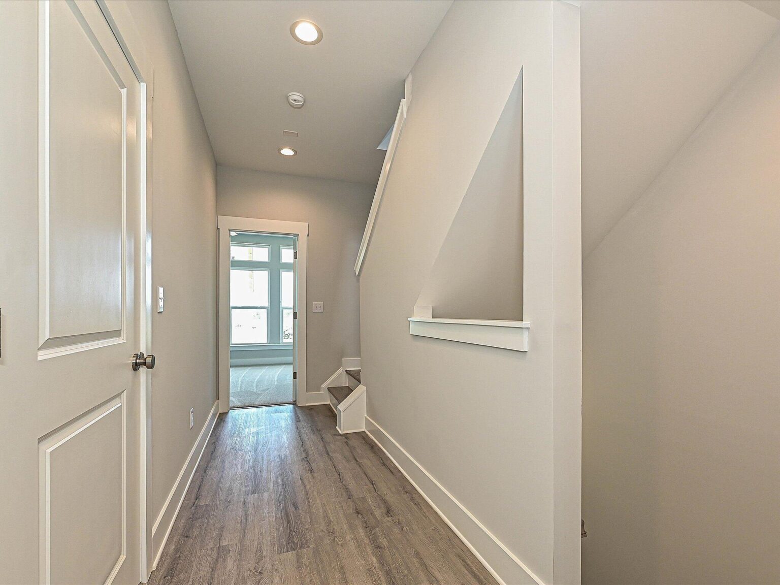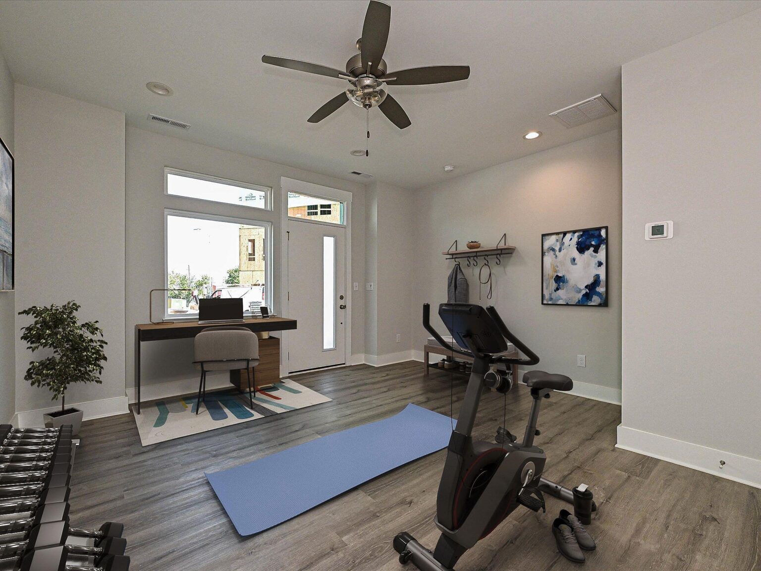 Enjoy your view of the Uptown Charlotte skyline in this versatile 4-story townhome, featuring a top floor bonus bedroom and rooftop terrace, plus first floor Flex room with powder! The open layout of the second floor makes gatherings a breeze. Or meet friends at Camp North End, located just across the street. The Kitchen features 42″ grey cabinets with quartz counters, backsplash, under-cabinet lights, trash pullout, pantry cabinet, and GE stainless steel appliances with a gas range, plus large undermount stainless sink. Full baths include grey cabinets, quartz counters, and tiled floors, with a large tiled shower in the Premier Bath with semi-frameless glass. Low maintenance LVP floors are throughout the first and second floors, plus third floor hallway, with tile in full baths and laundry closet. Oak treads are on the stairs. 52″ ceiling fans are in the flex, bonus bedroom, living and Premier bedroom. 9′ ceilings throughout; 1-car garage plus on-street parking is available. Enjoy close proximity to Uptown Charlotte.