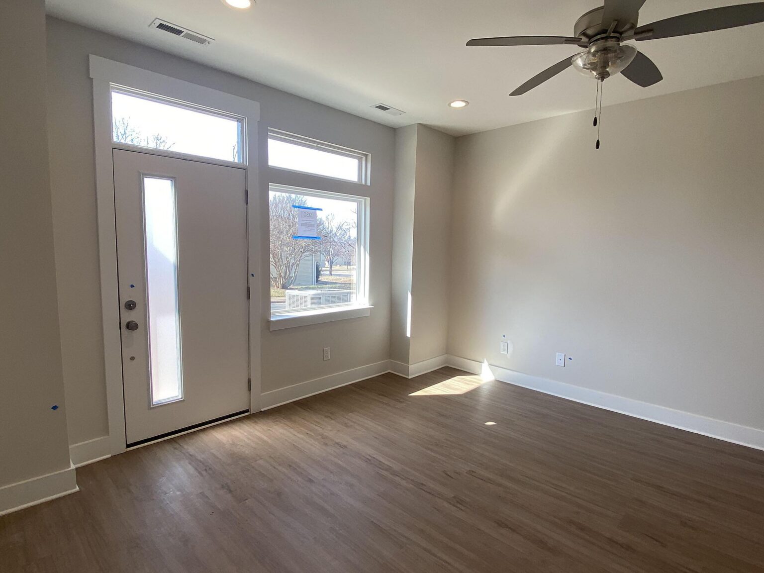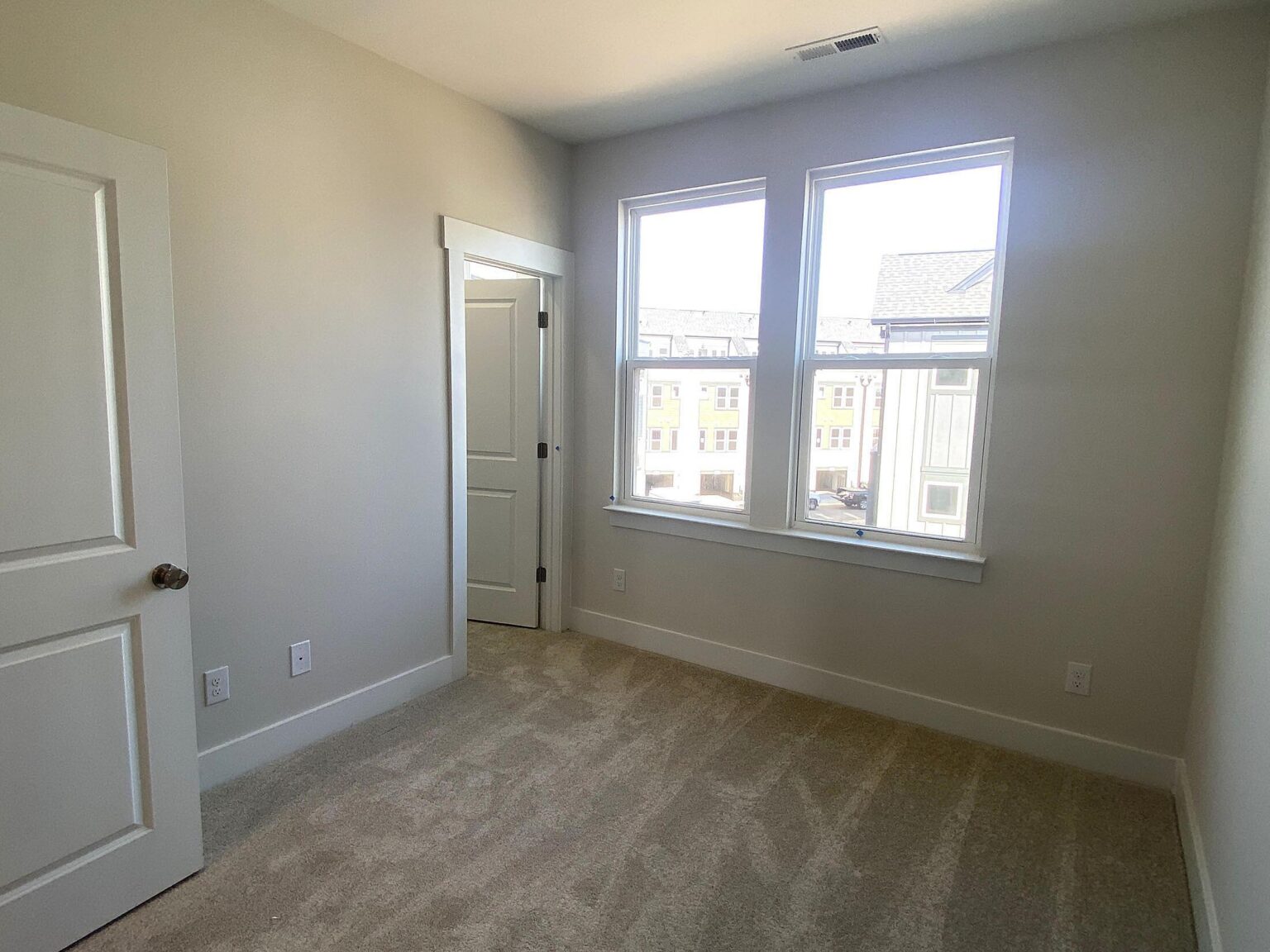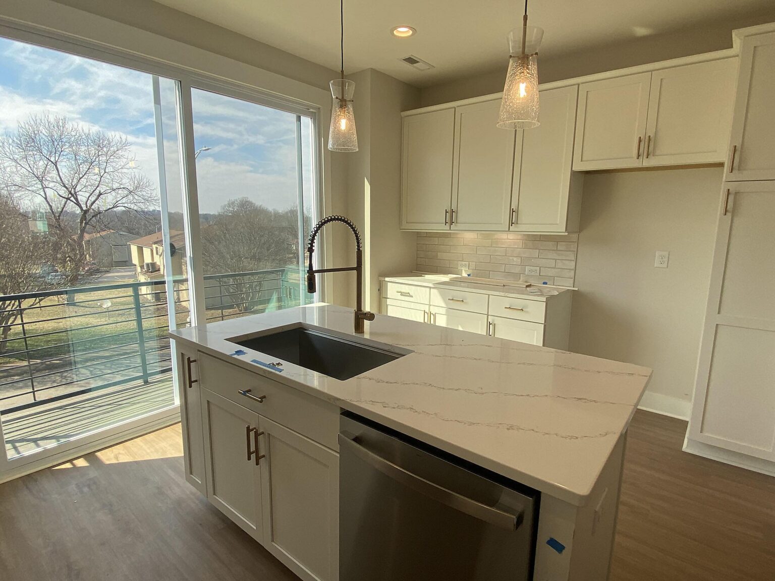 This is a versatile 4-story townhome, featuring a top floor Bonus bedroom and rooftop terrace, plus first floor Flex room with powder! The open layout of the second floor makes entertaining a snap, or meet friends at Camp North End just across the street. Off the kitchen is a small terrace with seasonal city skyline views. The Kitchen features 42″ white painted cabinets with brushed gold hardware, quartz counters, backsplash, under-cabinet lights, trash pullout, pantry cabinet, and GE stainless steel appliances with a gas range, plus large undermount stainless sink. Laundry is conveniently located on the 3rd floor w/ 2 bedrooms. Premier Bath has light grey painted cabinets, quartz counters, tiled floors and a tiled shower with semi-frameless glass. Guest hall bath includes white painted cabinets, quartz counter, and tiled floor. Low maintenance LVP floors are throughout the first and second floors, plus third floor hallway, with tile in full baths, 1st floor powder, & laundry. Oak treads are on the stairs. 52″ ceiling fans are in the flex, bonus bedroom, living and Premier bedroom. 9′ ceilings throughout; 1-car garage & driveway plus on-street parking is available. Enjoy close proximity to Uptown Charlotte.