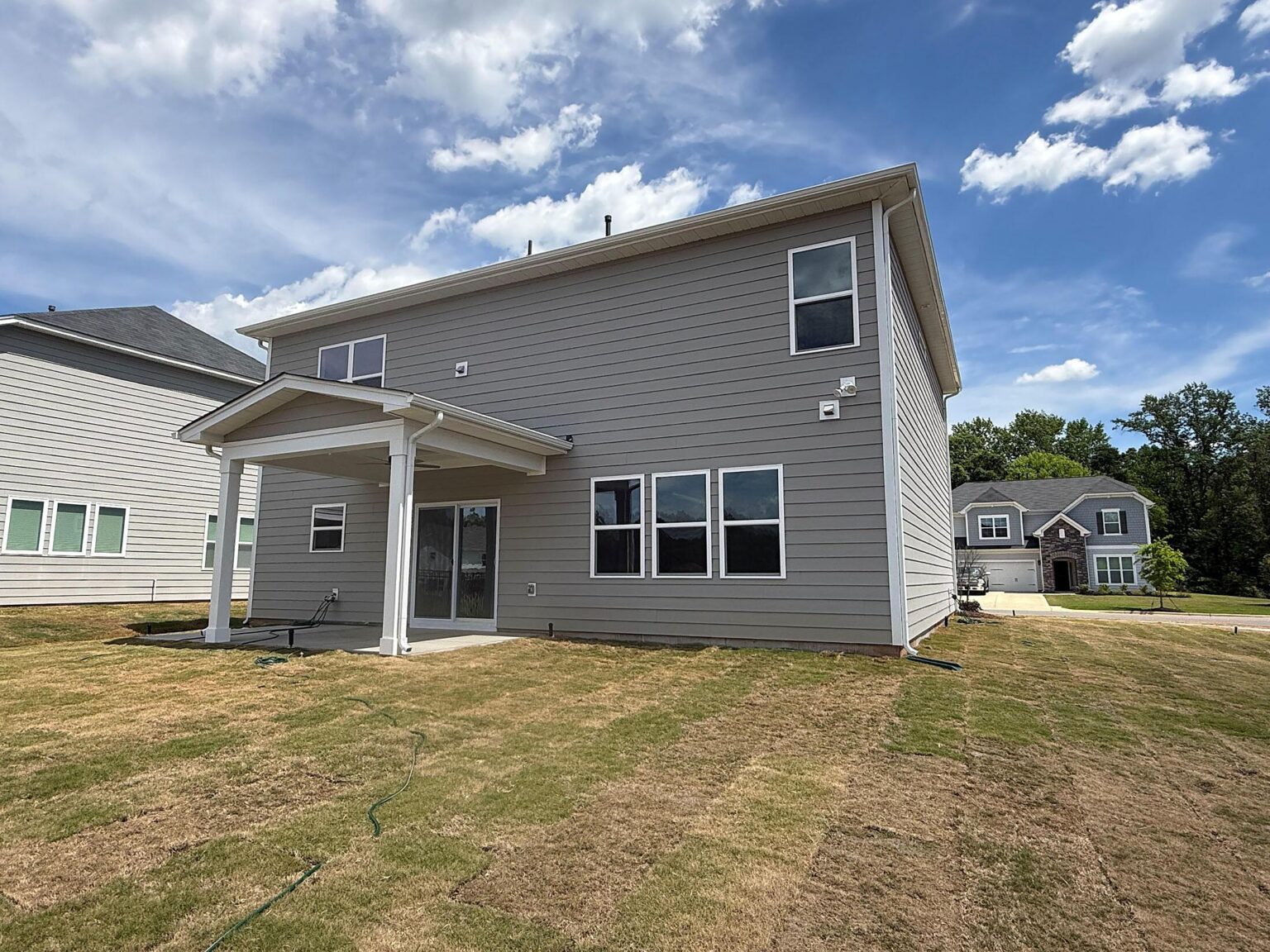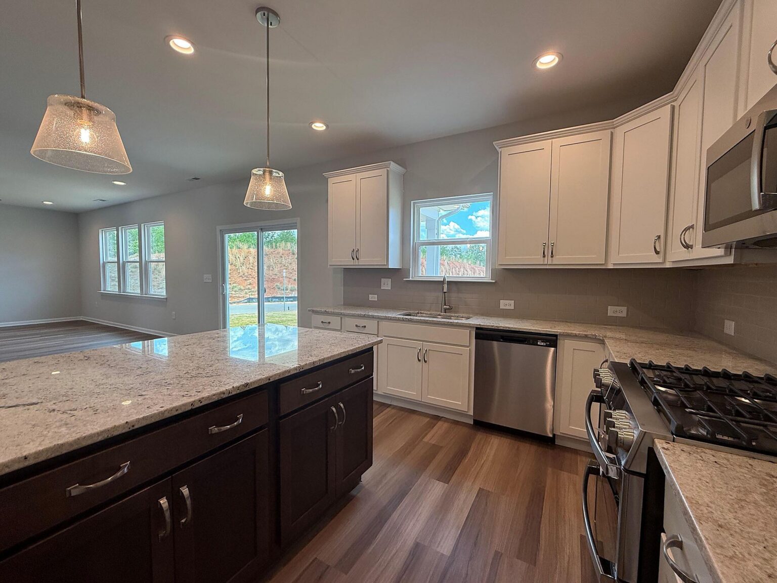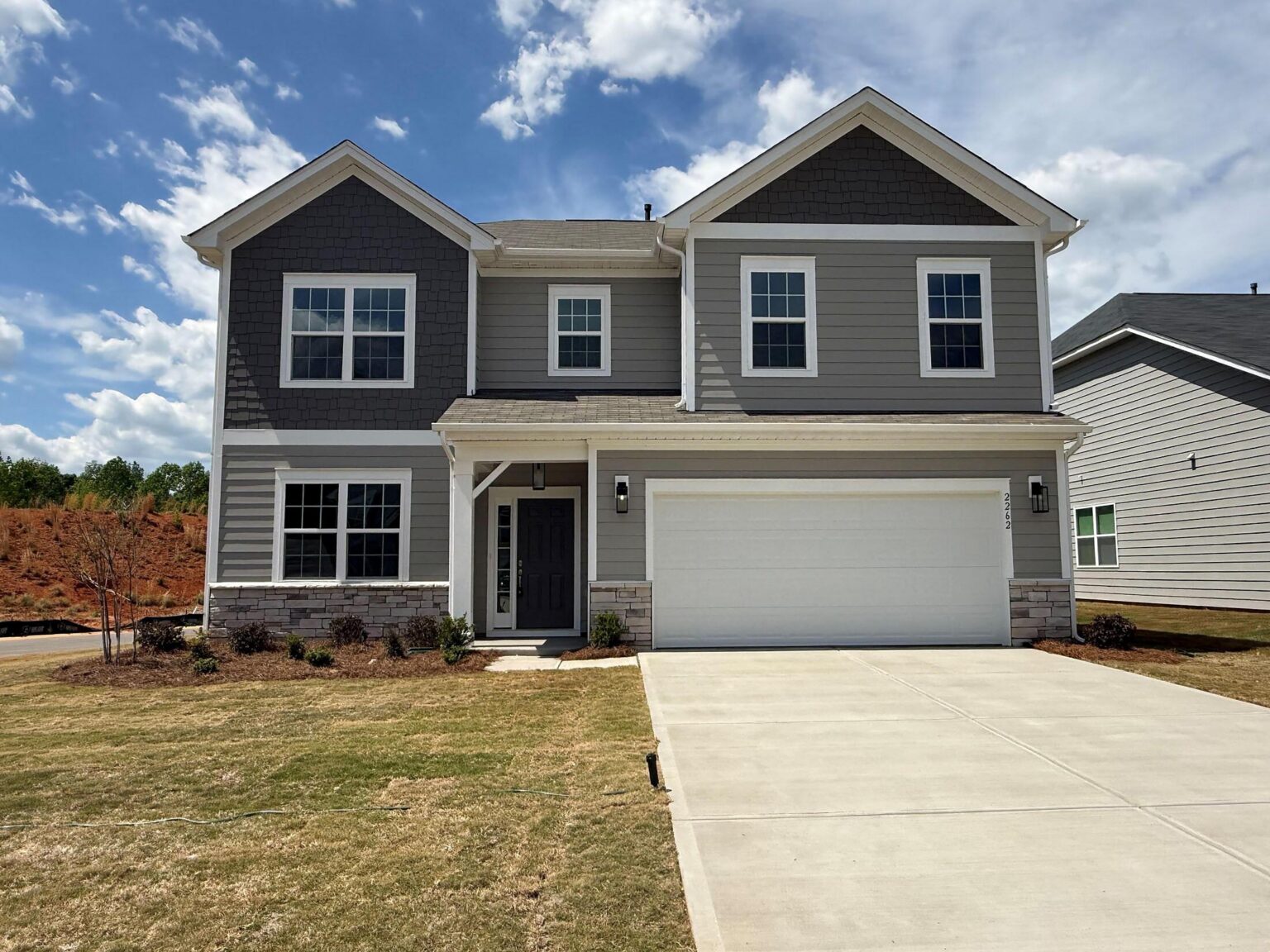Move in before summer with this new home in Gastonia, minutes from the local YMCA and easy side-road access to the Charlotte International Airport. This home features Hardie® cement siding with stone accents and a rear covered porch, situated on a .22 acre homesite. The first-floor features a guest bedroom and full bath, and open-concept living with the family room, dining and kitchen flowing together. The L-shaped kitchen features granite counters, ivory painted perimeter cabinets with nutmeg-stained cabinets at the island, soft-close doors and drawers, tile backsplash, and GE stainless steel appliances with a gas range. Tucked just off the kitchen is a mudroom and walk-in pantry. Upstairs, you'll find a spacious Loft and the Primary Suite, complete with two walk-in closets and a 5-piece bath with a large tiled shower with semi-frameless glass, charcoal-stained cabinets, granite counters, and 12" x 24" tiled floors. Secondary baths include quartz counters, white cabinets, and tiled floors. Low-maintenance LVP floors are throughout most of the first floor plus upstairs hall and laundry room, with oak treads on the stairs. Energy-saving features include a tankless hot water heater in the garage, plus radiant barrier sheathing. This community includes a pool and tot lot, and is located near several greenways.