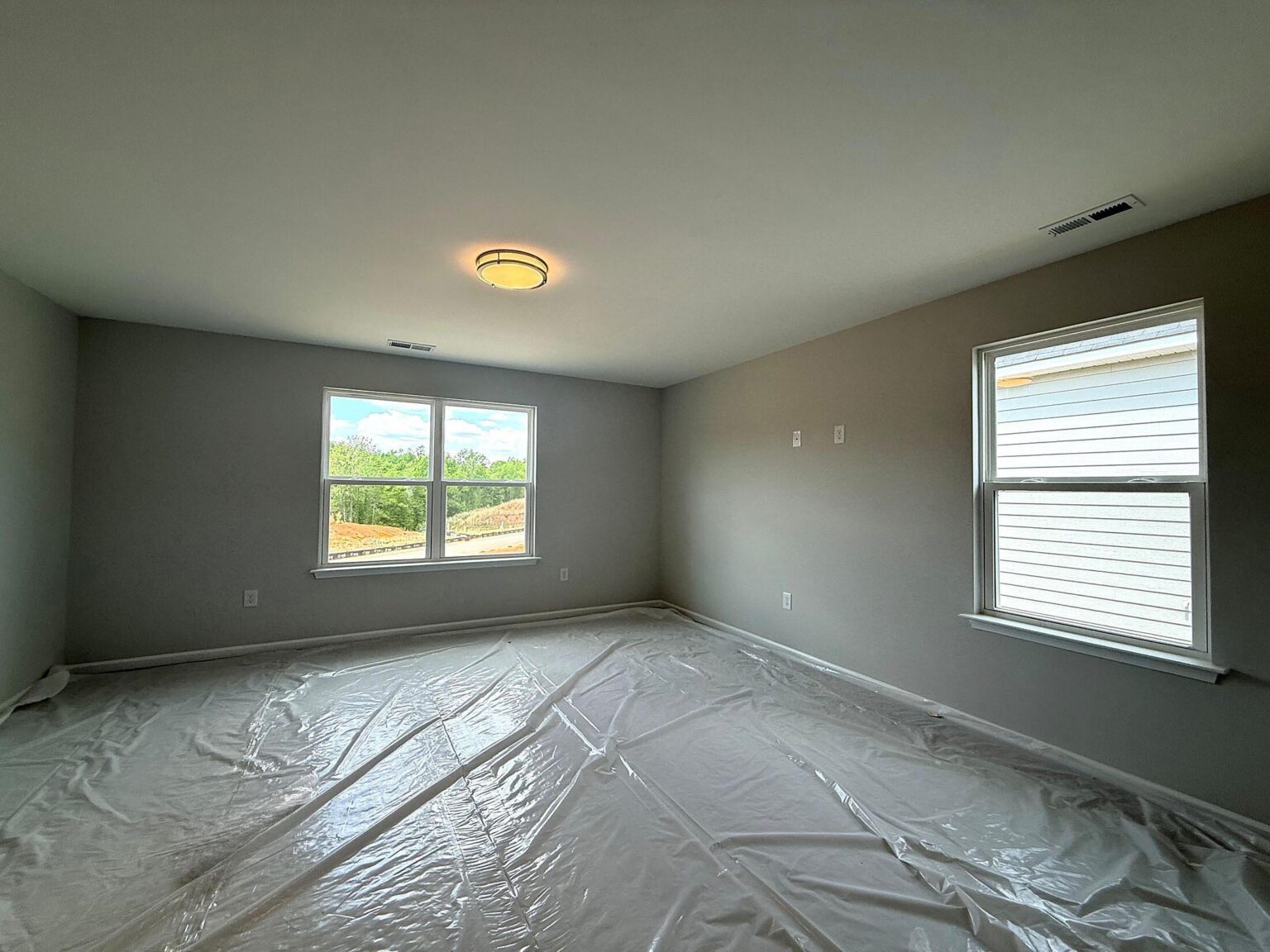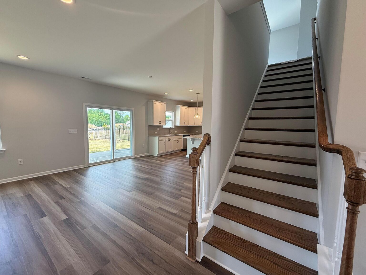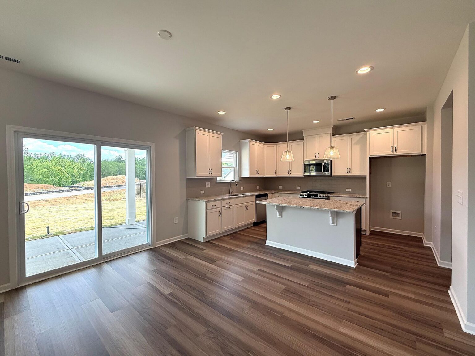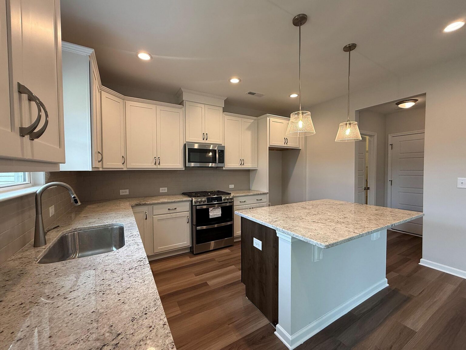 Move in before summer with this new home in Gastonia, minutes from the local YMCA and easy side-road access to the Charlotte International Airport. This home features Hardie® cement siding with stone accents and a rear covered porch, situated on a .22 acre homesite. The first-floor features a guest bedroom and full bath, and open-concept living with the family room, dining and kitchen flowing together. The L-shaped kitchen features granite counters, ivory painted perimeter cabinets with nutmeg-stained cabinets at the island, soft-close doors and drawers, tile backsplash, and GE stainless steel appliances with a gas range. Tucked just off the kitchen is a mudroom and walk-in pantry. Upstairs, you'll find a spacious Loft and the Primary Suite, complete with two walk-in closets and a 5-piece bath with a large tiled shower with semi-frameless glass, charcoal-stained cabinets, granite counters, and 12" x 24" tiled floors. Secondary baths include quartz counters, white cabinets, and tiled floors. Low-maintenance LVP floors are throughout most of the first floor plus upstairs hall and laundry room, with oak treads on the stairs. Energy-saving features include a tankless hot water heater in the garage, plus radiant barrier sheathing. This community includes a pool and tot lot, and is located near several greenways.
