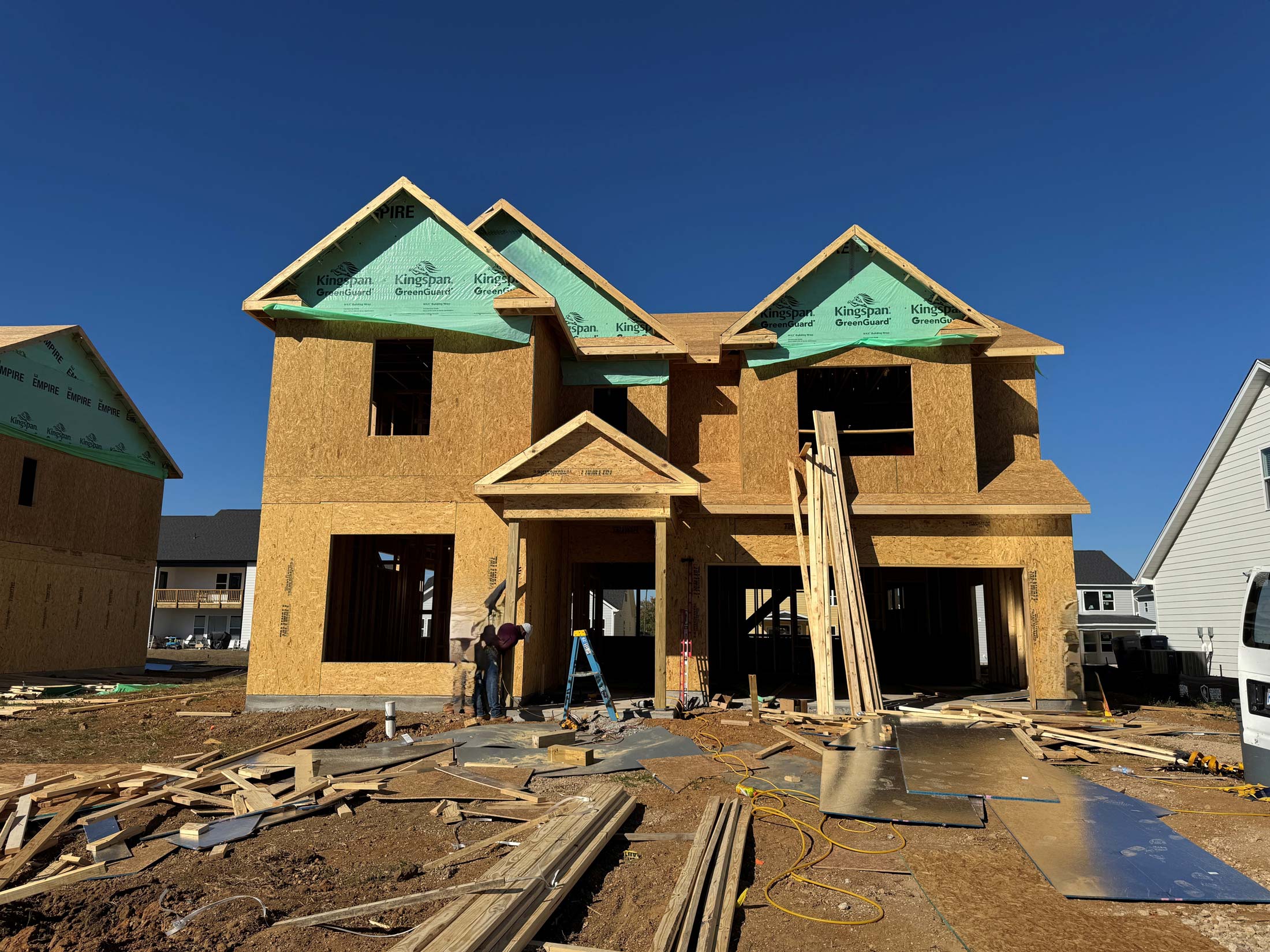 New Craftsman-style home in Harrisburg, featuring a .25-acre flat homesite in an amenity-rich community by Stallings Road Park. Enjoy the open-concept layout and abundant windows, first-floor guest bedroom and bathroom with walk-in tiled shower, Flex room with office, and luxuriously spacious upstairs Premier Suite. The Family room features a gas fireplace flanked by 2 niches for your personal touch, and a large Kitchen with split cooking. There are 42″ creamy-grey cabinets with soft-close doors & drawers, double trash pullout, GE stainless steel appliances with a Profile 36″ gas cooktop, wall oven, and microwave, plus chimney extraction hood vented outside, and a large walk-in pantry. Tucked off the kitchen is a mudroom with built-in drop zone. Enjoy the outdoors from the large rear covered patio. Upstairs is a spacious Rec room and laundry with tiled floor. Get away from it all in the Premier Suite, with a tray ceiling and huge walk-in closet. The spacious bathroom has a large tiled shower, quartz counters, and tiled floor. Two bedrooms share a Jack & Jill bath. Secondary baths have quartz counters and tiled floors. Medium-toned natural wood color LVP flooring is throughout most of the first floor plus upstairs hall, with oak treads on the stairs. The exterior features Hardie® siding, a carriage-style garage door, and a service side door in the garage. Energy-saving features include a tankless hot water heater and radiant barrier sheathing. Community includes a pool, clubhouse, tot lot, and walking trails.