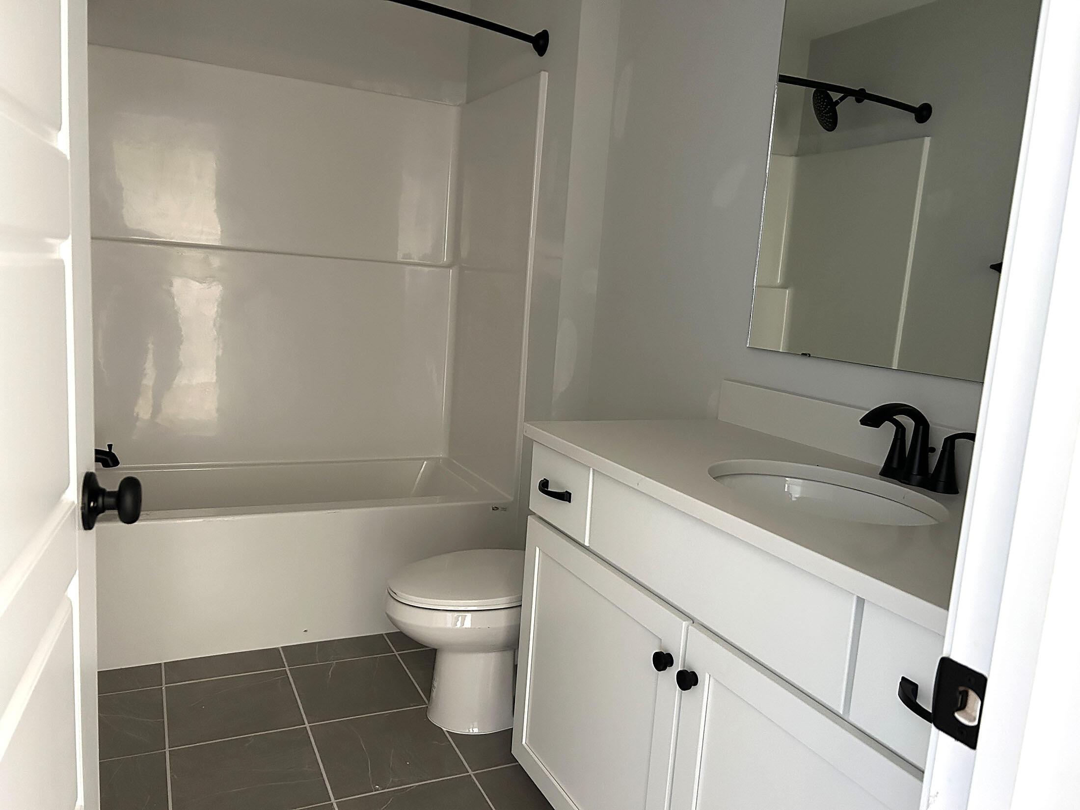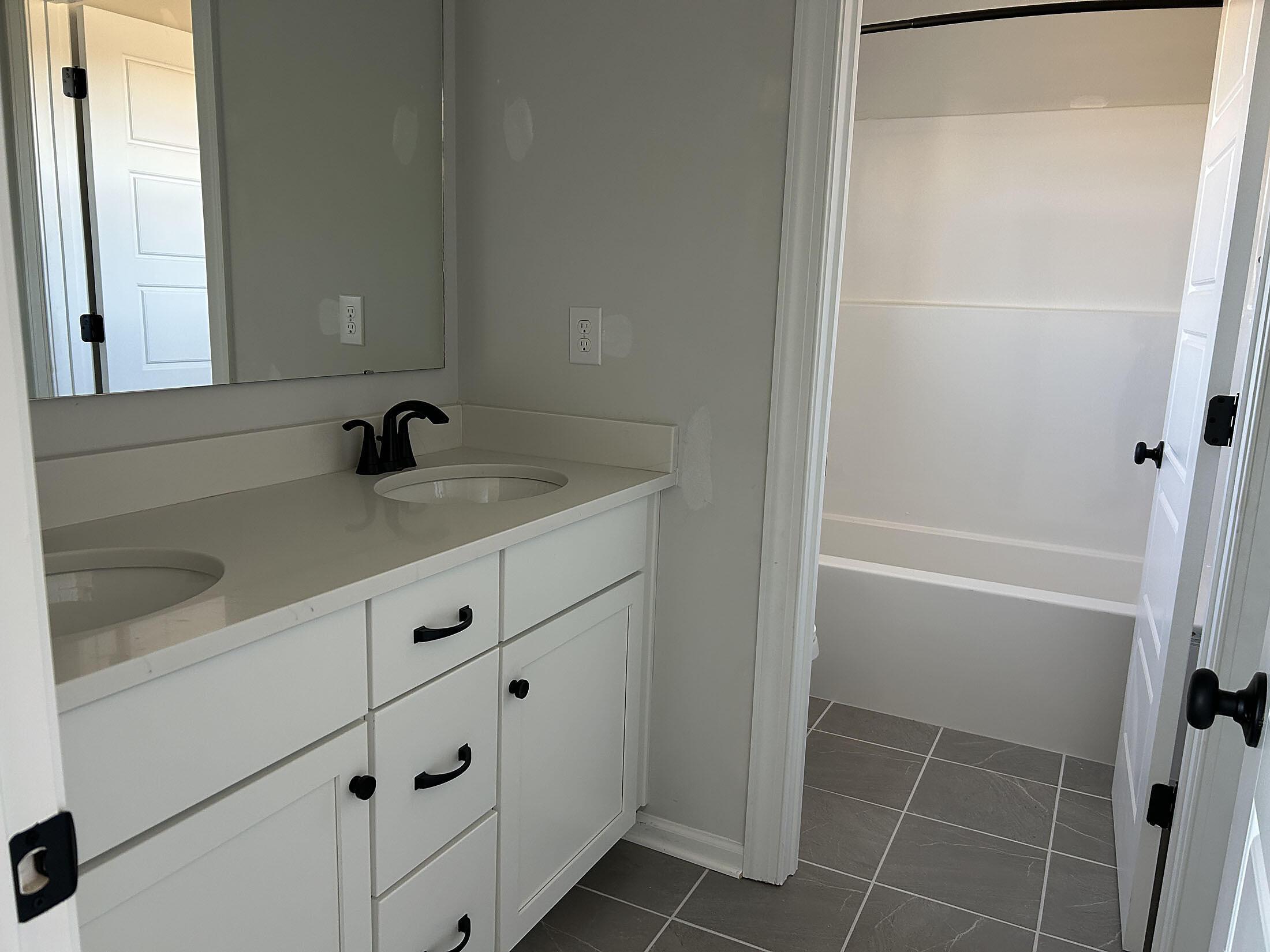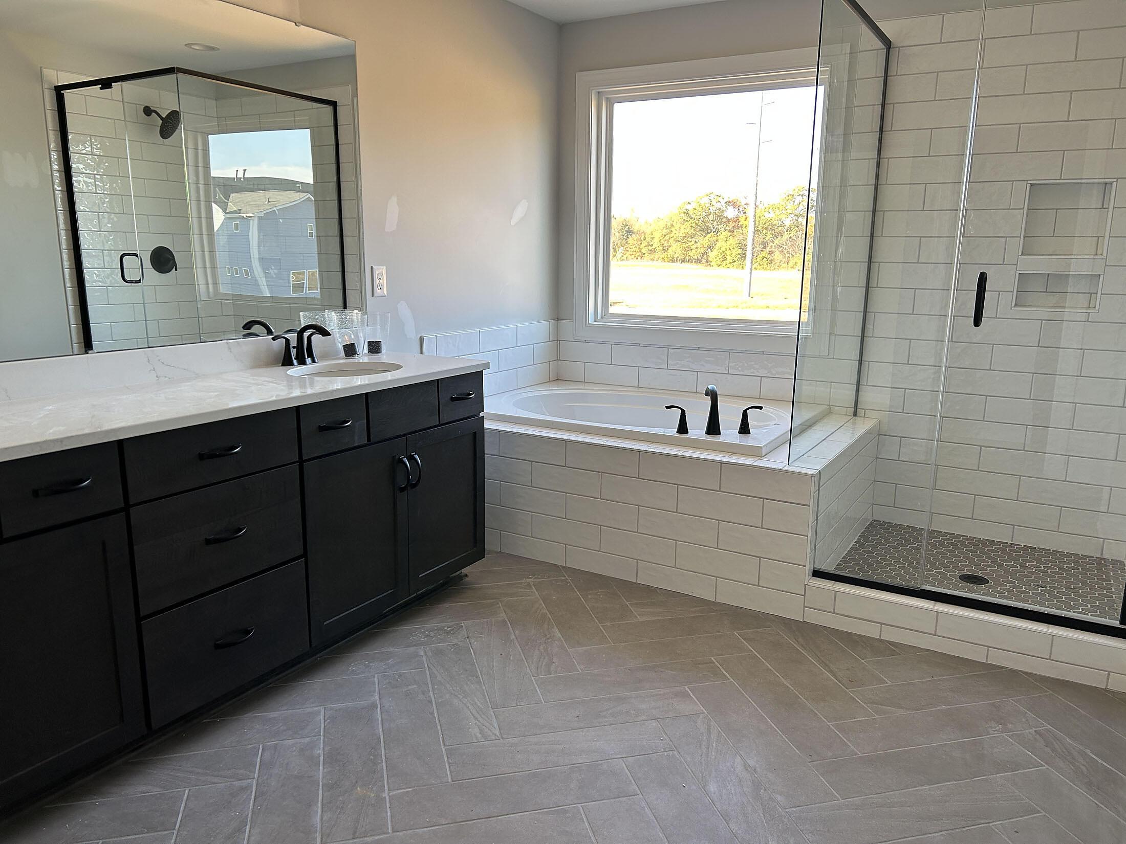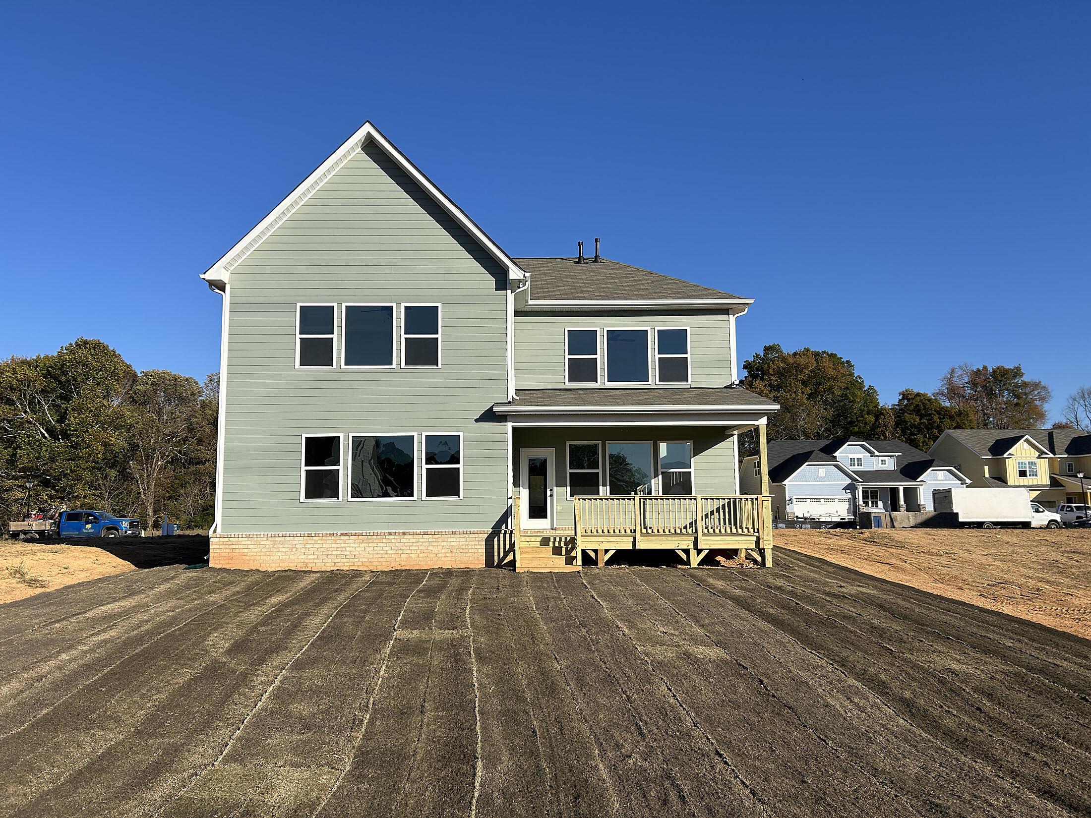 This spacious home faces East, and is situated on a .22 acre homesite with a spacious grassy rear yard. The exterior features Hardie® cement siding with shake and stone accents, a nice front porch, and carriage-style garage doors. The first floor has a guest bedroom and full bath with tiled walk-in shower, and open living space. The Family room offers a gas fireplace flanked by two cabinets, and the large dining area flows to the rear covered deck. Large Kitchen features dark grey painted shaker-style 42″ cabinets, soft close doors and drawers, double trash pullout, quartz counters, 2″ x 6″ white beveled mosaic backsplash, and GE stainless steel appliances with a Profile 36″ gas cooktop and extraction hood vented outside. Off the kitchen is a mudroom with drop zone and walk-in pantry. Upstairs is an open Loft, and a spacious Premier Suite with tray ceiling and large walk-in closet. The bathroom has a soaking tub and separate tiled shower, dark stained shaker cabinets, quartz counter, and tiled floor. Two bedrooms share a Jack & Jill bath. Secondary features include quartz counters and tiled floors. Matte black hardware and lighting throughout. Medium warm-toned LVP flooring throughout much of the main floor and Loft, with tile in all baths and laundry. Stairs have oak-stained treads. Home is located with easy access to the pool amenity (which is under construction) and just down the street from a pocket park.