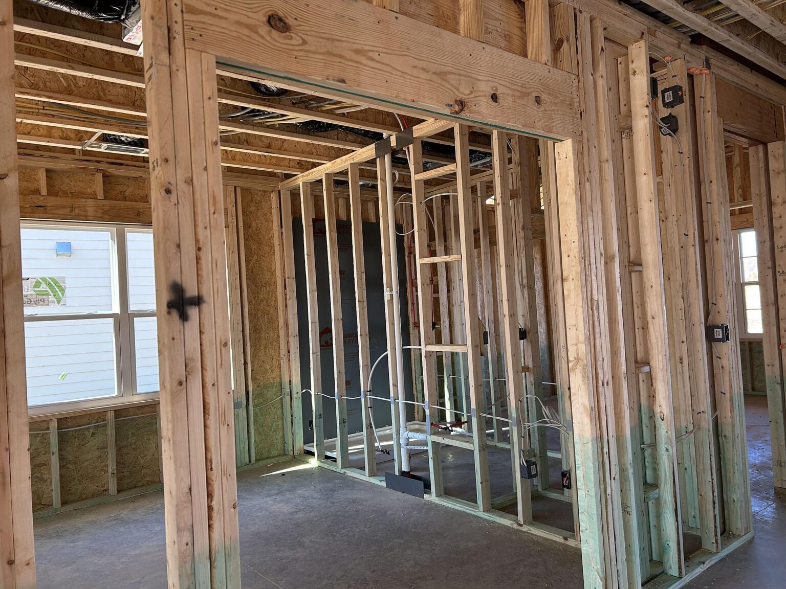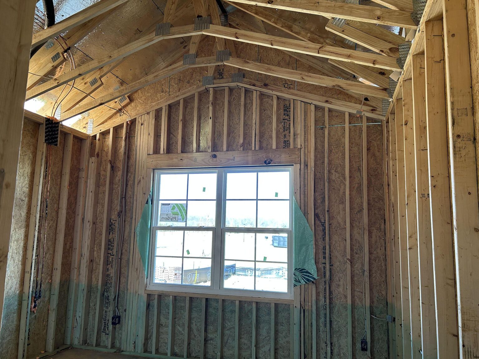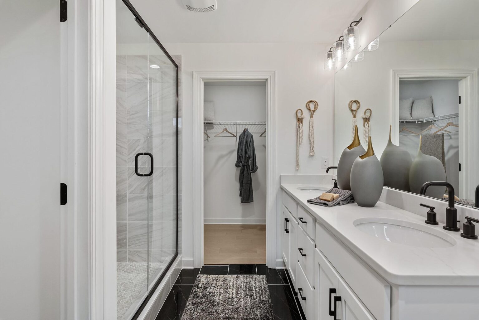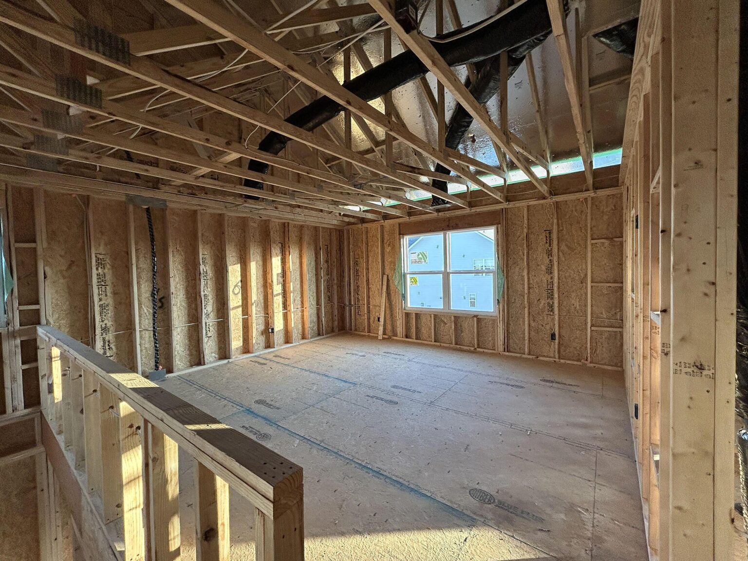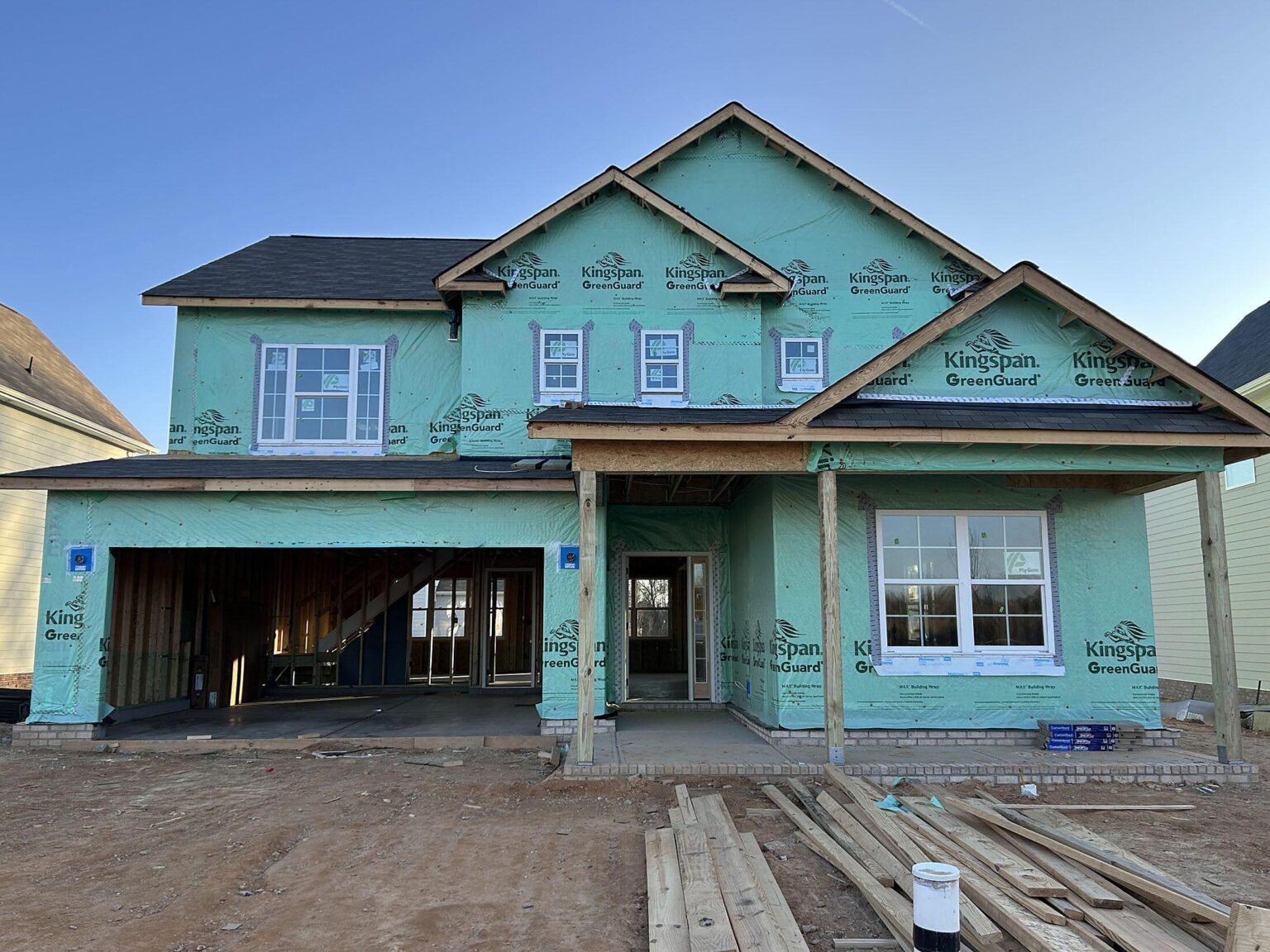 New home in Indian Trail assigned to Porter Ridge schools! It is located across from the community pool and tot lot, which opens this year. This versatile home has plenty of space, with a first-floor guest bedroom with a vaulted ceiling and bathroom with walk-in shower, a flex room with French doors, and a rear covered deck overlooking the spacious, mostly flat backyard. Open layout at the back of the home is great for entertaining. The Kitchen features a pantry closet, 42″ stained shaker-style cabinets with soft-close doors and drawers, a trash pull-out cabinet, quartz counters, tile backsplash, large stainless undermount sink, matte black hardware with a Moen faucet, and GE stainless steel appliances with a 36″ Profile gas cooktop, extraction hood vented outside, and Profile wall oven and microwave. The mudroom has a long storage closet tucked away under the stairs. Upstairs you’ll find a spacious Loft for additional gathering space, 2 secondary bedrooms, and the laundry room. The Premier Suite includes a tray ceiling, two walk-in closets, and bathroom with quartz counter, stained shaker-style cabinets, large tiled shower with 12″ x 24″ tiles, tiled floor, and brushed nickel hardware. Medium-toned LVP flooring is throughout most of the first floor, Loft, secondary baths and laundry, with oak treads on the stairs. The exterior of the home includes Hardie cement siding with brick accents and a covered front porch, plus carriage-style garage doors with a window panel. Home is just down the street from the community natural walking trails.