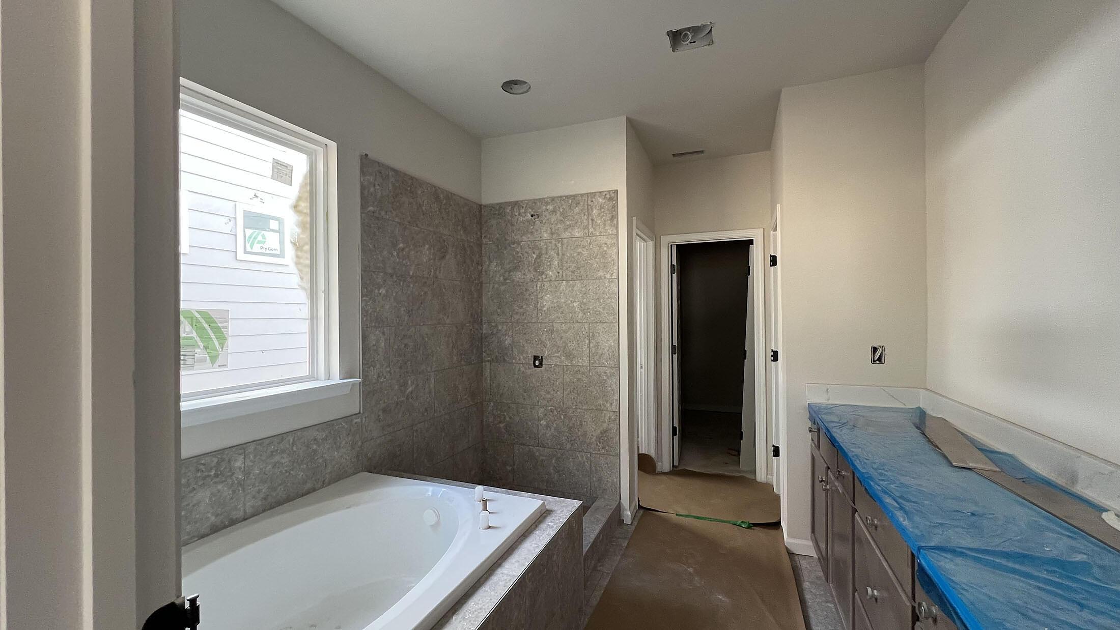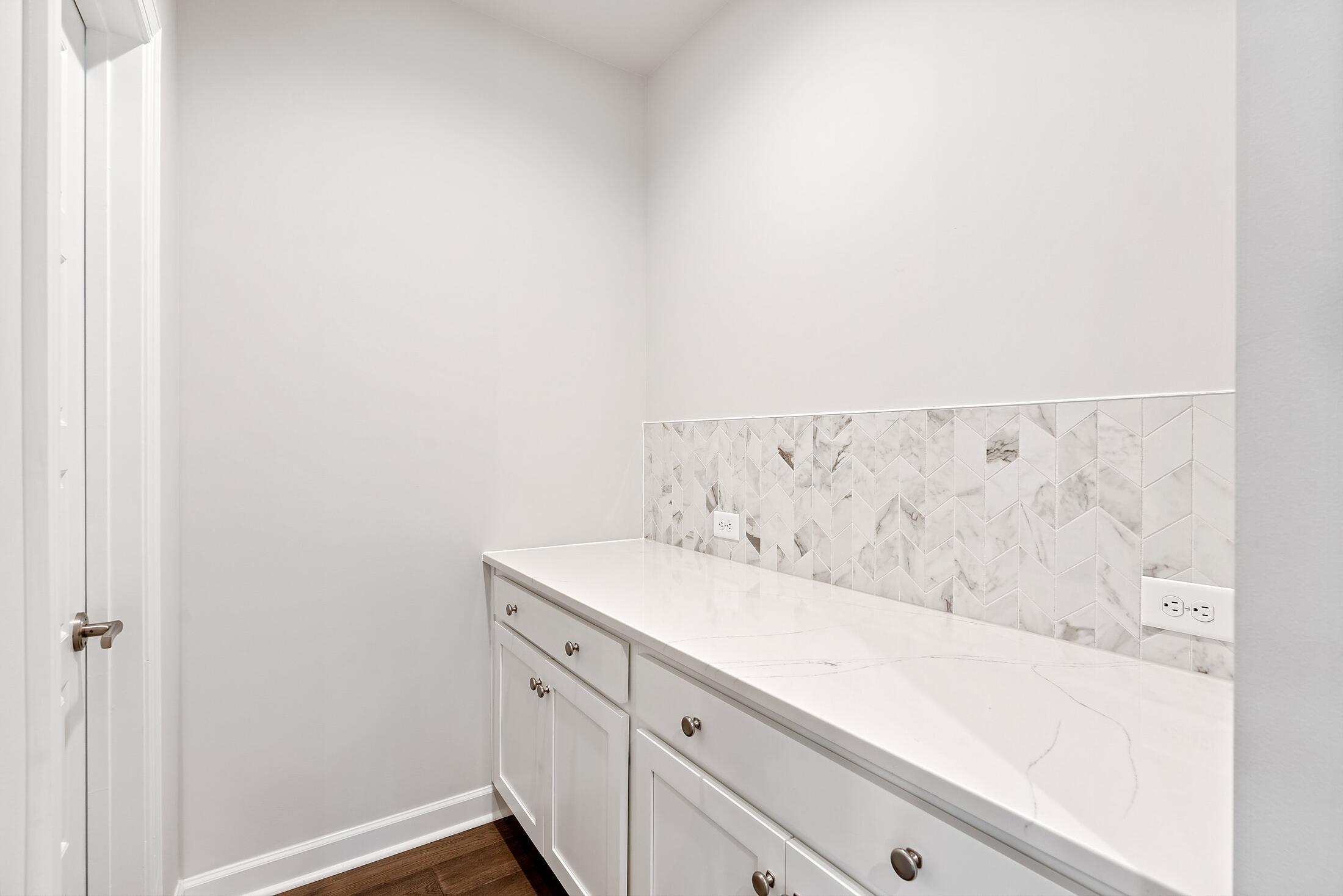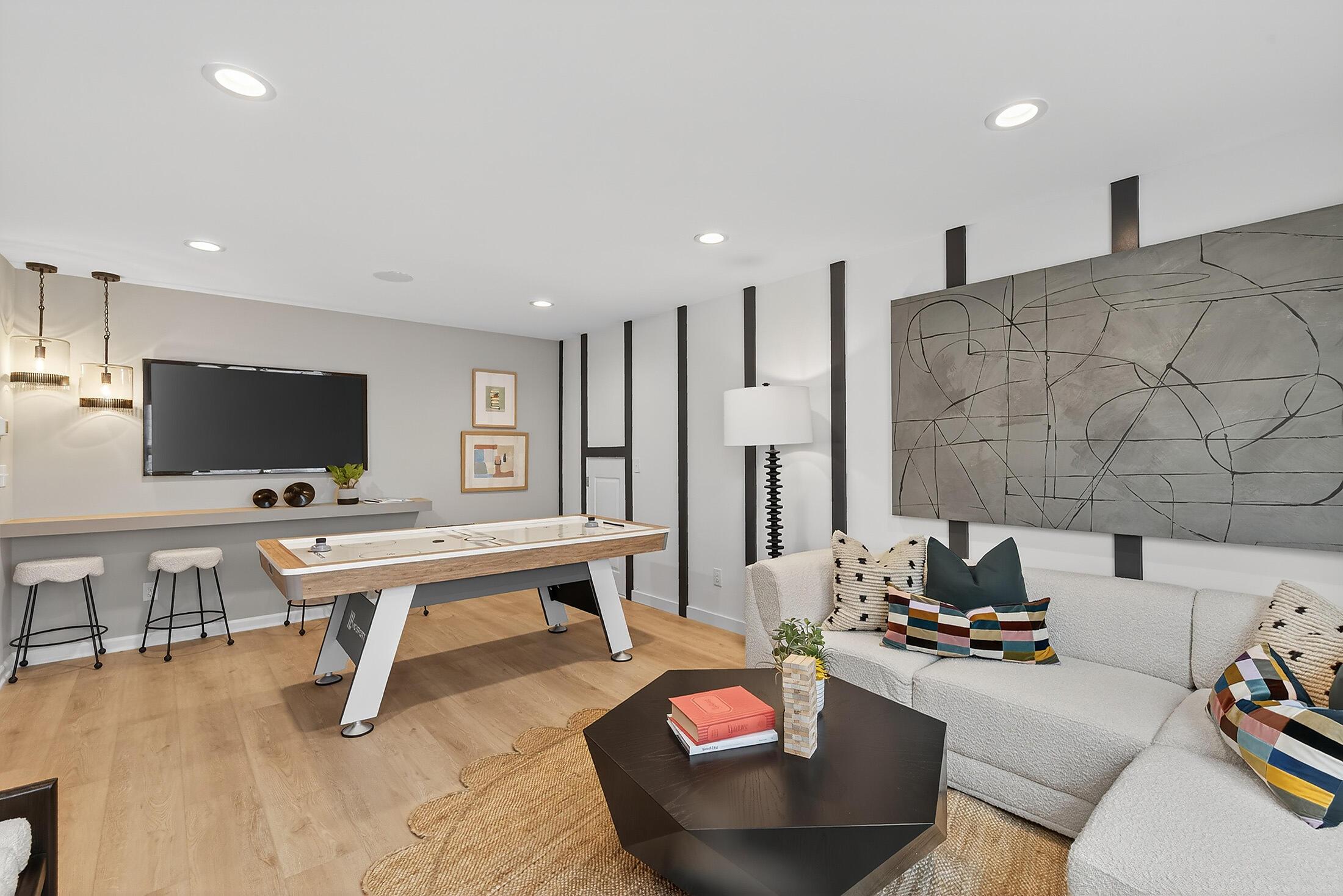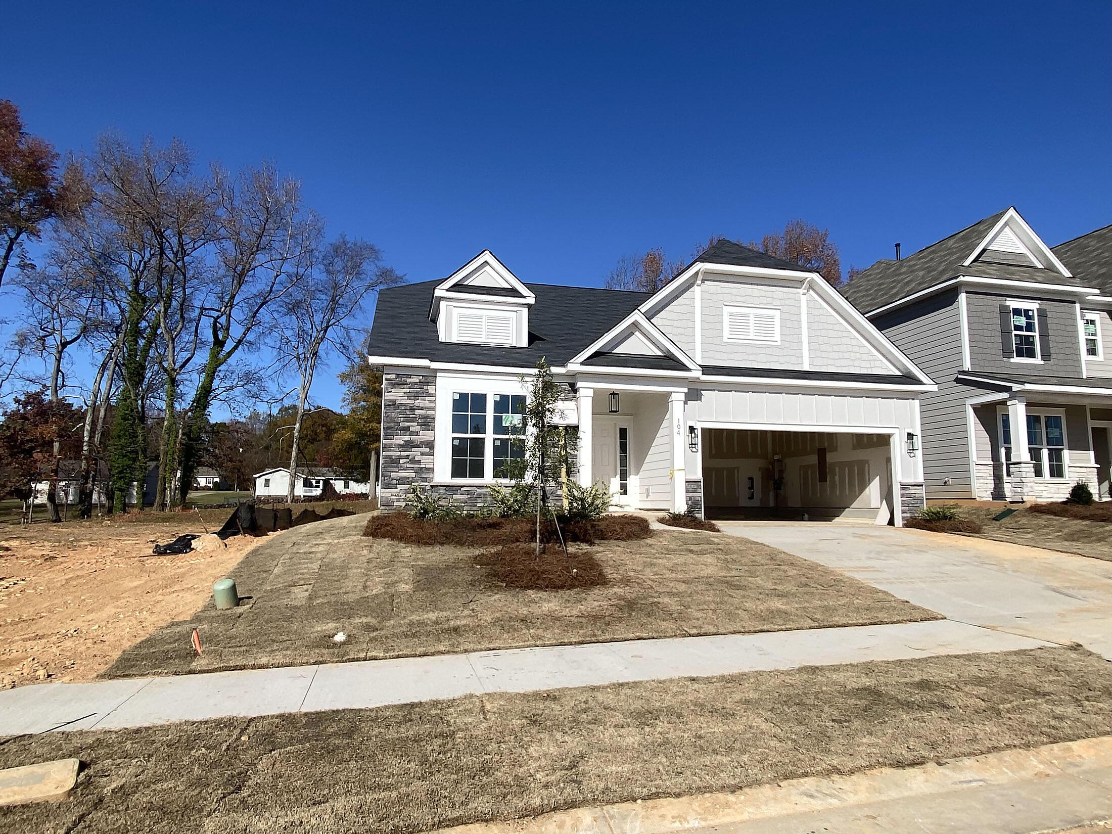 Charming 1.5-story home with a Craftsman exterior featuring Hardie® cement siding with generous stone accents, and a rear covered porch. Off the foyer is a guest bedroom and full bath plus Flex room with French doors. Airy open-concept layout! Kitchen features light-painted perimeter cabinets, granite counters, GE stainless steel appliances with a gas range, tile backsplash, walk-in pantry, stainless steel undermount sink, Moen faucet, and Butler’s Pantry with base cabinets for additional storage. Spacious Family room features a vaulted ceiling and gas fireplace with cabinet. First-floor Premier Suite has a tray ceiling and walk-in closet; the bathroom offers a soaking tub, separate tiled shower with semi-frameless surround, quartz counter, stained cabinets, and 12″ x 24″ tiled floor. The main floor is rounded out with a laundry room plus mudroom with built-in drop zone, and several closets for coats and storage. Upstairs is a Rec room, guest bedroom with walk-in closet, and full bath. LVP flooring throughout most of the first floor, with oak treads on the stairs. Guest baths have tiled floors and stained cabinets. Community pool is under construction; other amenities include a clubhouse and dog park. Energy-saving features include a tankless gas hot water heater, attic tent for pull-down stairs, and radiant barrier sheathing.