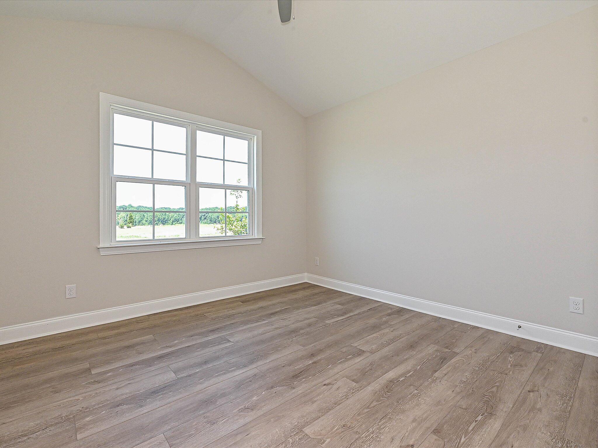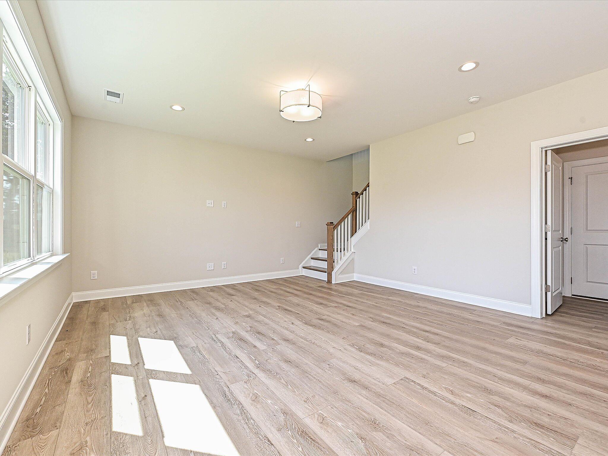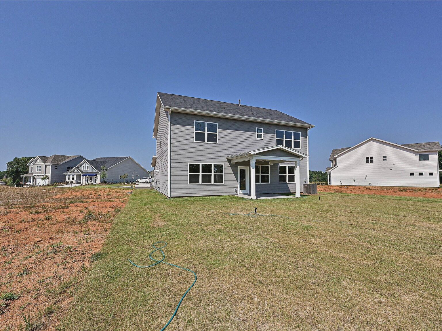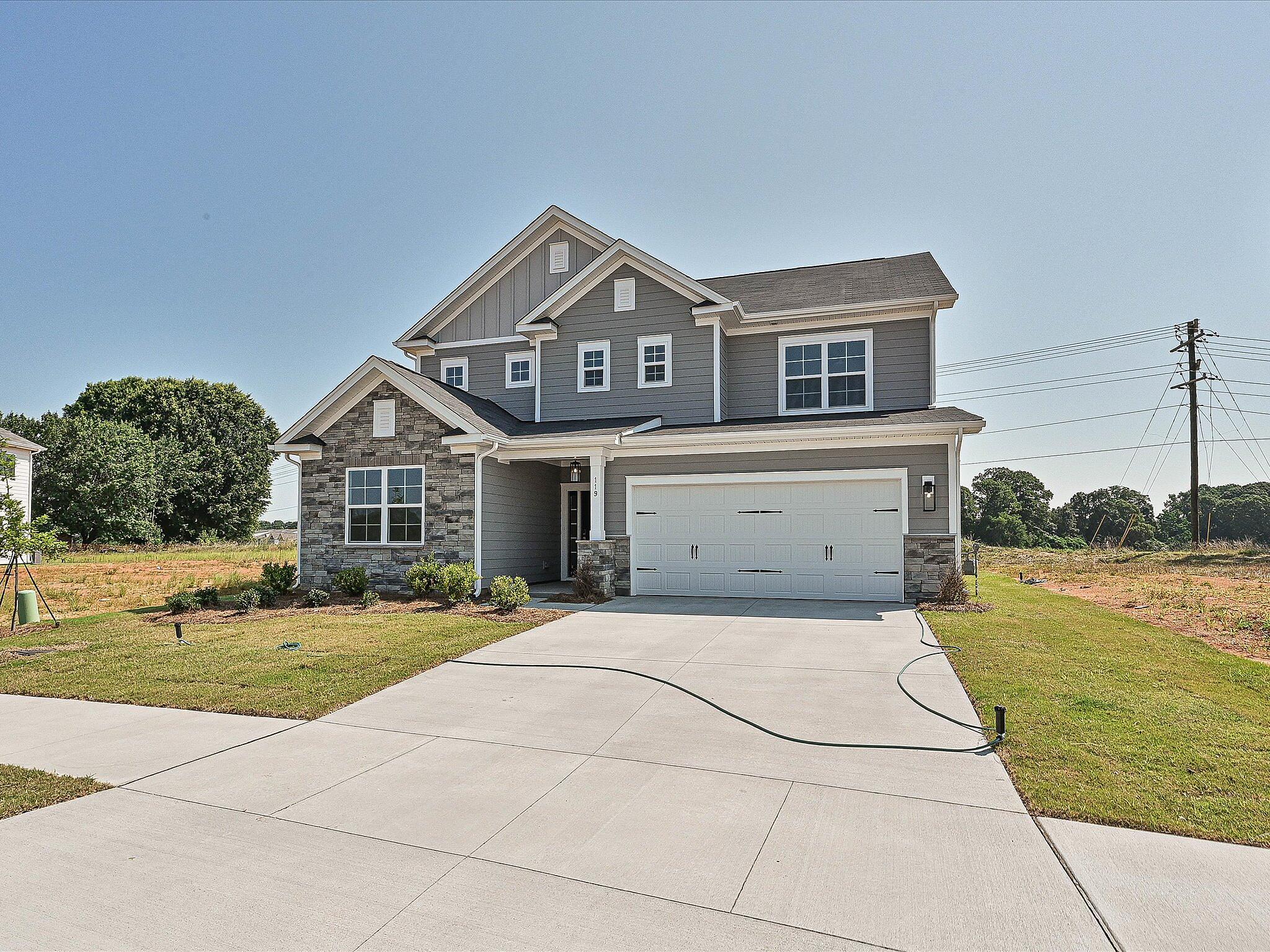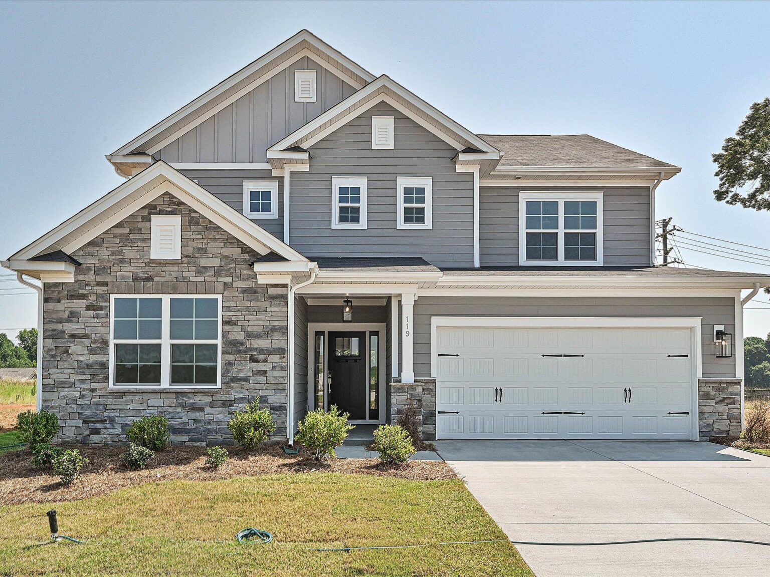 Enjoy well-thought-out space in this home, from the first-floor guest bedroom with vaulted ceiling and Flex room with French doors, to the extended storage closet under the stairs (because who has enough storage space?) The L-shaped Kitchen offers a pantry, white painted 42″ perimeter cabinets with stained cabinets at the island, double-trash pullout, and GE Profile stainless steel cooking appliances with a 36″ gas cooktop and vent hood extracted outside, plus quartz counters and a large undermount sink. The Breakfast area flows to the rear covered porch and Family room. Uptstairs is an open Loft, and spacious Premier Suite with tray ceiling and two walk-in closets. The bathroom includes a large tiled shower with semi-frameless glass, white cabinets, quartz counter, and tiled floors. Other thoughtful touches include a walk-in shower in the first-floor guest bath, and all baths have raised-height vanities and tiled floors. The first floor features LVP flooring throughout, plus in the upstairs hall and Loft, with oak treads on stairs. A mudroom drop zone offers convenience as well. This home is near the planned pool, clubhouse, and tot lot, plus there will be a dog park. Energy-saving features include a tankless gas hot water heater, attic tent for pull-down stairs, and radiant barrier sheathing.