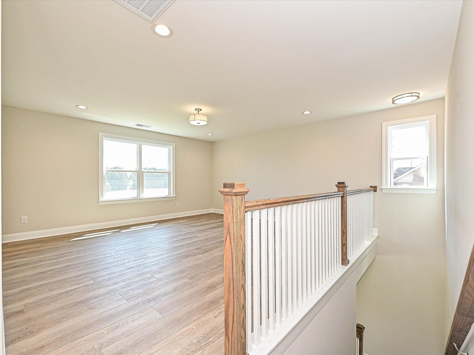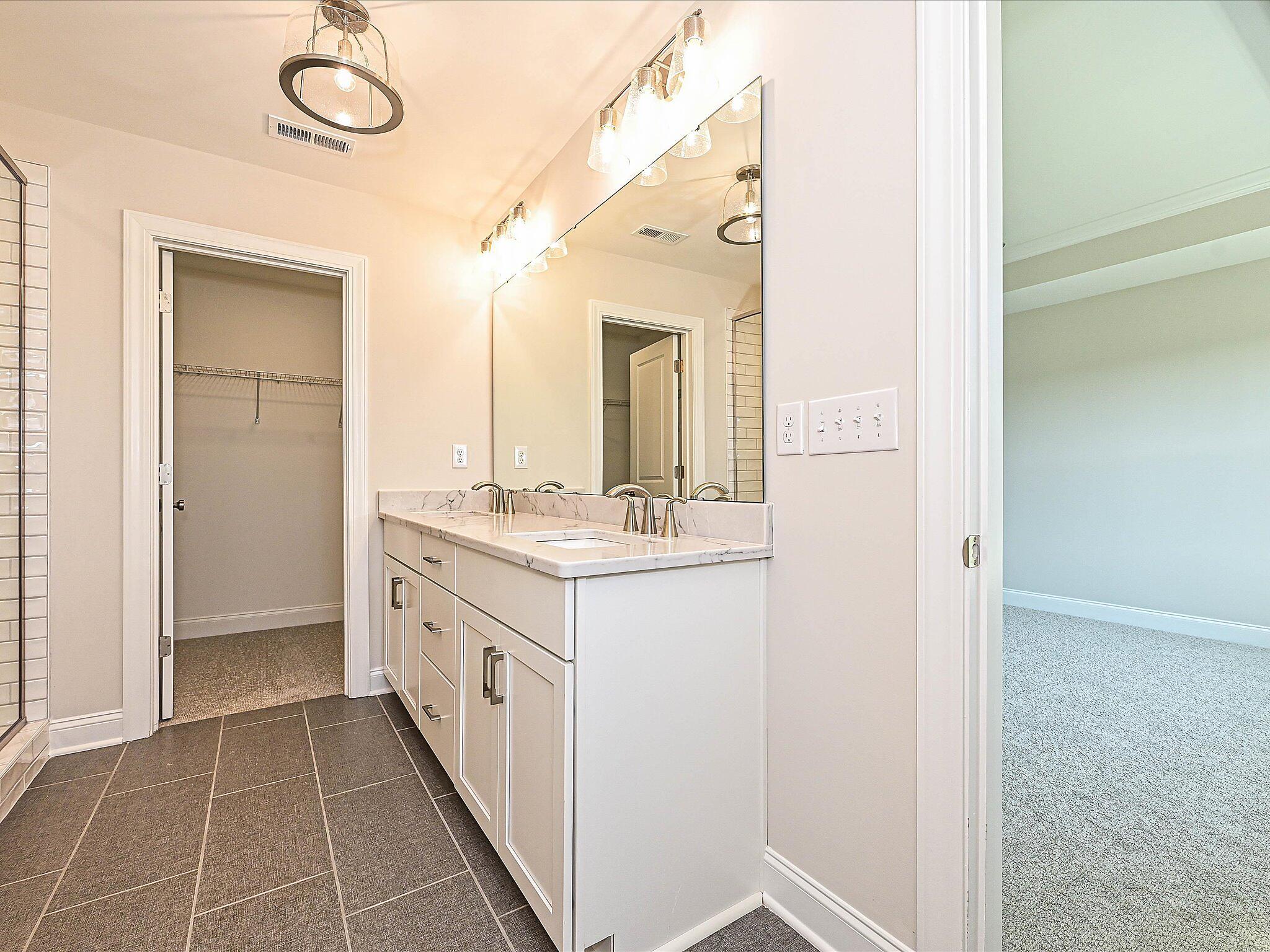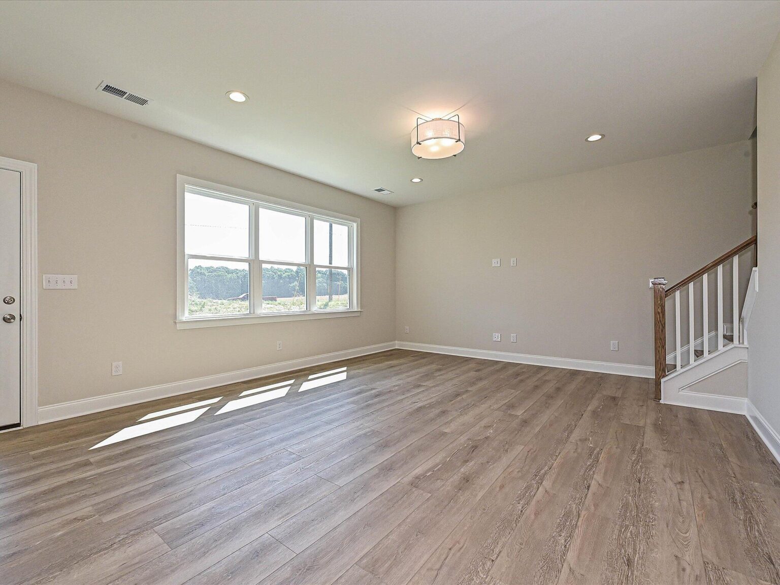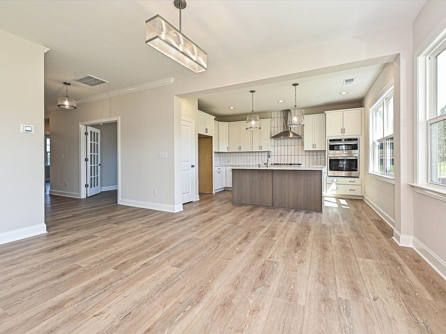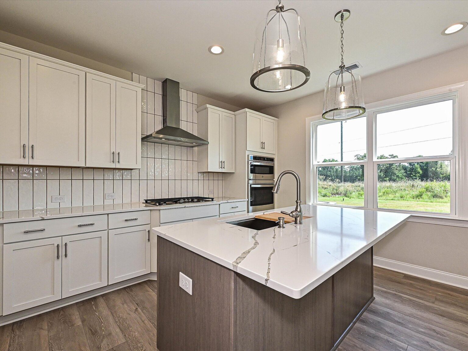 Enjoy well-thought-out space in this home, from the first-floor guest bedroom with vaulted ceiling and Flex room with French doors, to the extended storage closet under the stairs (because who has enough storage space?) The L-shaped Kitchen offers a pantry, white painted 42″ perimeter cabinets with stained cabinets at the island, double-trash pullout, and GE Profile stainless steel cooking appliances with a 36″ gas cooktop and vent hood extracted outside, plus quartz counters and a large undermount sink. The Breakfast area flows to the rear covered porch and Family room. Uptstairs is an open Loft, and spacious Premier Suite with tray ceiling and two walk-in closets. The bathroom includes a large tiled shower with semi-frameless glass, white cabinets, quartz counter, and tiled floors. Other thoughtful touches include a walk-in shower in the first-floor guest bath, and all baths have raised-height vanities and tiled floors. The first floor features LVP flooring throughout, plus in the upstairs hall and Loft, with oak treads on stairs. A mudroom drop zone offers convenience as well. This home is near the planned pool, clubhouse, and tot lot, plus there will be a dog park. Energy-saving features include a tankless gas hot water heater, attic tent for pull-down stairs, and radiant barrier sheathing.