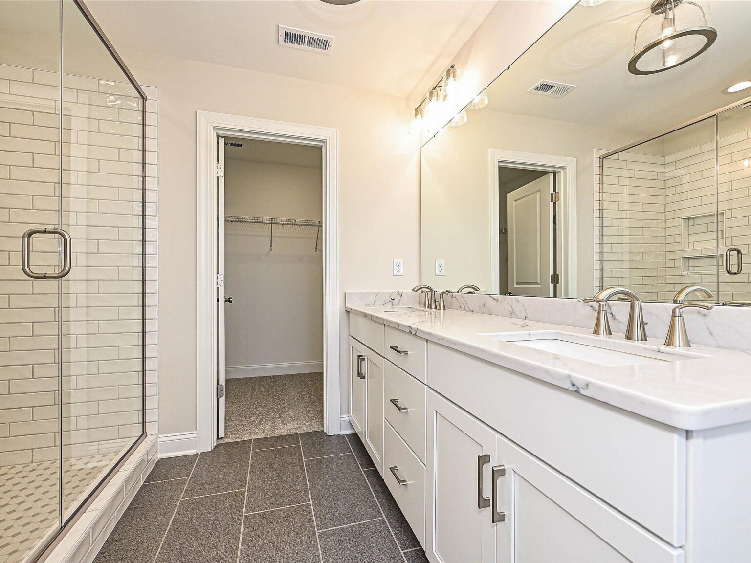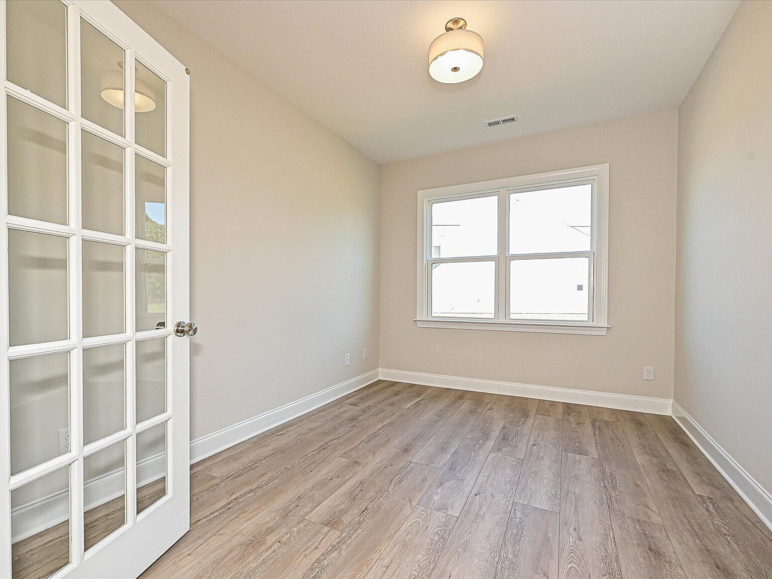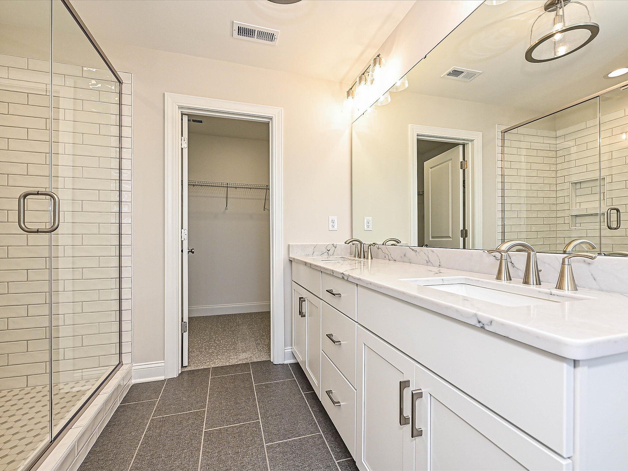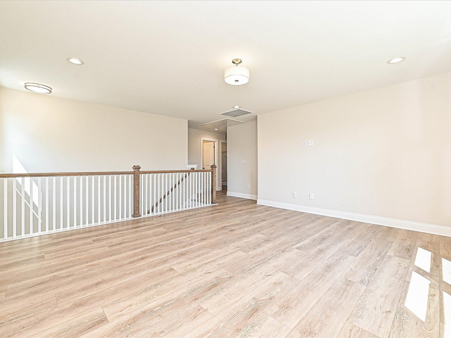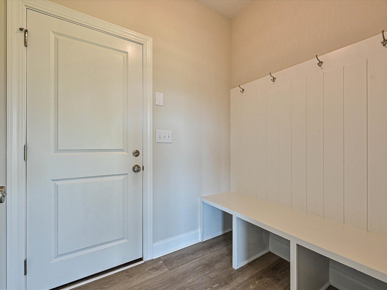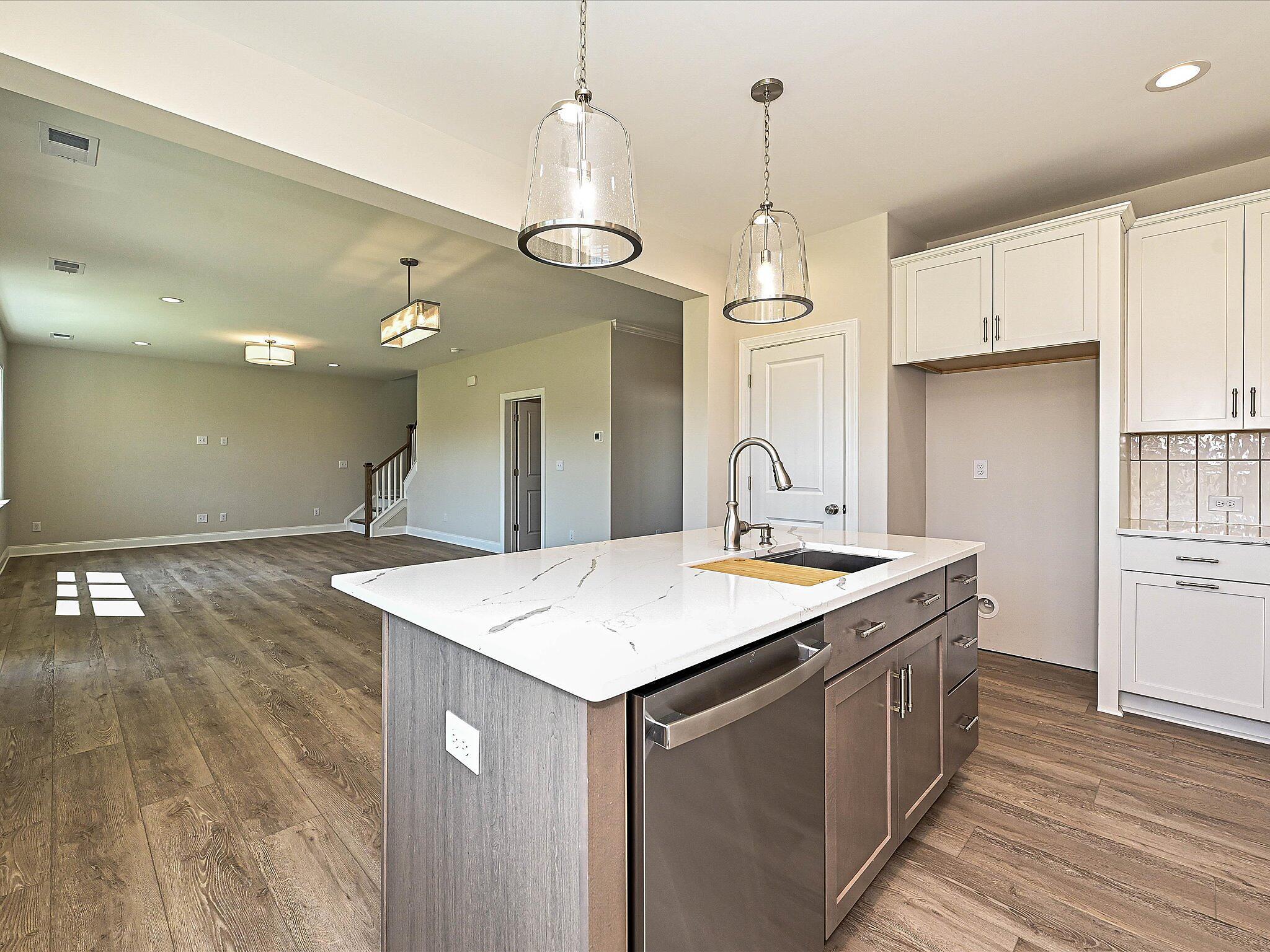 Enjoy well-thought-out space in this home, from the first-floor guest bedroom with vaulted ceiling and Flex room with French doors, to the extended storage closet under the stairs (because who has enough storage space?) The L-shaped Kitchen offers a pantry, white painted 42″ perimeter cabinets with stained cabinets at the island, double-trash pullout, and GE Profile stainless steel cooking appliances with a 36″ gas cooktop and vent hood extracted outside, plus quartz counters and a large undermount sink. The Breakfast area flows to the rear covered porch and Family room. Uptstairs is an open Loft, and spacious Premier Suite with tray ceiling and two walk-in closets. The bathroom includes a large tiled shower with semi-frameless glass, white cabinets, quartz counter, and tiled floors. Other thoughtful touches include a walk-in shower in the first-floor guest bath, and all baths have raised-height vanities and tiled floors. The first floor features LVP flooring throughout, plus in the upstairs hall and Loft, with oak treads on stairs. A mudroom drop zone offers convenience as well. This home is near the planned pool, clubhouse, and tot lot, plus there will be a dog park. Energy-saving features include a tankless gas hot water heater, attic tent for pull-down stairs, and radiant barrier sheathing.