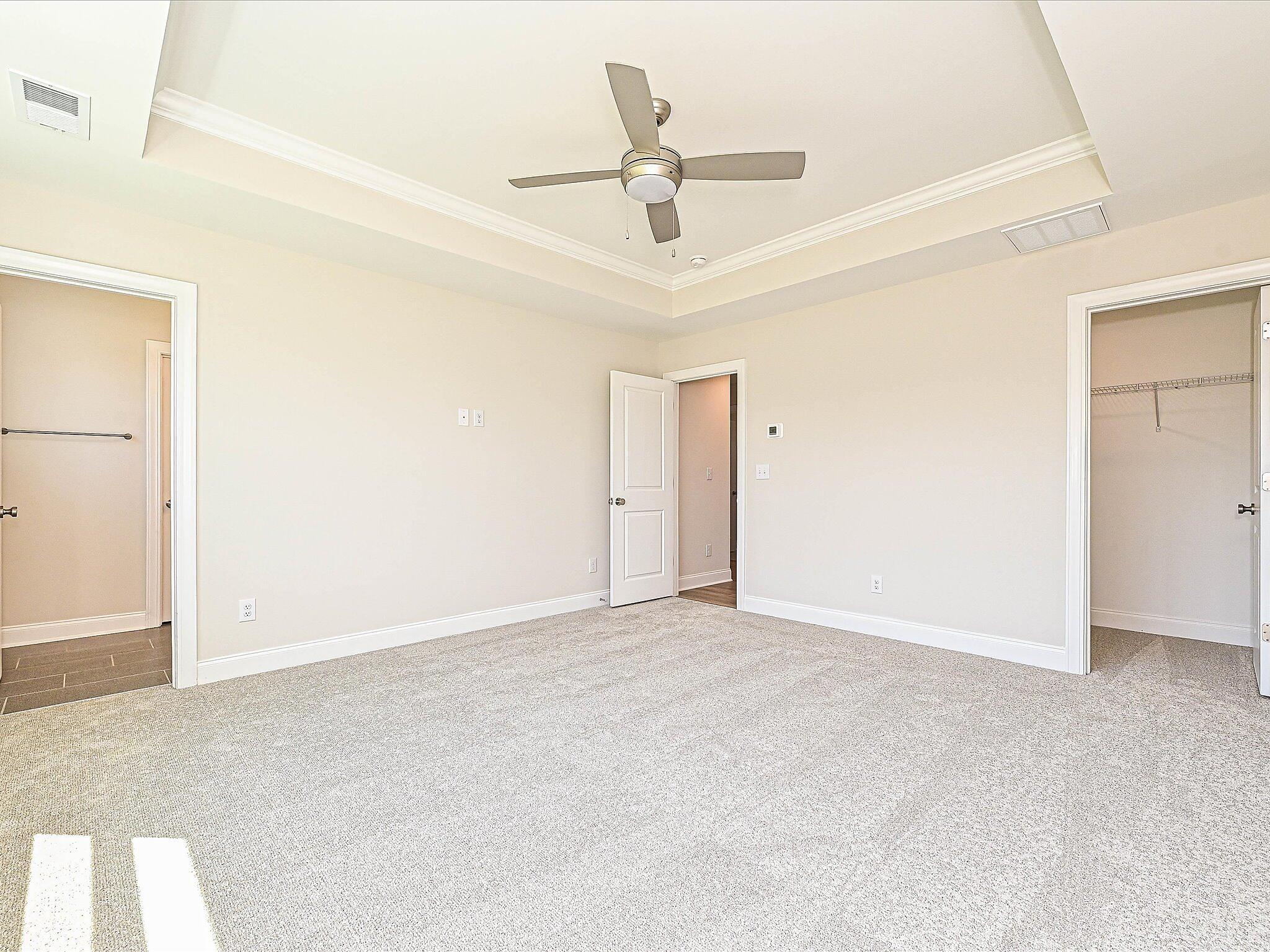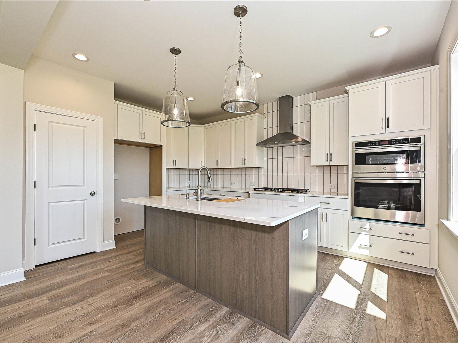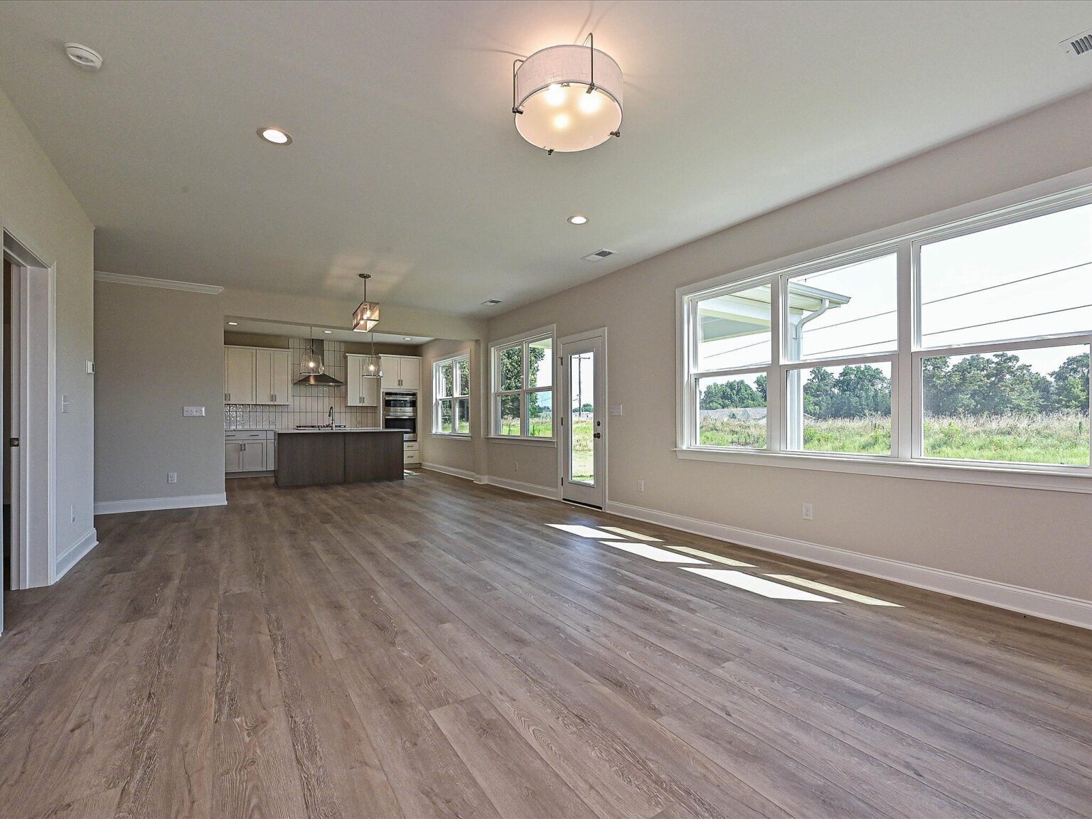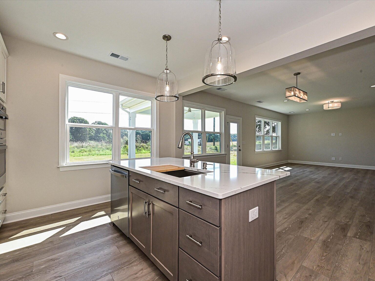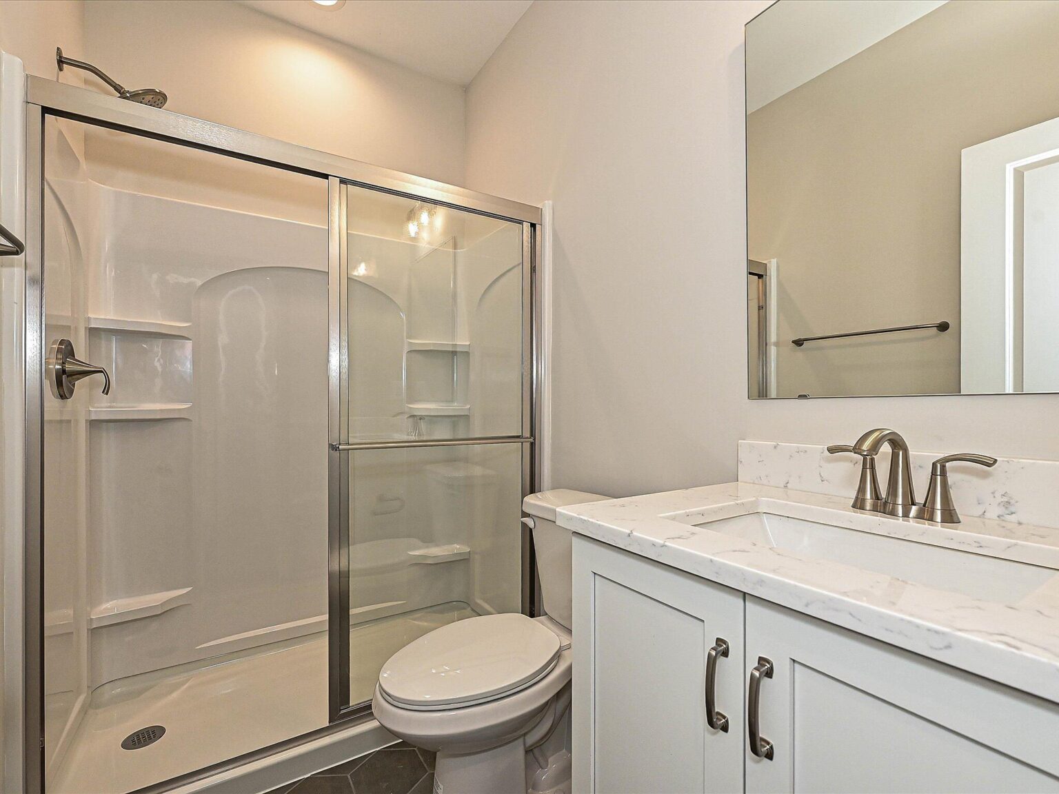 Enjoy well-thought-out space in this home, from the first-floor guest bedroom with vaulted ceiling and Flex room with French doors, to the extended storage closet under the stairs (because who has enough storage space?) The L-shaped Kitchen offers a pantry, white painted 42″ perimeter cabinets with stained cabinets at the island, double-trash pullout, and GE Profile stainless steel cooking appliances with a 36″ gas cooktop and vent hood extracted outside, plus quartz counters and a large undermount sink. The Breakfast area flows to the rear covered porch and Family room. Uptstairs is an open Loft, and spacious Premier Suite with tray ceiling and two walk-in closets. The bathroom includes a large tiled shower with semi-frameless glass, white cabinets, quartz counter, and tiled floors. Other thoughtful touches include a walk-in shower in the first-floor guest bath, and all baths have raised-height vanities and tiled floors. The first floor features LVP flooring throughout, plus in the upstairs hall and Loft, with oak treads on stairs. A mudroom drop zone offers convenience as well. This home is near the planned pool, clubhouse, and tot lot, plus there will be a dog park. Energy-saving features include a tankless gas hot water heater, attic tent for pull-down stairs, and radiant barrier sheathing.