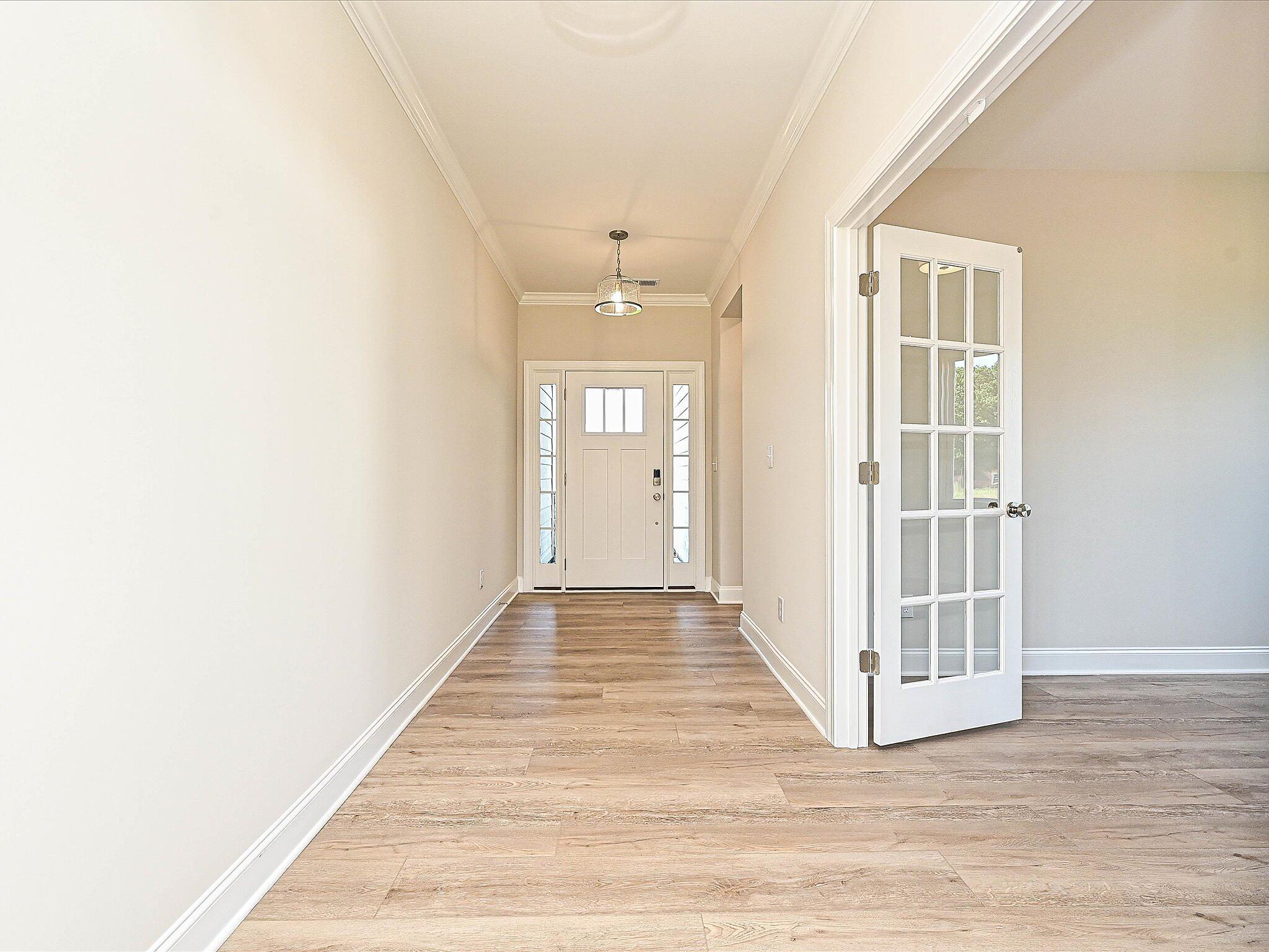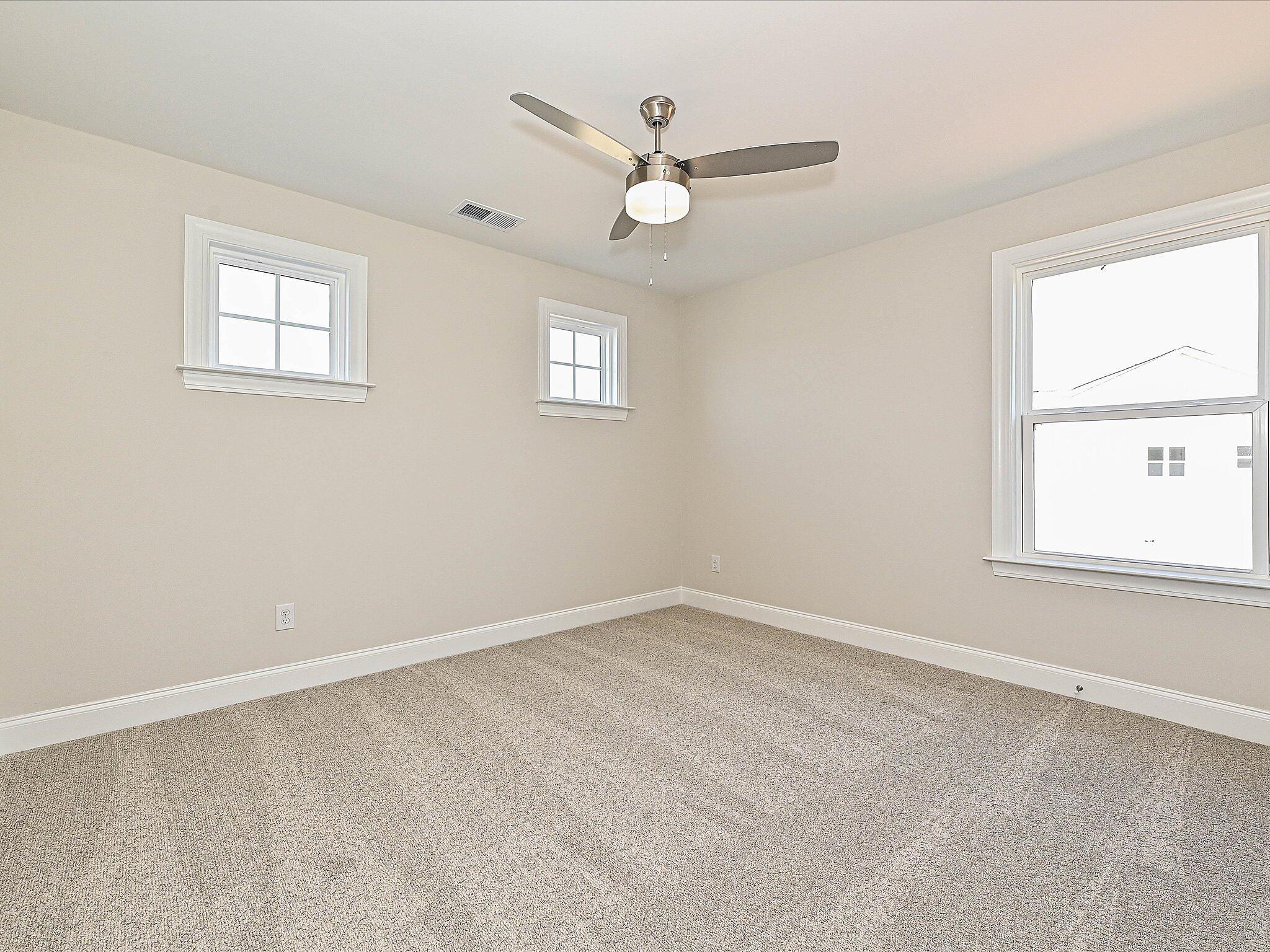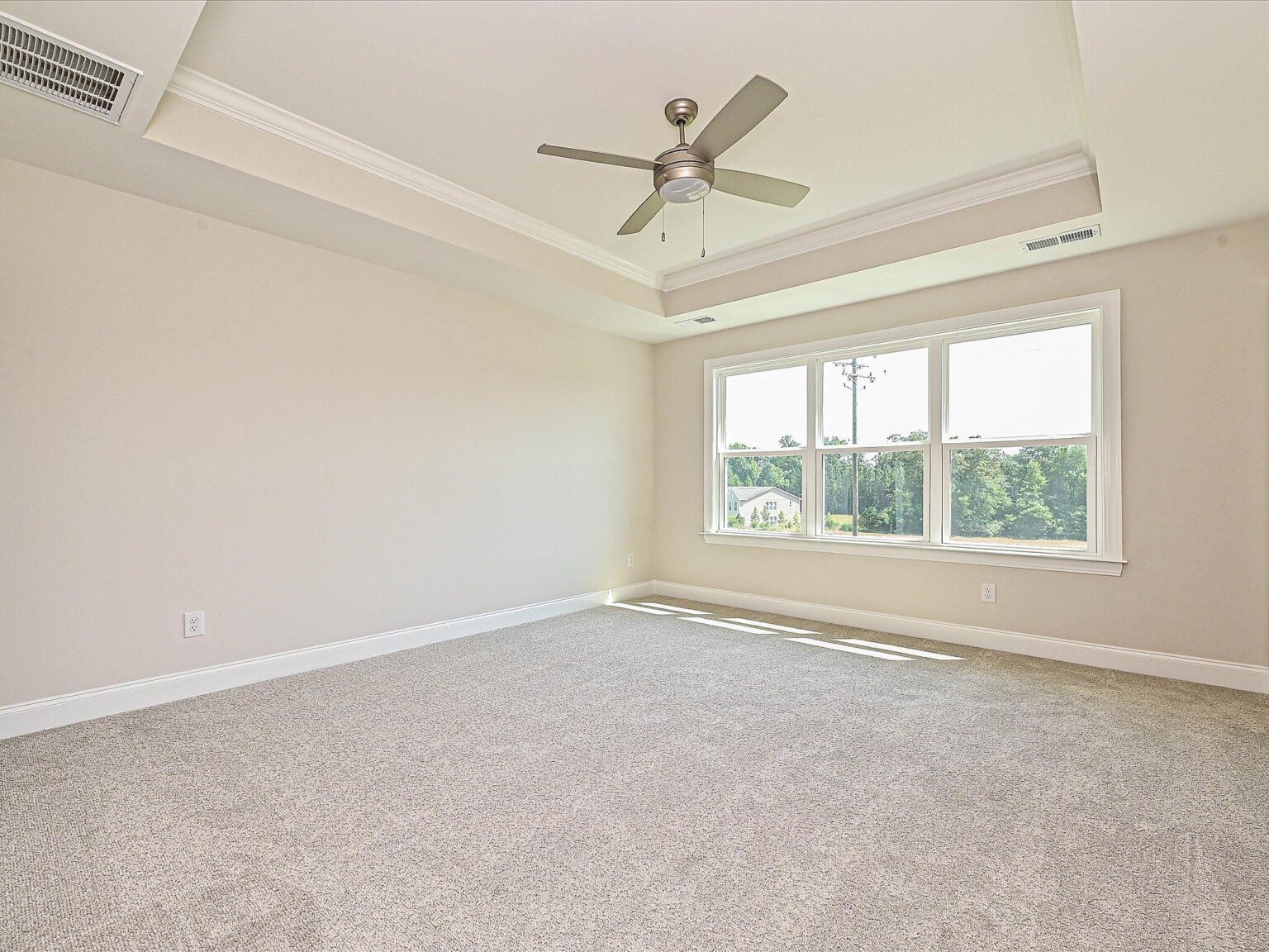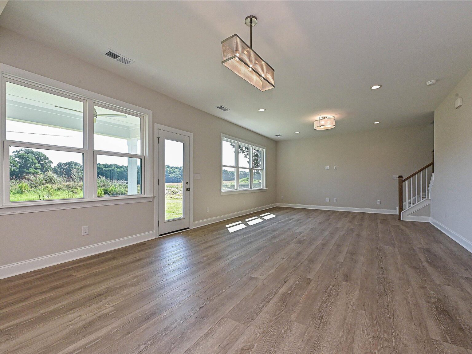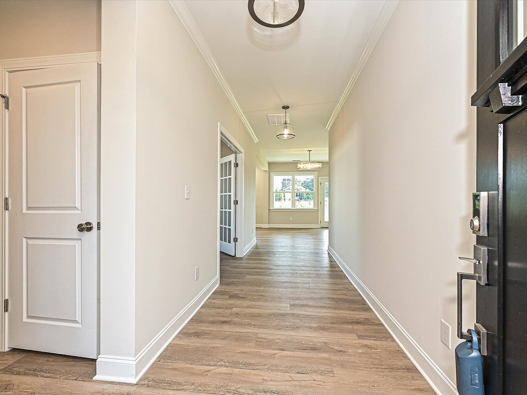 Enjoy well-thought-out space in this home, from the first-floor guest bedroom with vaulted ceiling and Flex room with French doors, to the extended storage closet under the stairs (because who has enough storage space?) The L-shaped Kitchen offers a pantry, white painted 42″ perimeter cabinets with stained cabinets at the island, double-trash pullout, and GE Profile stainless steel cooking appliances with a 36″ gas cooktop and vent hood extracted outside, plus quartz counters and a large undermount sink. The Breakfast area flows to the rear covered porch and Family room. Uptstairs is an open Loft, and spacious Premier Suite with tray ceiling and two walk-in closets. The bathroom includes a large tiled shower with semi-frameless glass, white cabinets, quartz counter, and tiled floors. Other thoughtful touches include a walk-in shower in the first-floor guest bath, and all baths have raised-height vanities and tiled floors. The first floor features LVP flooring throughout, plus in the upstairs hall and Loft, with oak treads on stairs. A mudroom drop zone offers convenience as well. This home is near the planned pool, clubhouse, and tot lot, plus there will be a dog park. Energy-saving features include a tankless gas hot water heater, attic tent for pull-down stairs, and radiant barrier sheathing.