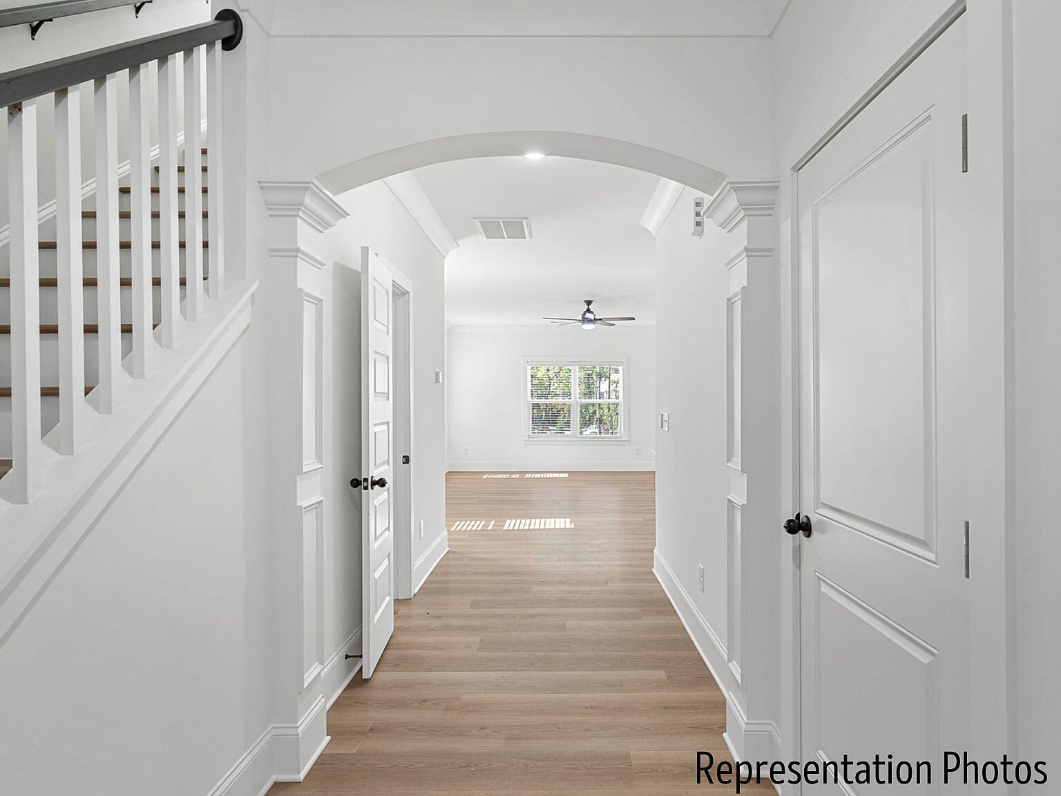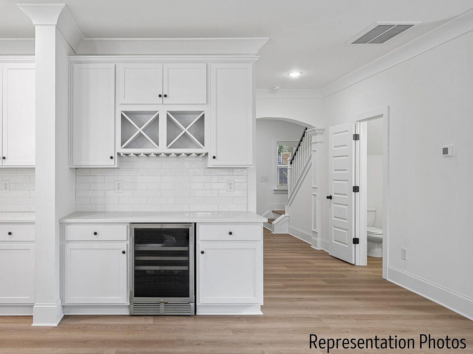 The kitchen serves as the heart of the home, seamlessly overlooking the dining and living areas, making it ideal for gathering and entertaining. A stunning waterfall Carrara quartz island anchors the space, complemented by 42” cabinetry with soft-close drawers, wide plank flooring, a gas range, microwave drawer, designer hood, and dishwasher. A custom wood-shelved corner pantry. An extended beverage bar add thoughtful convenience, perfect for hosting, setting up a coffee station, or grabbing a quick energy/hydration drink on your way out the door. Nine-foot ceilings on both floors create an airy, expansive feel, while high-end molding adds architectural depth and sophistication throughout. Just off the dining area, an extended sunroom fills the home with natural light and opens to a spacious deck complete with a gas stub line so