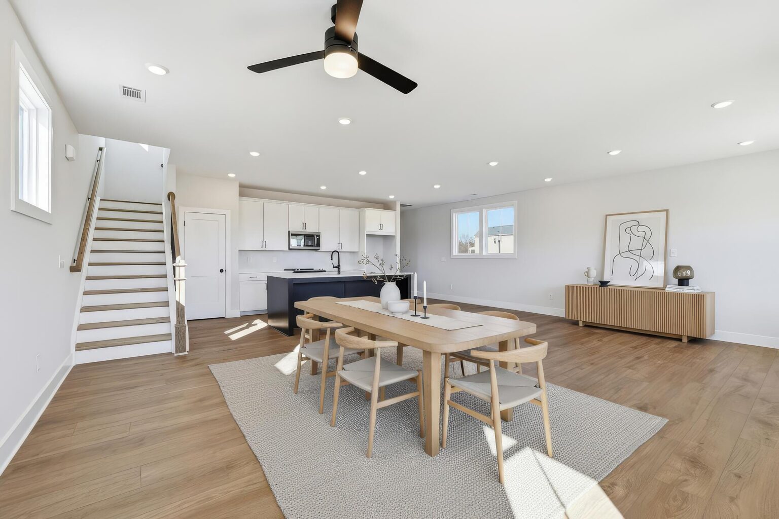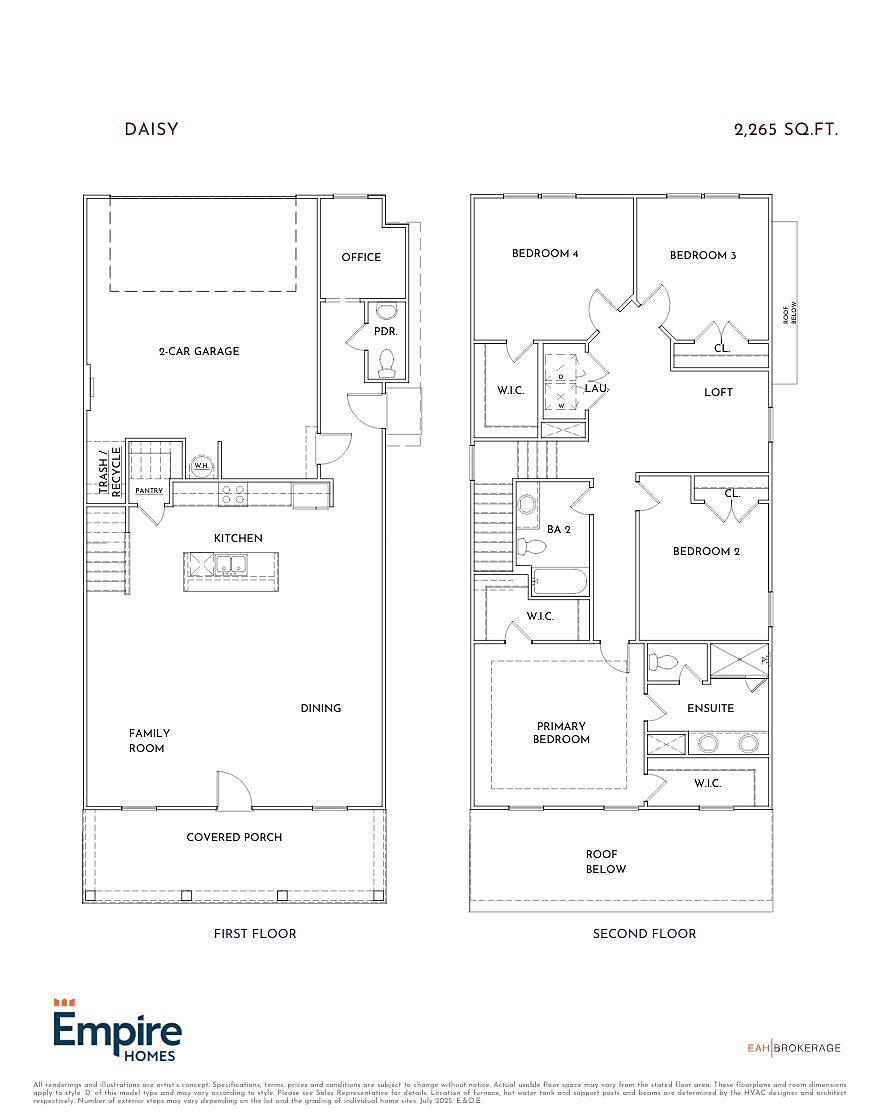 The Daisy offers 2,265 square feet of well-balanced space across two levels. Created for front-porch living, this home is overlooking the expansive community green space, beautifully landscaped for your enjoyment. The main floor highlights a spacious family room, dining area, and kitchen with center island, plus a dedicated office and powder bath. Upstairs, the primary suite includes two walk-in closets and a luxurious ensuite bath. Three additional bedrooms, a shared bath, and a central loft create ideal space for family living or entertaining. This particular home features an office area on the main level, quartz countertops, and soft close cabinets in the kitchen.