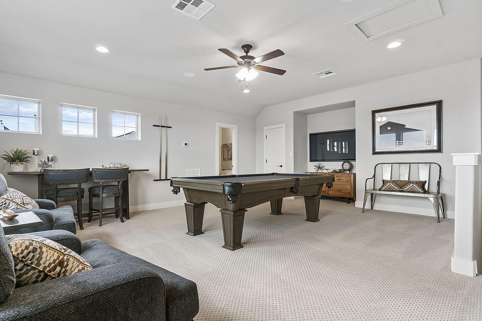 This beautiful Model home is 2677 sq.ft. It’s our most popular floor plan in Siena. This amazing 3 bedroom, 3 bath, has a study, flex room, upstairs bonus room, fireplace with stone surround up to the ceiling, a bay window in the master suite, sliding barn door at the master bath, extended covered patio, and a 2.5 car garage. The interior colors are grey and white, so it’s light and bright. White kitchen cabinets are accented with a grey glaze. The large kitchen features a corner walk-in pantry, 2 sets of pot drawers, a recycle center, an under-mount stainless steel sink, black stainless appliances, under-cabinet lighting, and pretty white and grey Silestone countertops. Other special features include an upgraded stone elevation with metal roof accents, a front door with an iron grille, upgraded door and trim package, upgraded lighting and plumbing fixtures, granite in the master bath, upgraded carpet and bath tile, wired for stereo, conduit and a 110 outlet to hang TV over fireplace, and a security system. This home has beautiful wood floors throughout the downstairs, except for bedrooms, utility room and bathrooms. All baths have upgraded wall and floor tile as well. Large corner lot with pretty landscaping in front and back, and of course full irrigation. Come see it! It’s gorgeous!!
