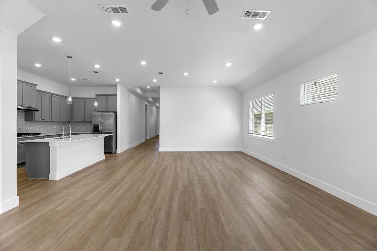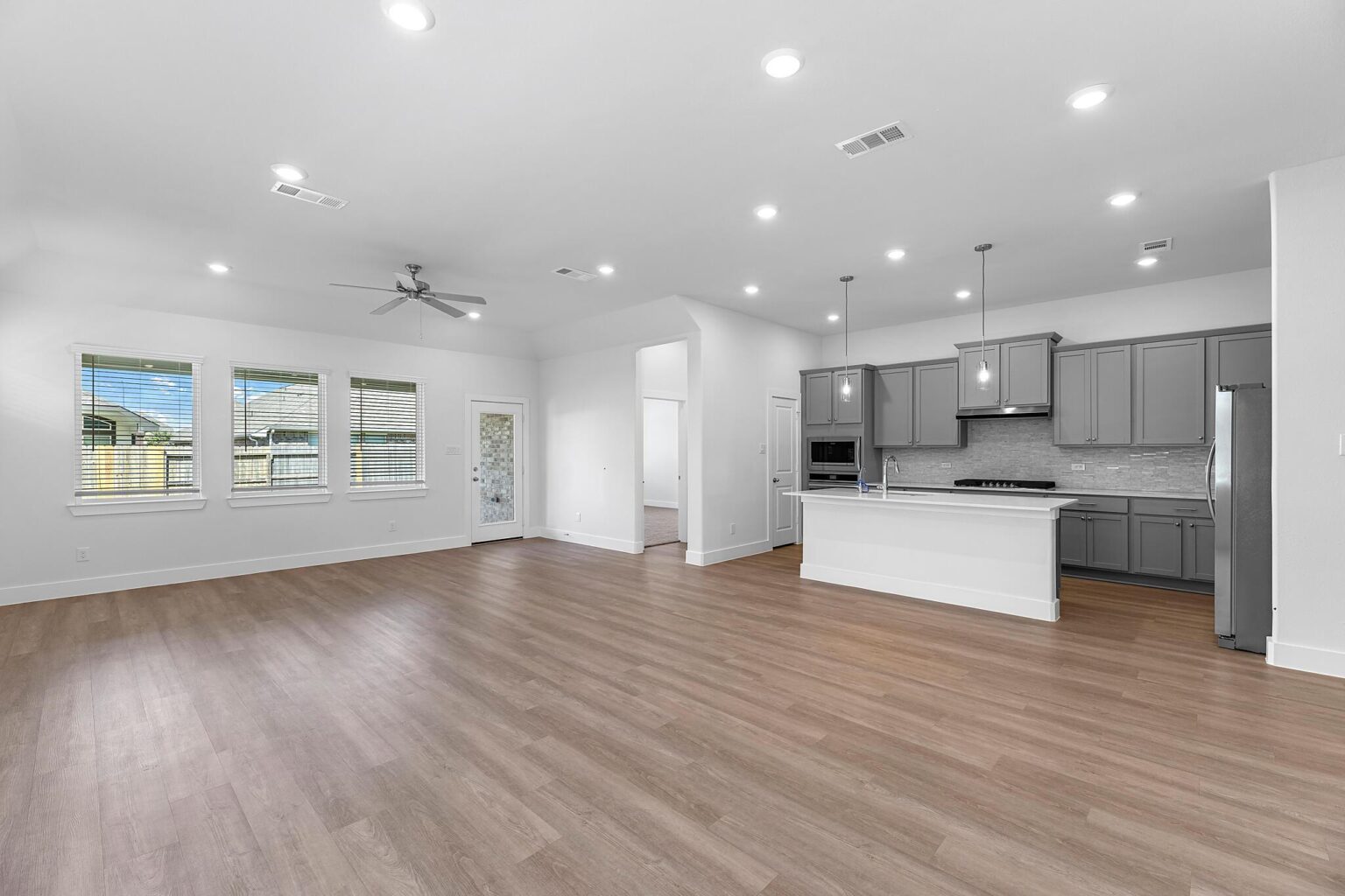 Discover the epitome of comfort and versatility in this stunning single-story residence boasting a captivating 4-bed, 3-bath Aspen floor plan. As you step into the welcoming foyer, a seamless transition unfolds, guiding you into the expansive open-concept living and dining area. The heart of the home, the primary retreat, awaits at the rear, ensuring a tranquil and private haven.
