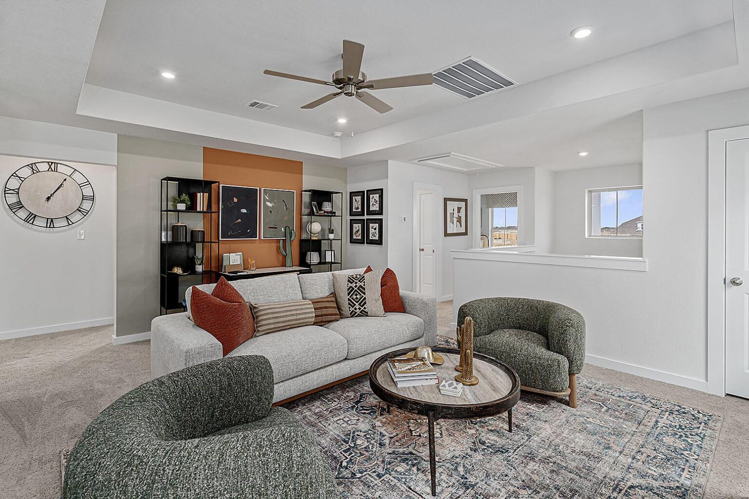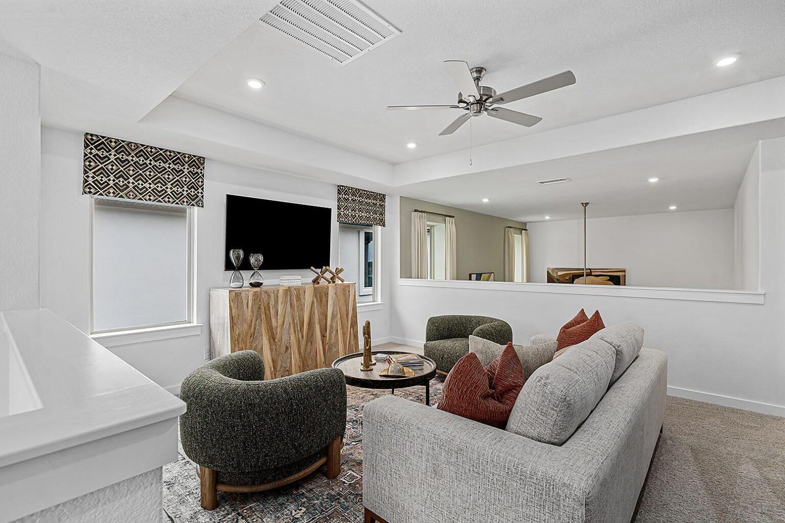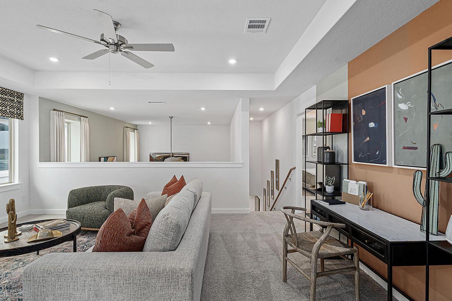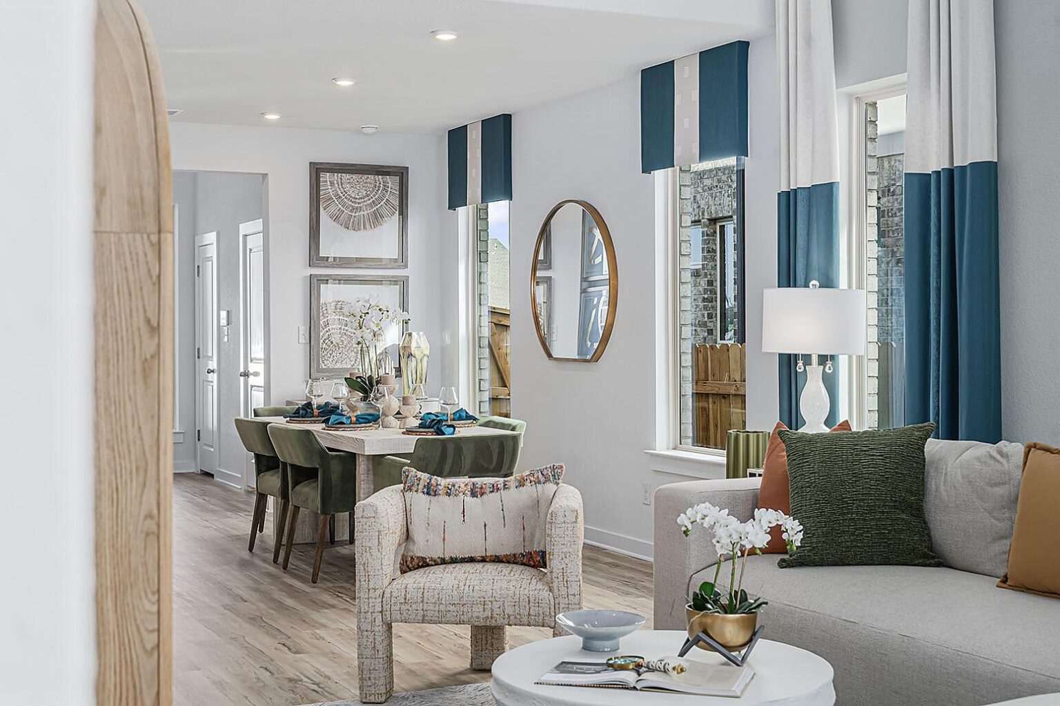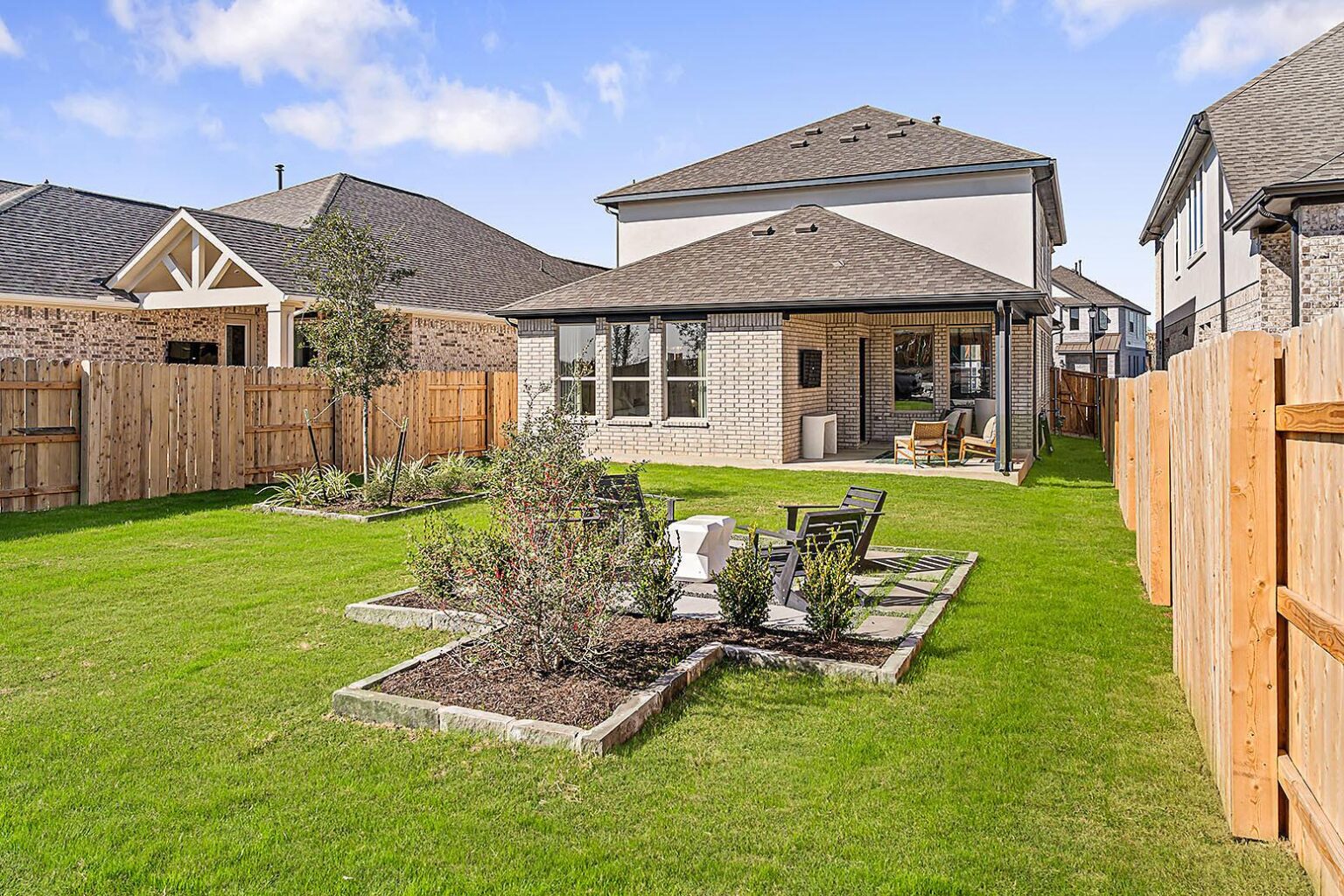 This beautiful 2-story plan features 4 bedrooms, 2.5 bathrooms, and an open-concept dining and family room. The kitchen is adorned with 42-inch cabinets and an abundance of counter space. Additional entertainment is made with ease in the oversized game room upstairs or out on the covered patio. The primary retreat offers a spa-like ensuite and a spacious walk-in closet, connected to the laundry room for your convenience.