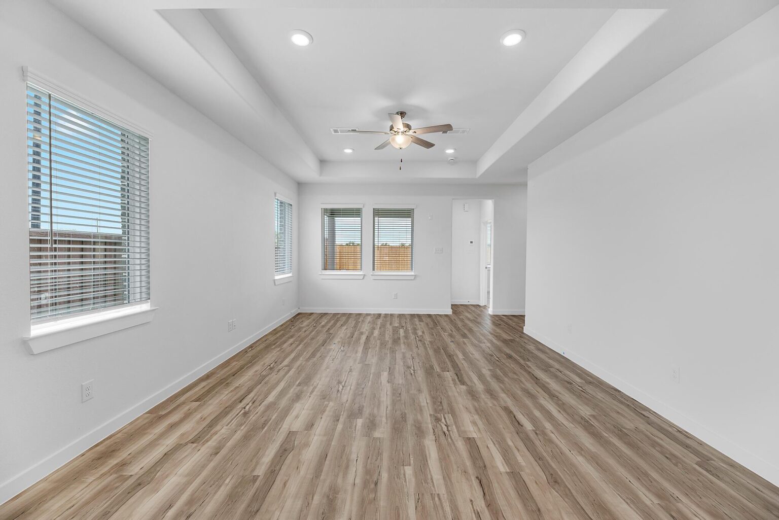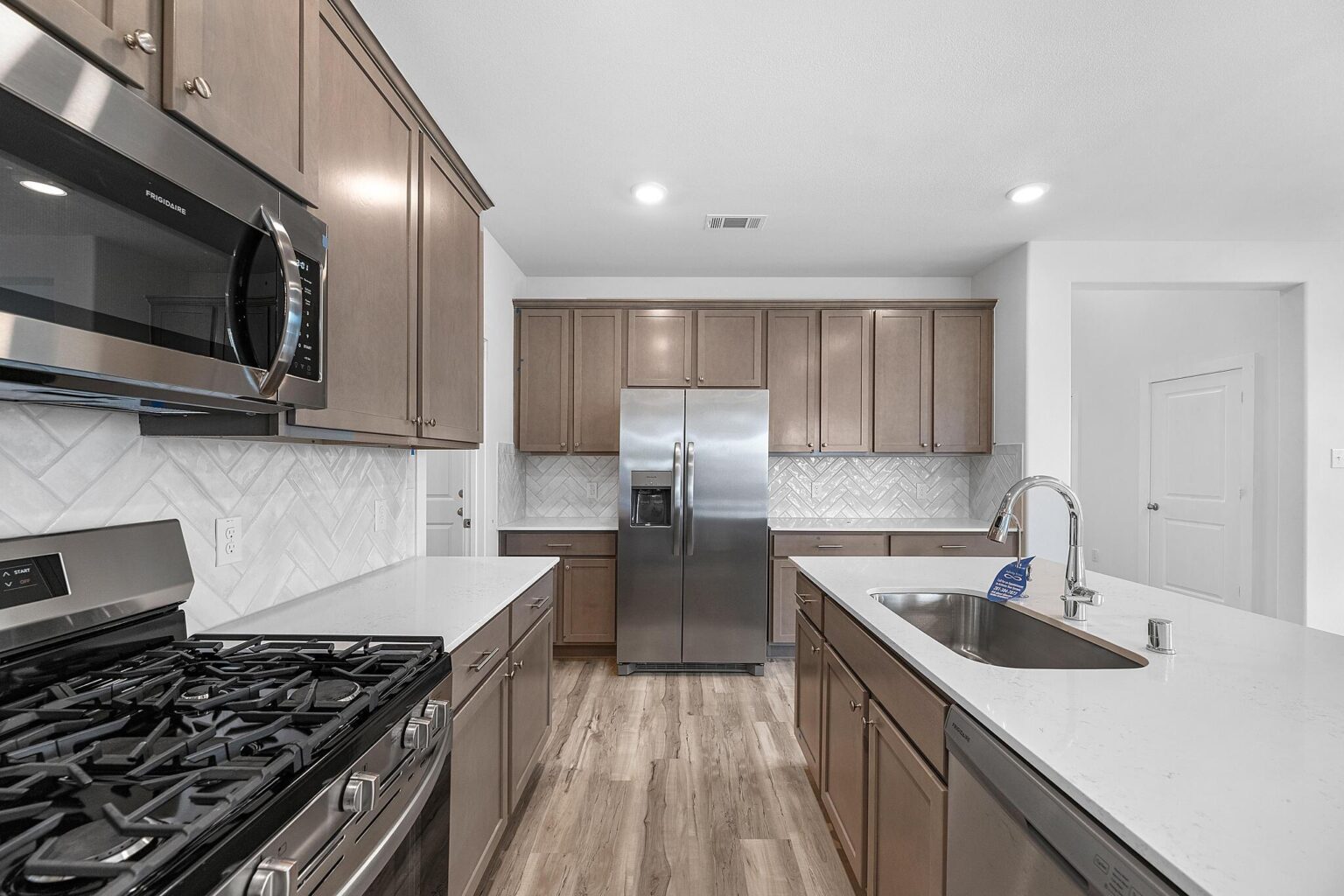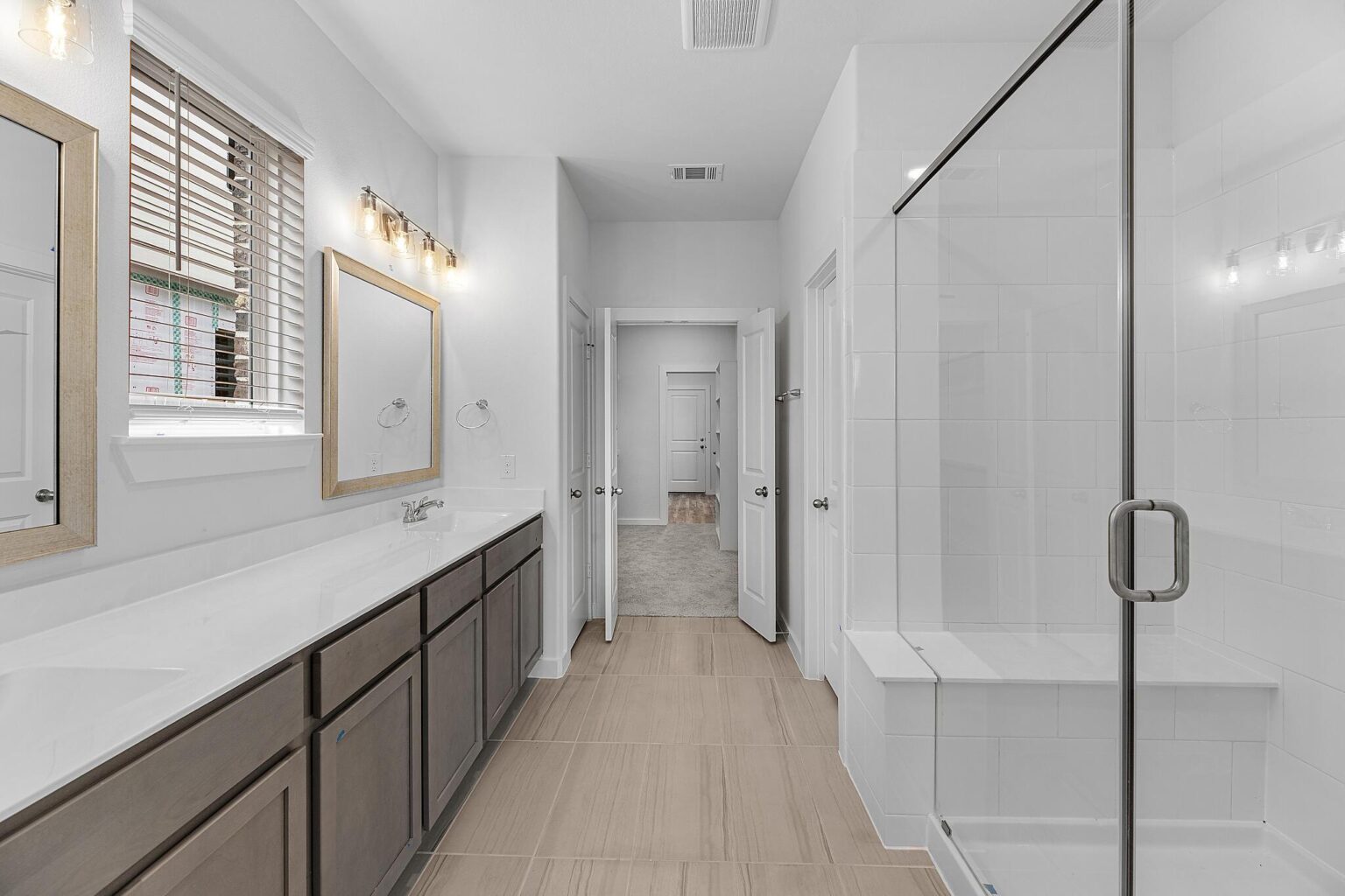This beautiful 2-story plan features 4 bedrooms, 2.5 bathrooms, and an open-concept dining and family room. The kitchen is adorned with 42-inch cabinets and an abundance of counter space. Additional entertainment is made with ease as with an upstairs oversized game room, media room or out on the covered patio. The primary retreat offers a spa-like ensuite and a spacious walk-in closet, connected to the laundry room for your convenience.