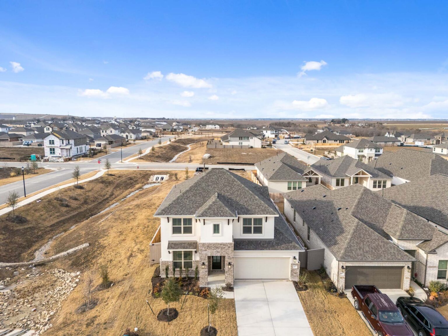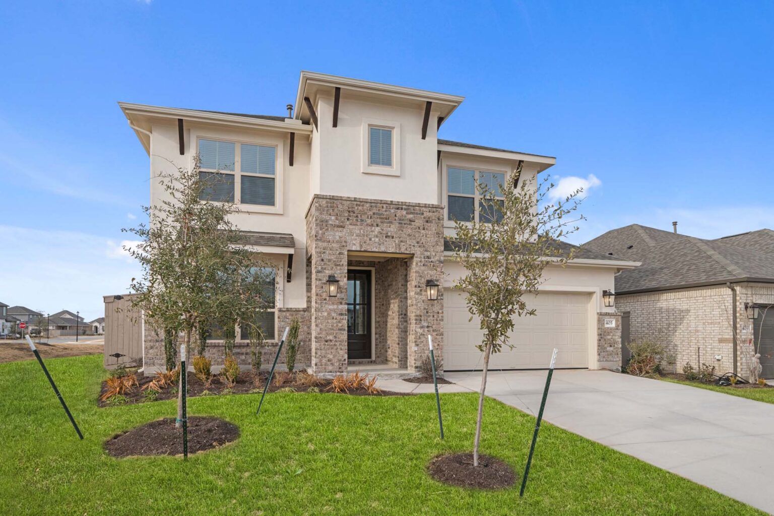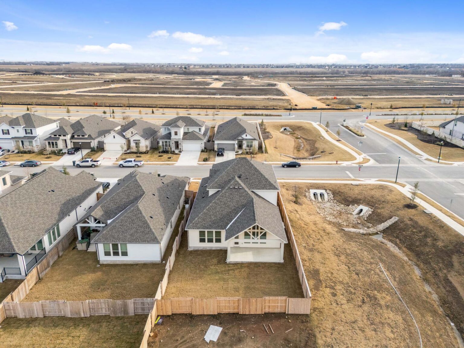 Beautiful 2 story home with 4 bedrooms, 3.5 baths, game room and media room. Soaring ceilings in the main living area, 2 stories at staircase. Large kitchen with coffee bar, butlers pantry, island and built in gas appliances. Corner homesite. This home includes a refrigerator and blinds.