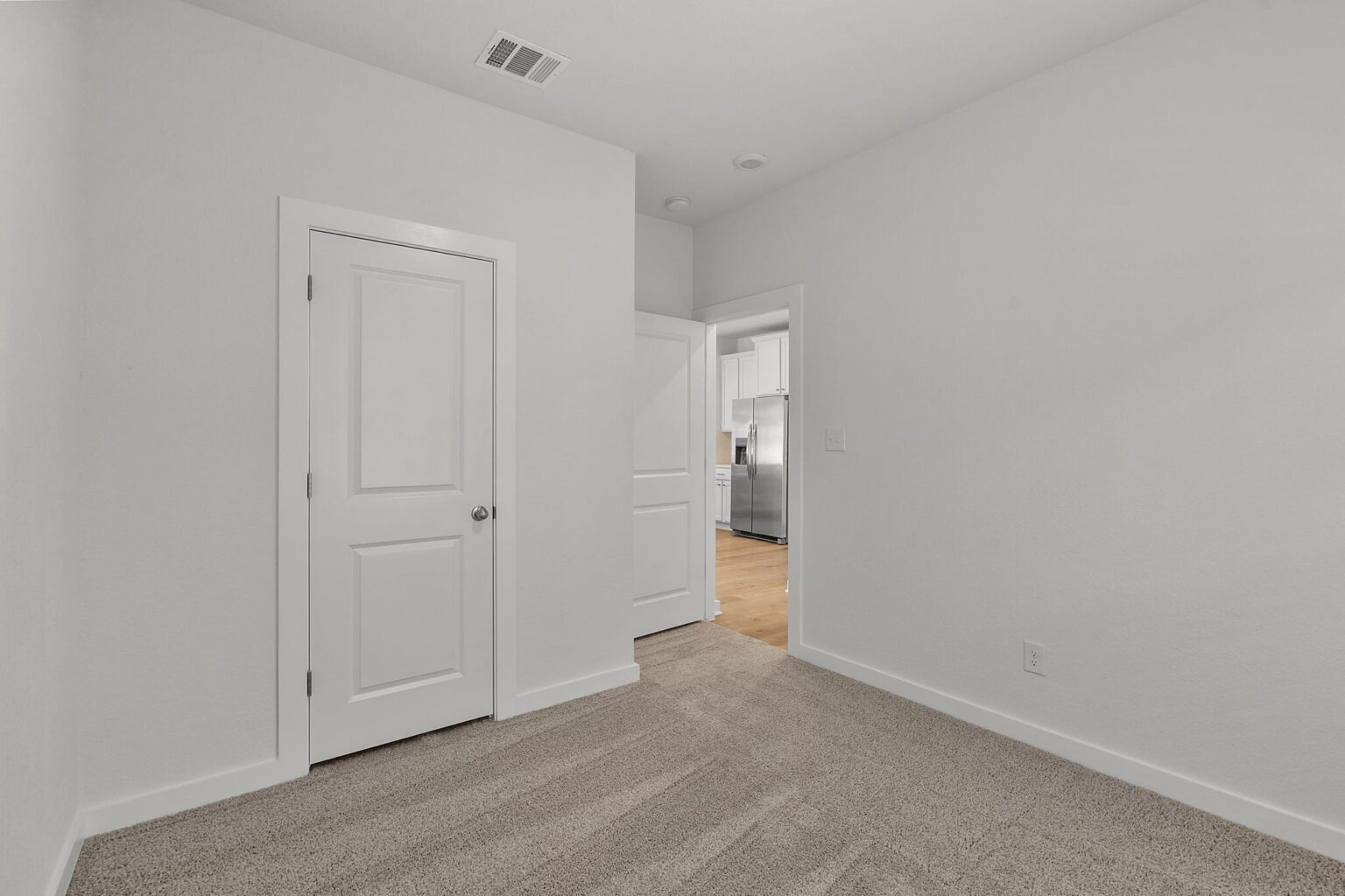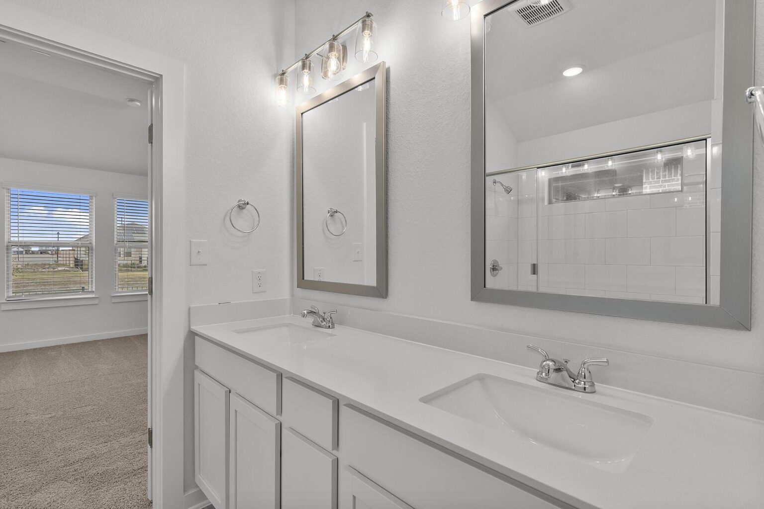 Greenbelt Homesite, The Kendall is a well-designed one-story home with 3 bedrooms, 2 full bathrooms, and 1,527 square feet of living space. The foyer leads to an open-concept kitchen, casual dining area, and living room, perfect for gatherings. A large covered patio extends from the living room, offering an ideal spot for outdoor relaxation. The primary bedroom, located at the back of the home, features a walk-in closet and an en-suite bathroom with dual vanities. Two additional bedrooms are situated near the front, sharing a full bathroom.
