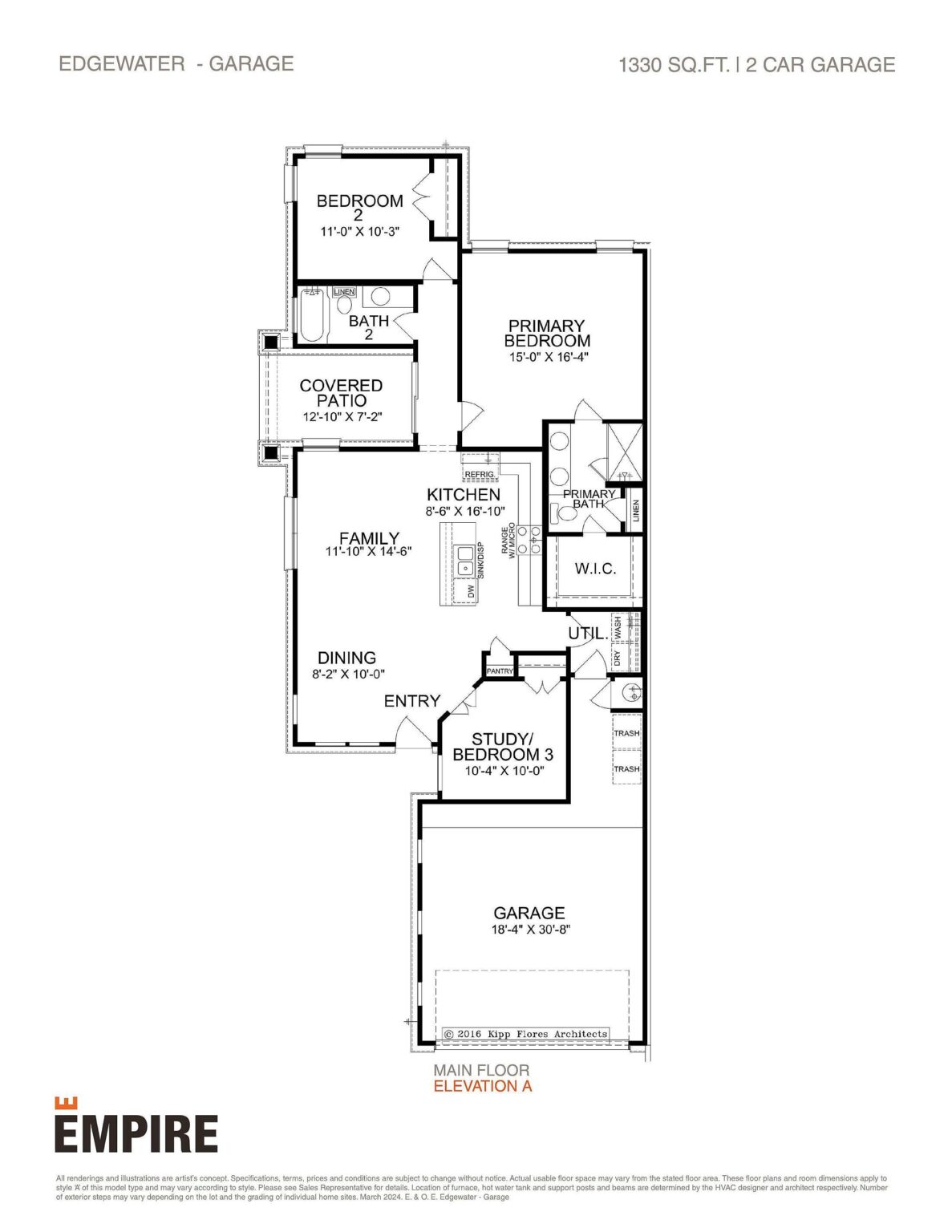 This single-story Edgewater floor plan is designed to impress. Its open concept dining and family room flows seamlessly onto a covered patio, offering endless design possibilities. A spacious owner’s suite is located towards the back of the home, fitted with a walk-in closet and luxurious ensuite. This model also features an optional fireplace, a second bedroom and a study space, perfect for a work-from-home office. The Edgewater Garage plan offers homeowners a 2-car garage.