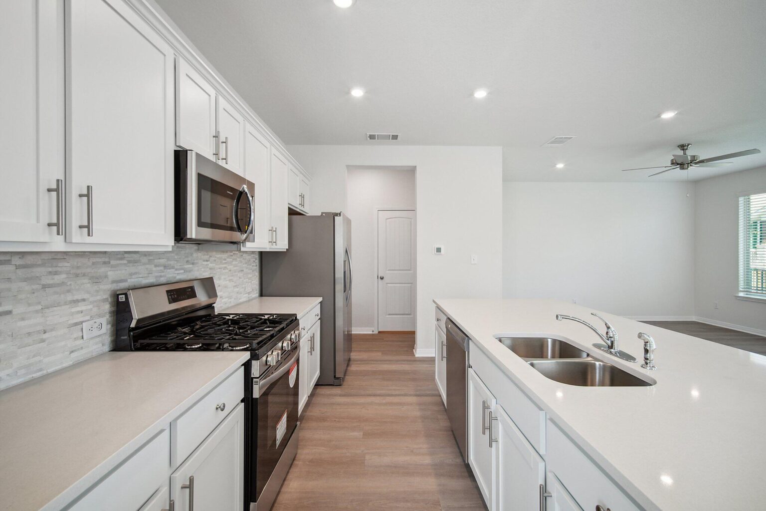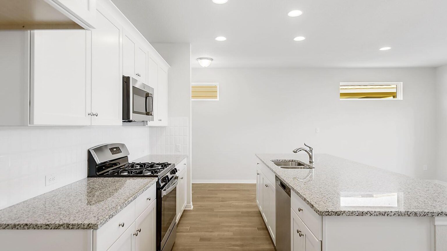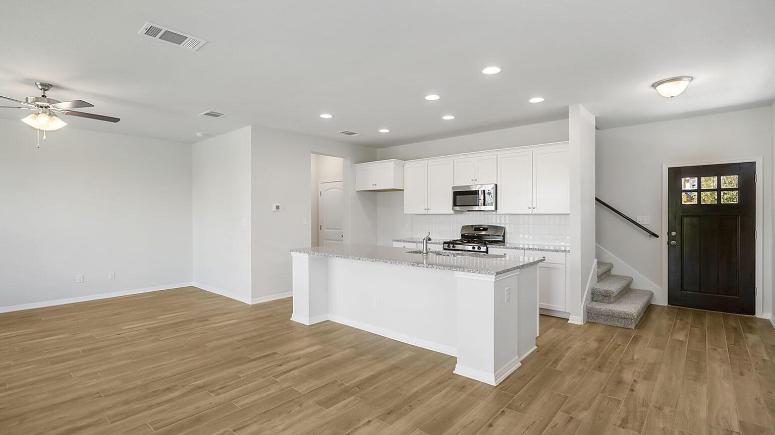 This spacious, 2-story, lock-n-leave, townhome features an open concept floor plan that is great for entertaining. The kitchen boasts of upgraded backsplash, quartz countertops and a large island. LVP floors in downstairs common areas and upgraded tile floors in all bathrooms. Large primary suite with walk-in closet. This home has ample storage, including under-stair storage, covered patio, water softener loop and garage door opener.