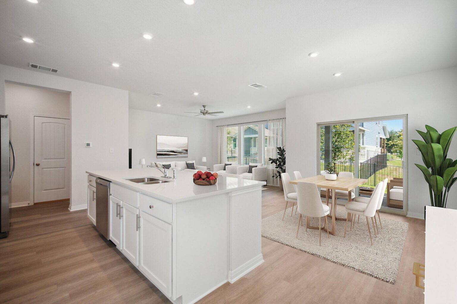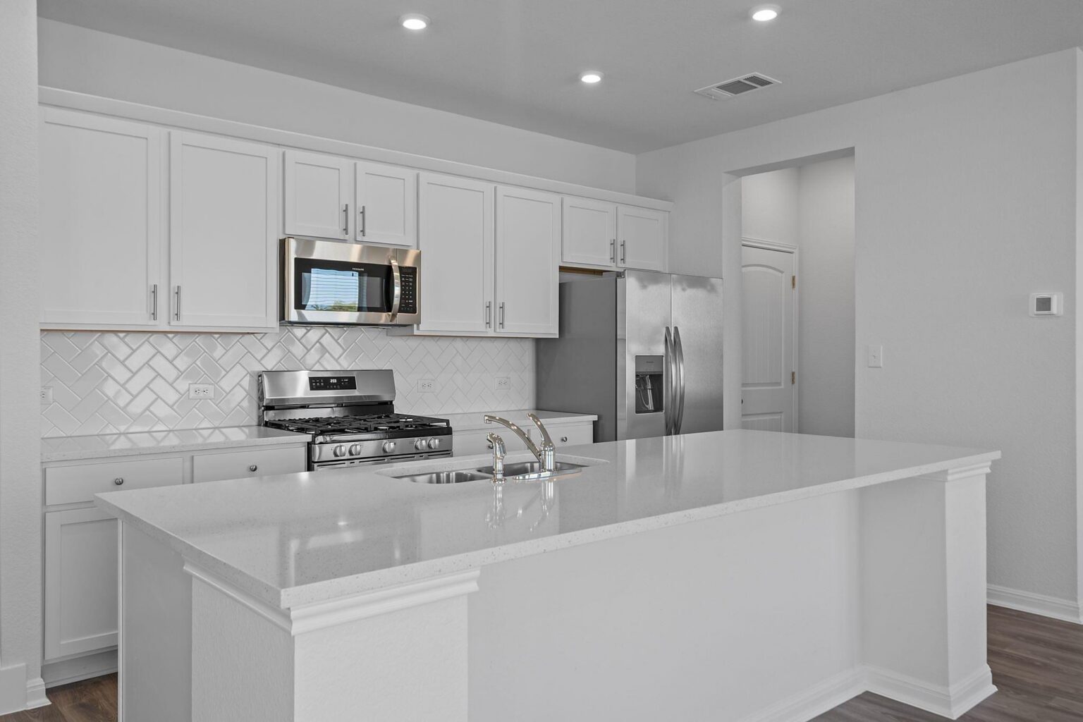 This spacious, 2-story, lock-n-leave, townhome features an open concept floor plan that is great for entertaining. The kitchen boasts of upgraded backsplash, quartz countertops and a large island. LVP floors in downstairs common areas and upgraded tile floors in all bathrooms. Large primary suite with walk-in closet. This home has ample storage, including under-stair storage, covered patio, water softener loop and garage door opener.