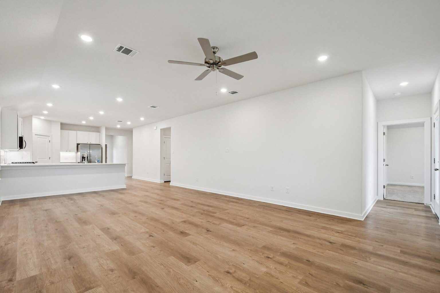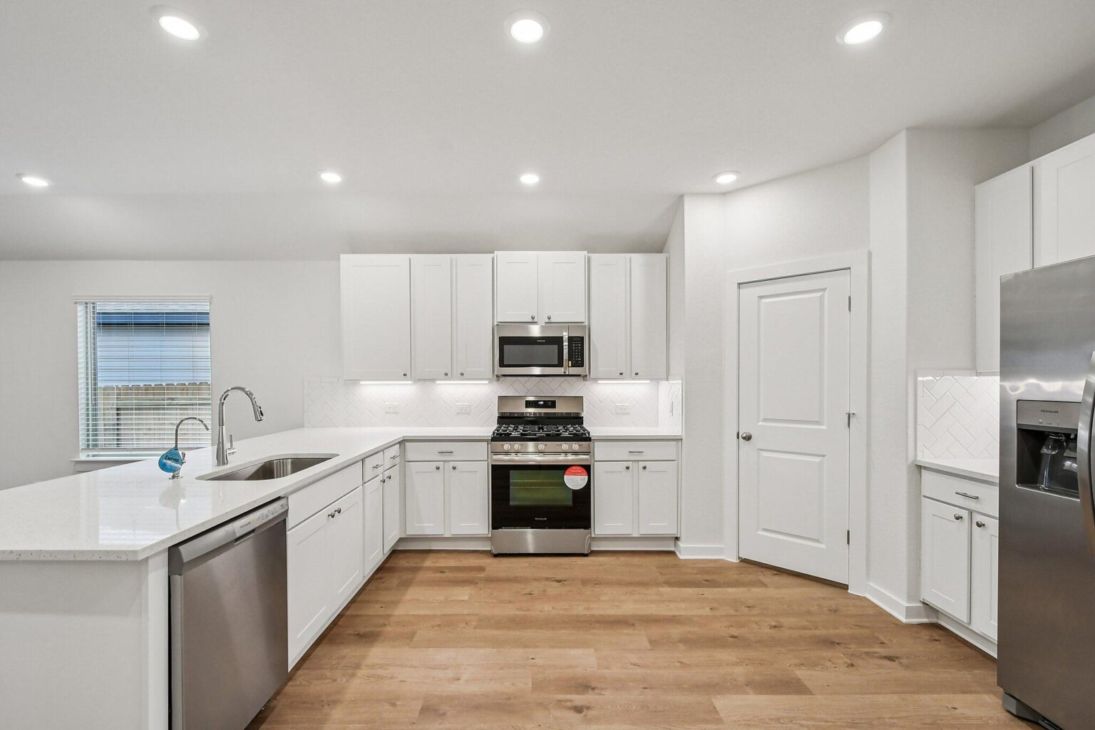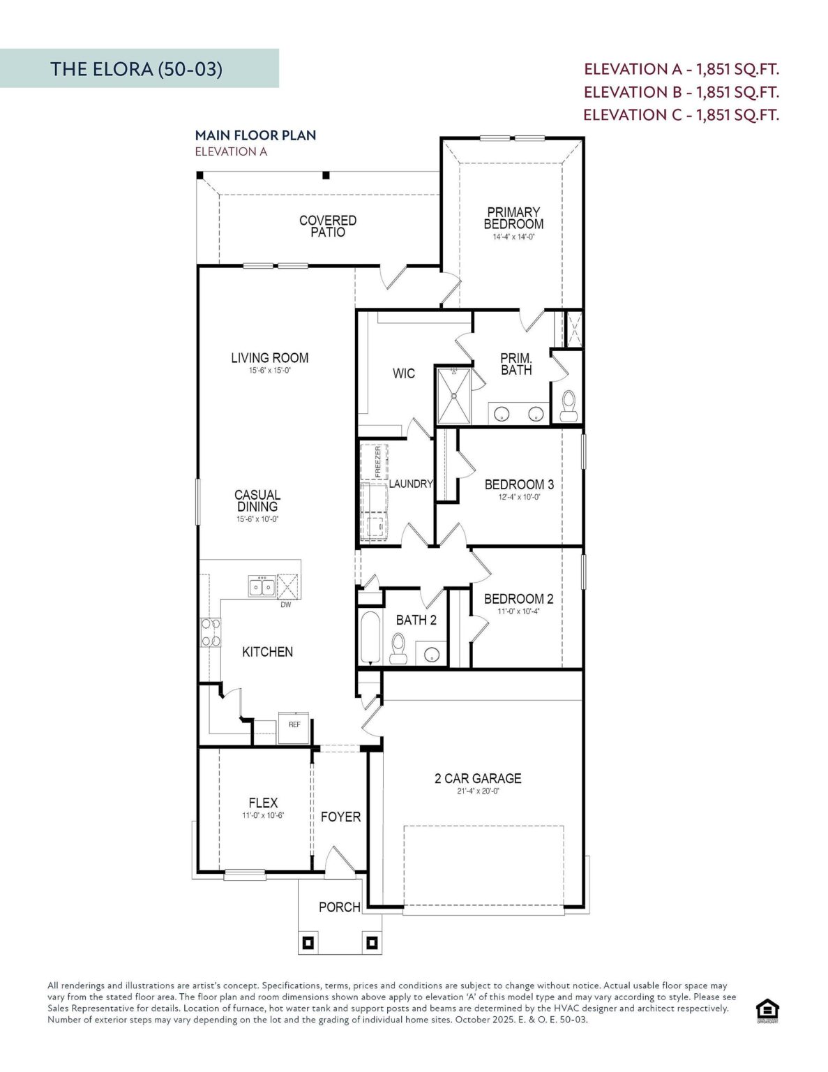 The Elora floorplan is a beautifully crafted single-story home offering 1,851 square feet of flexible, modern living. This three-bedroom, two-bath layout features a bright open-concept living room and casual dining area that seamlessly flow into a designer kitchen, complete with a large island and walk-in pantry. A flex room near the front entry provides the perfect space for a home office, gym, or reading nook. The private primary suite is tucked at the rear of the home and includes a large walk-in closet and spa-style bath with dual vanities and a glass-enclosed tiled shower. Two secondary bedrooms are thoughtfully placed near a full bath, making this layout ideal for families or guests. The covered patio expands the living space outdoors, while a spacious laundry room and two-car garage add daily convenience. Premium finishes like quartz countertops, shaker cabinetry, and Moen® chrome fixtures complement energy-saving upgrades such as a tankless water heater, radiant barrier decking, and a SEER 2 Lennox® HVAC system