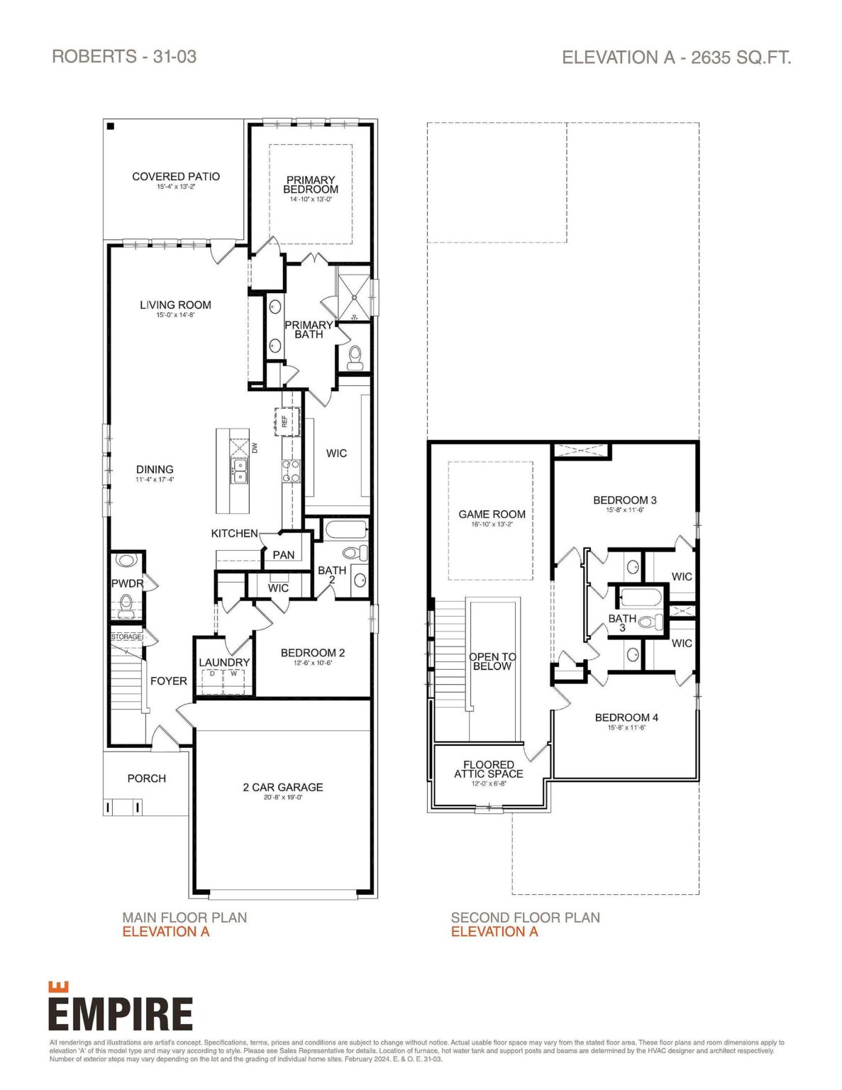 Achieve the lifestyle you’ve been dreaming of in the Roberts floor plan, which features 4 bedrooms, 3.5 bathrooms and a 2-car garage. Whip up your favorite meal in the home’s spacious kitchen, which includes a large island and ample counter space for prep and entertain friends in style in the home’s large dining and great room areas. Relish the privacy your main floor primary retreat will give you and be sure to enjoy the impressive spa-like ensuite and expansive walk-in closet. A secondary bedroom is tucked away on the first floor, complete with a full bathroom and walk-in closet, offering a perfect space for guests. The Roberts floor plan is also ideal for the family who enjoys the outdoors as this floor plan also features a covered patio.