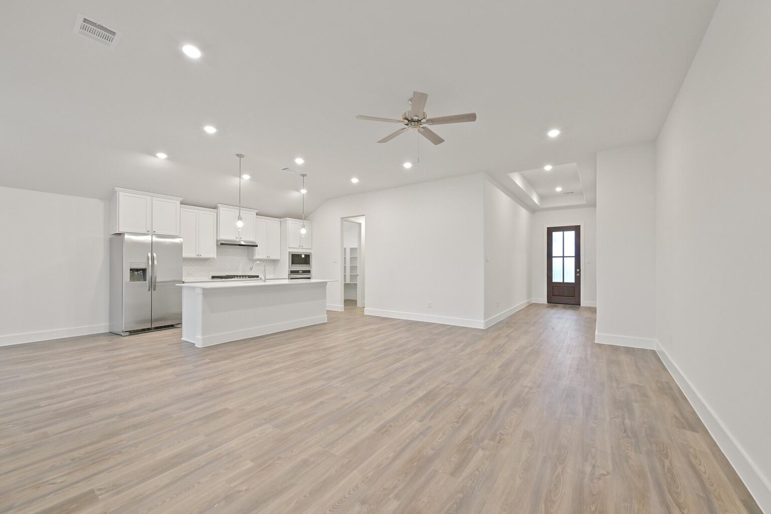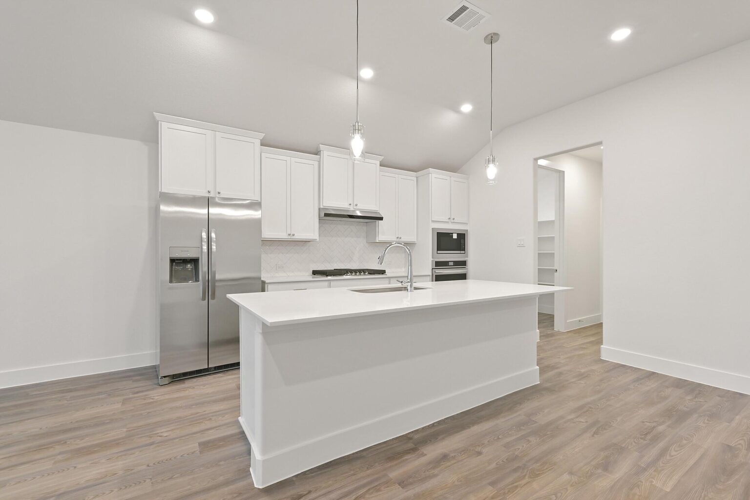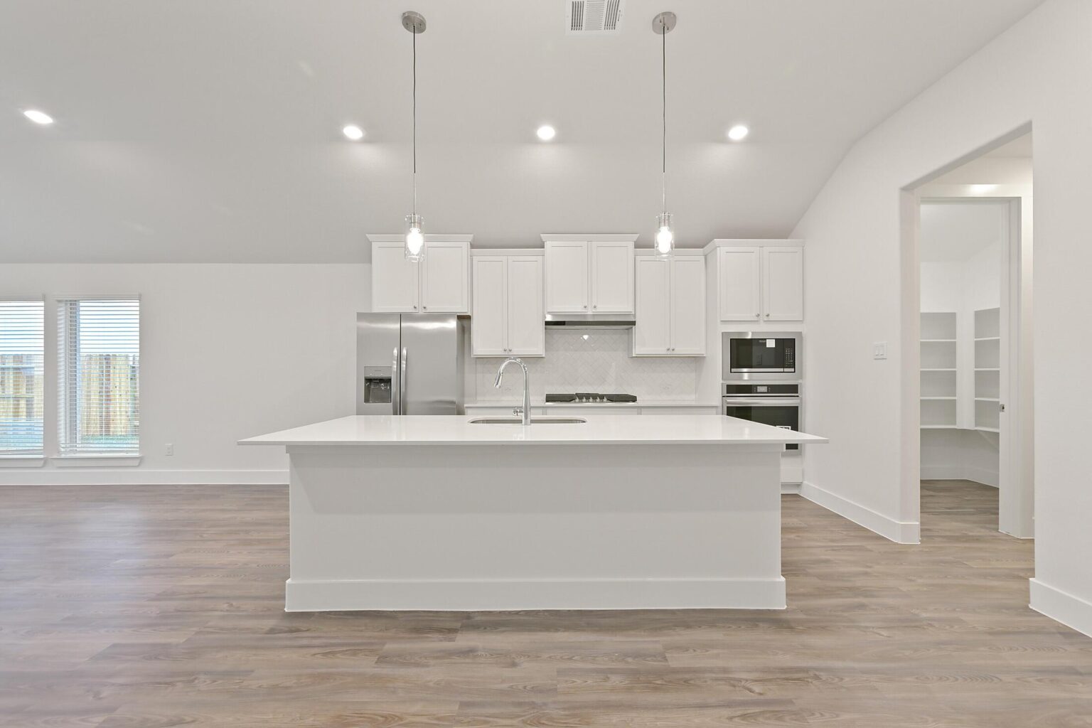 Gated Section! Enjoy every moment spent in this brand-new home with no back neighbors in the Empire River Ranch community, featuring brick and wood exterior, wood-like vinyl and tile flooring, open-concept living, 3 bedrooms, 2 full bathrooms, a masonry fence, covered patio, sprinkler system, and 3-car attached garage. The island kitchen is equipped with quartz countertops, tile backsplash, gas range, stainless steel appliances, breakfast bar, soft closing cabinets and drawers, and walk-in pantry. The serene primary suite is complete with a walk-in closet, double sinks, and oversized shower. This Energy Star qualified home boasts Energy Star appliances, a reflective roof, high-efficiency HVAC, insulated windows, attic vents, and more! Community amenities include a crystal lagoon, cabanas, swim-up bar, and walking trails. Located off US 90 and N Hwy 146, residents are near dining & shopping in central Dayton and Liberty. Zoned to Dayton ISD.