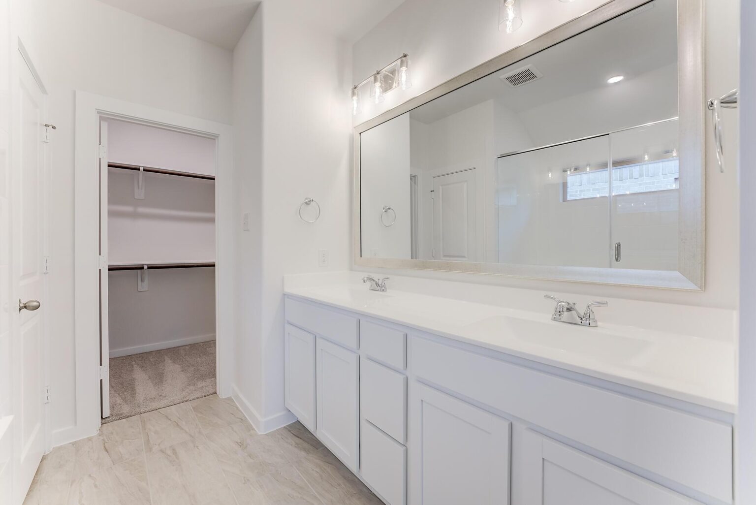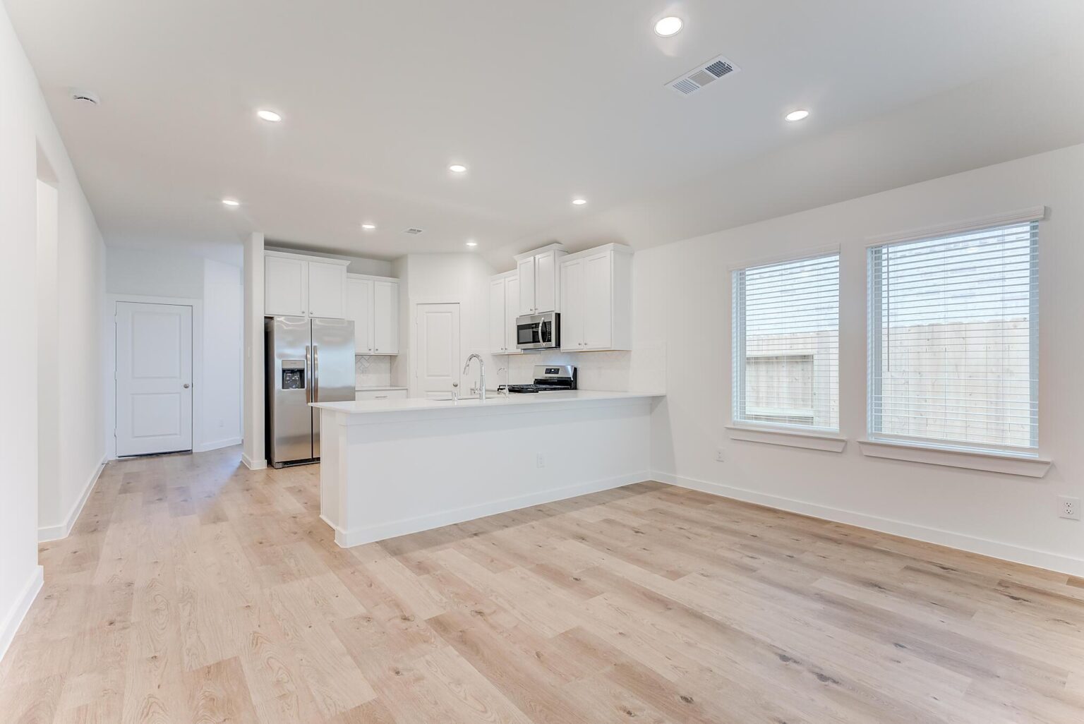 The Kendall is a well-designed one-story home with 3 bedrooms, 2 full bathrooms, and 1,527 square feet of living space. The foyer leads to an open-concept kitchen, casual dining area, and living room, perfect for gatherings. A covered patio extends from the living room, offering an ideal spot for outdoor relaxation. The primary bedroom, located at the back of the home, features a walk-in closet and an en-suite bathroom with dual vanities. Two additional bedrooms are situated near the front, sharing a full bathroom.
